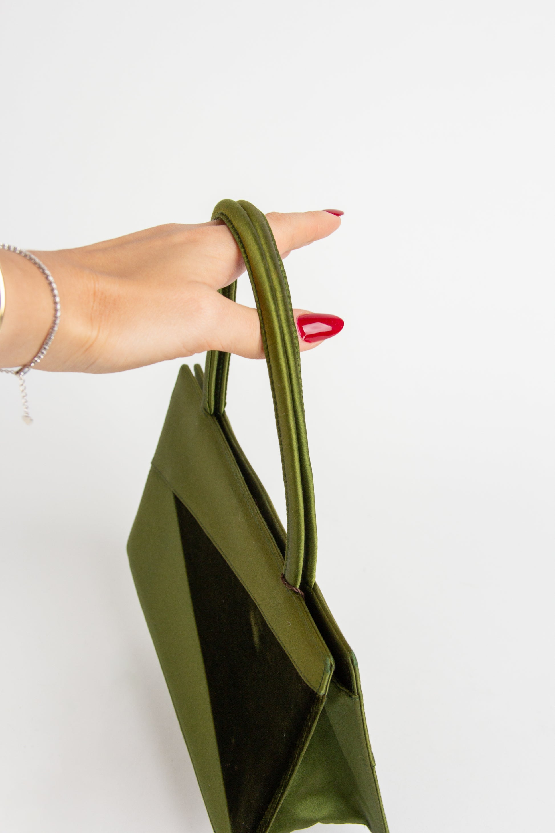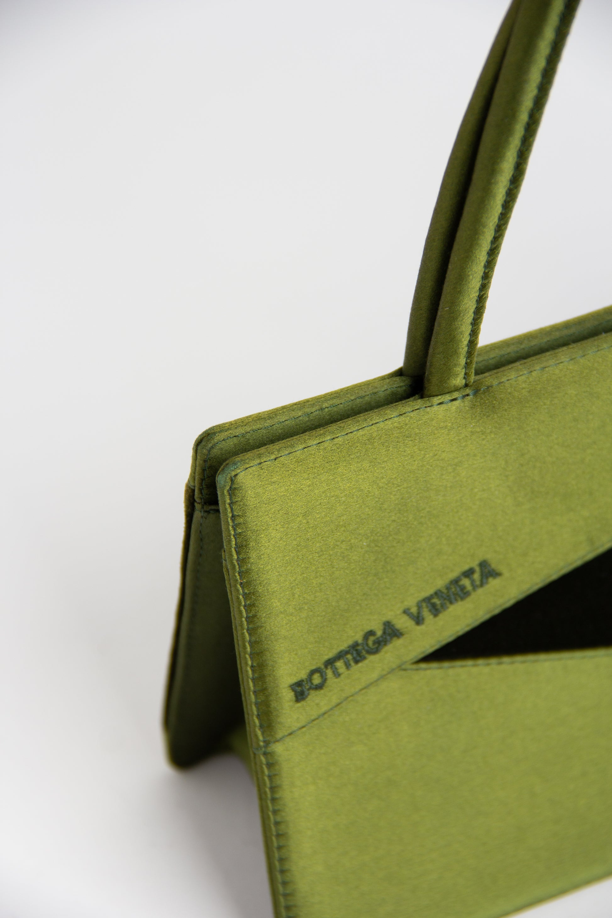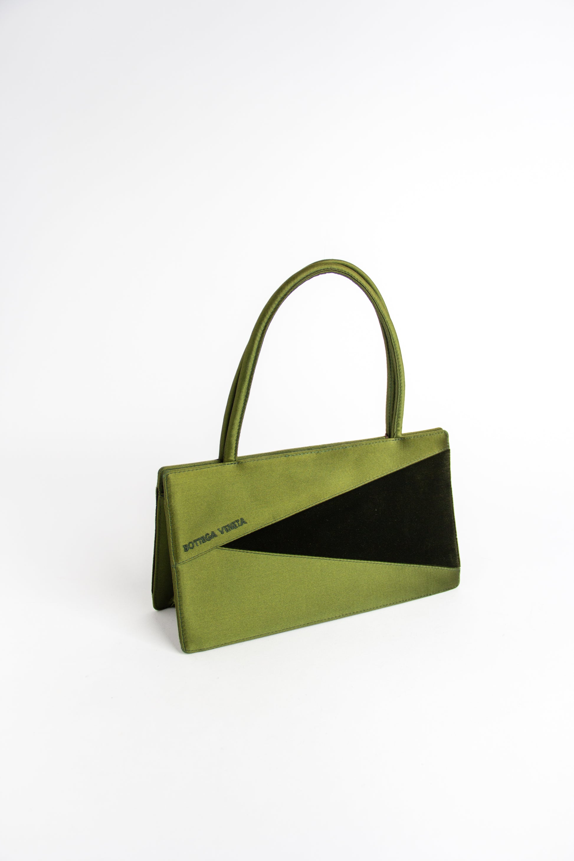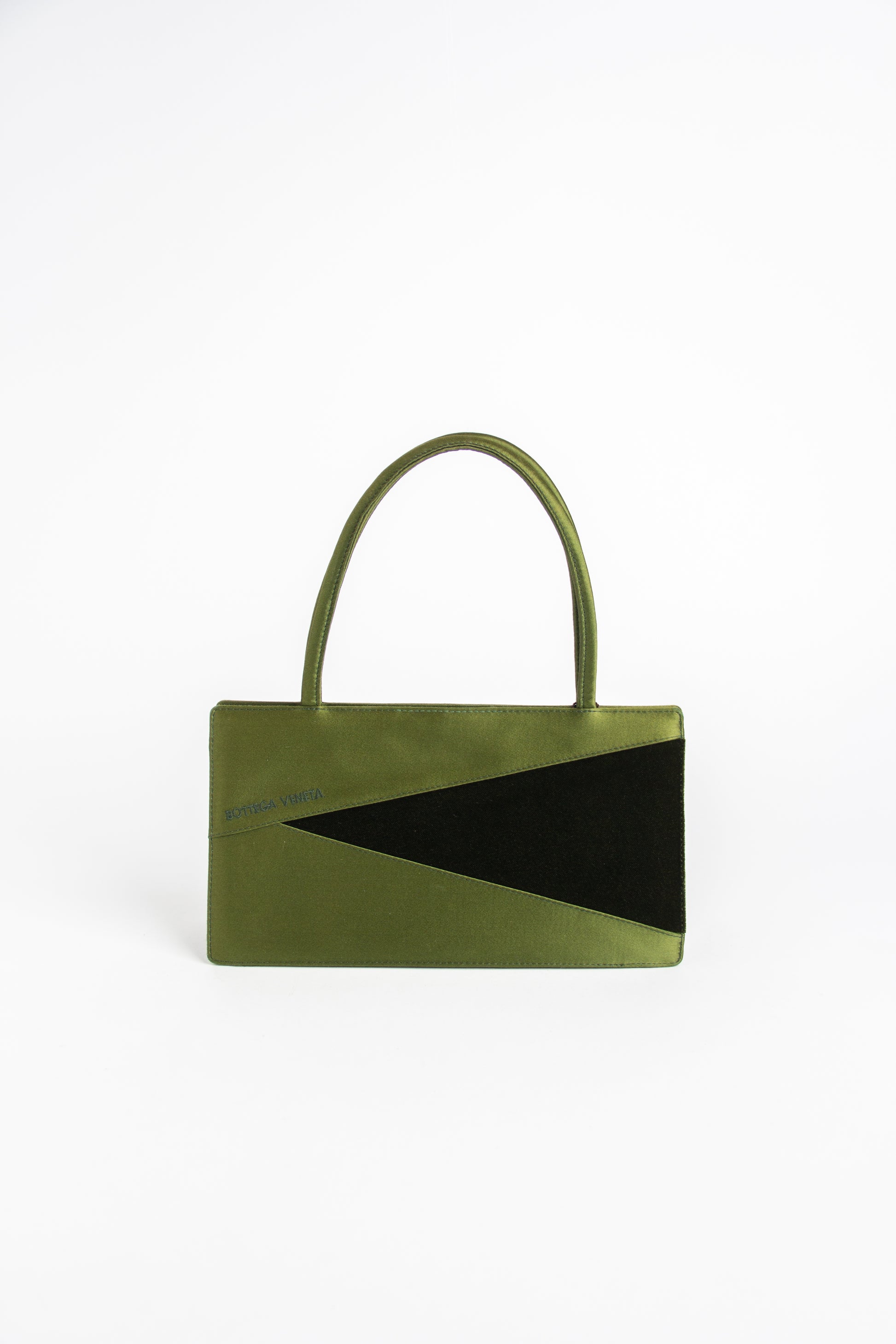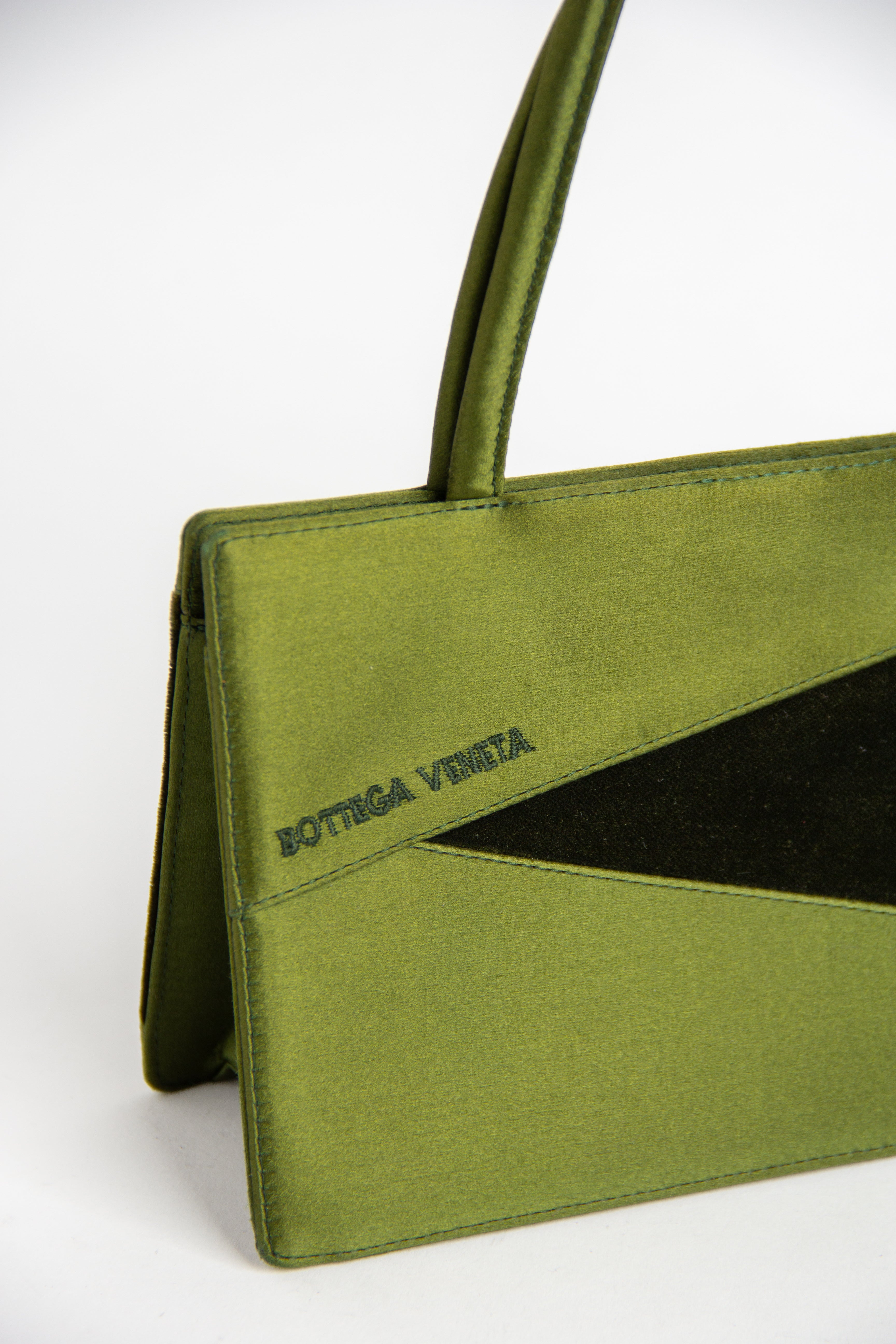 Chic, statement Bottega Veneta satin bag in a beautiful green color with velvet triangle accents on the front and bac...