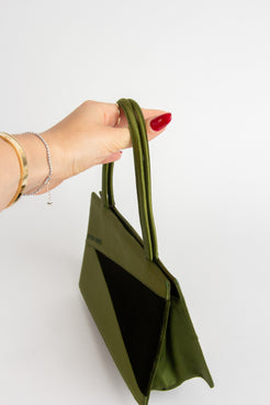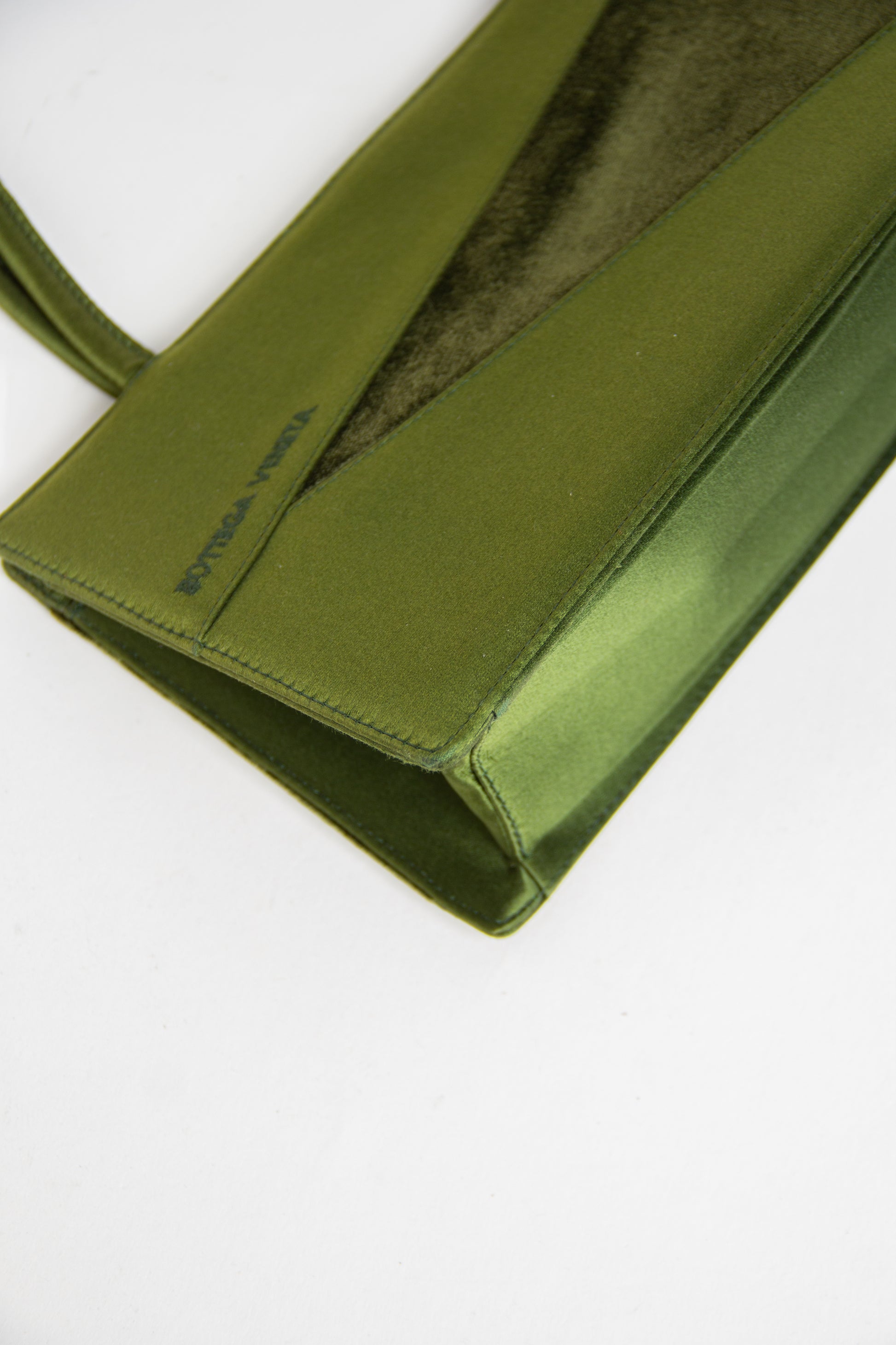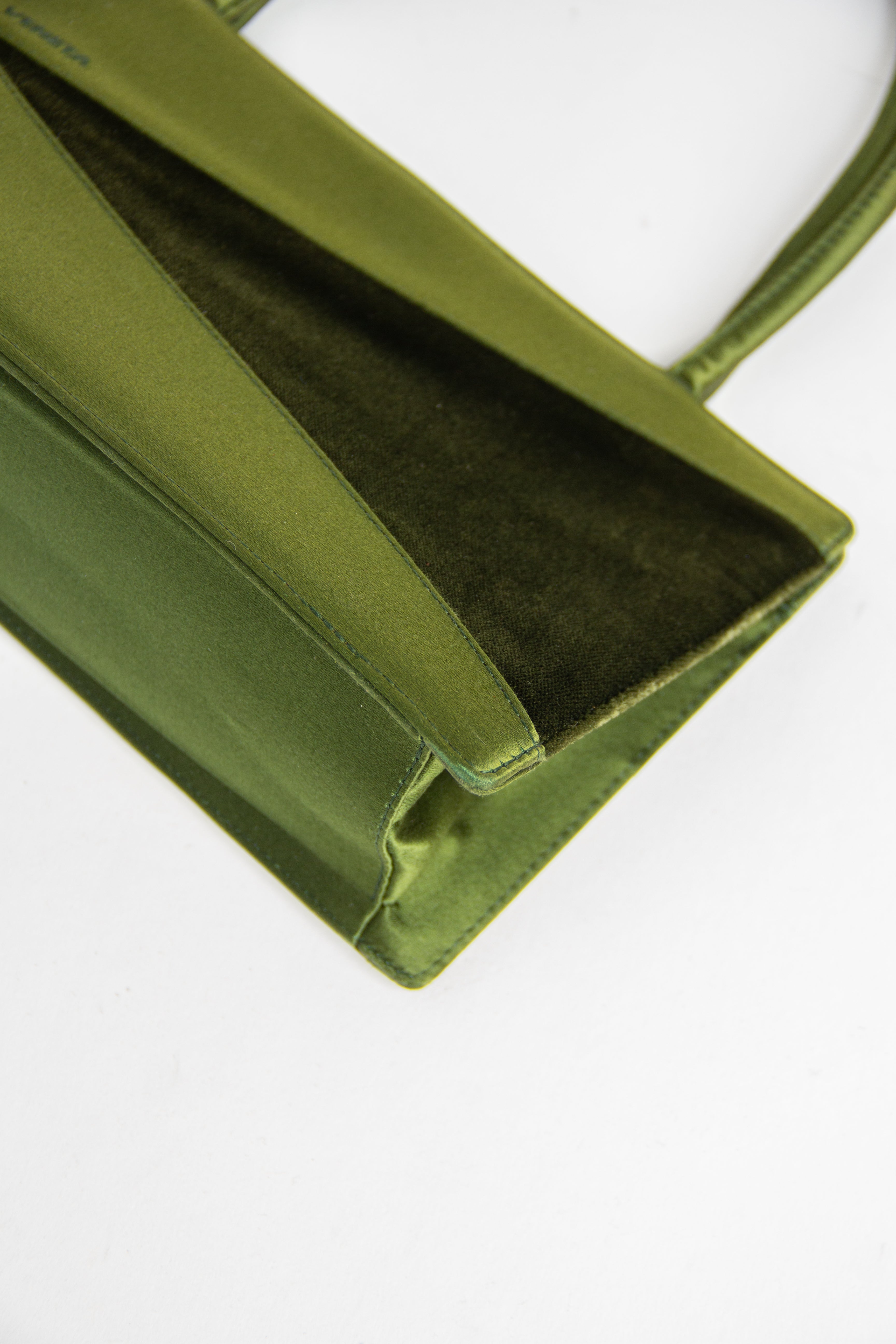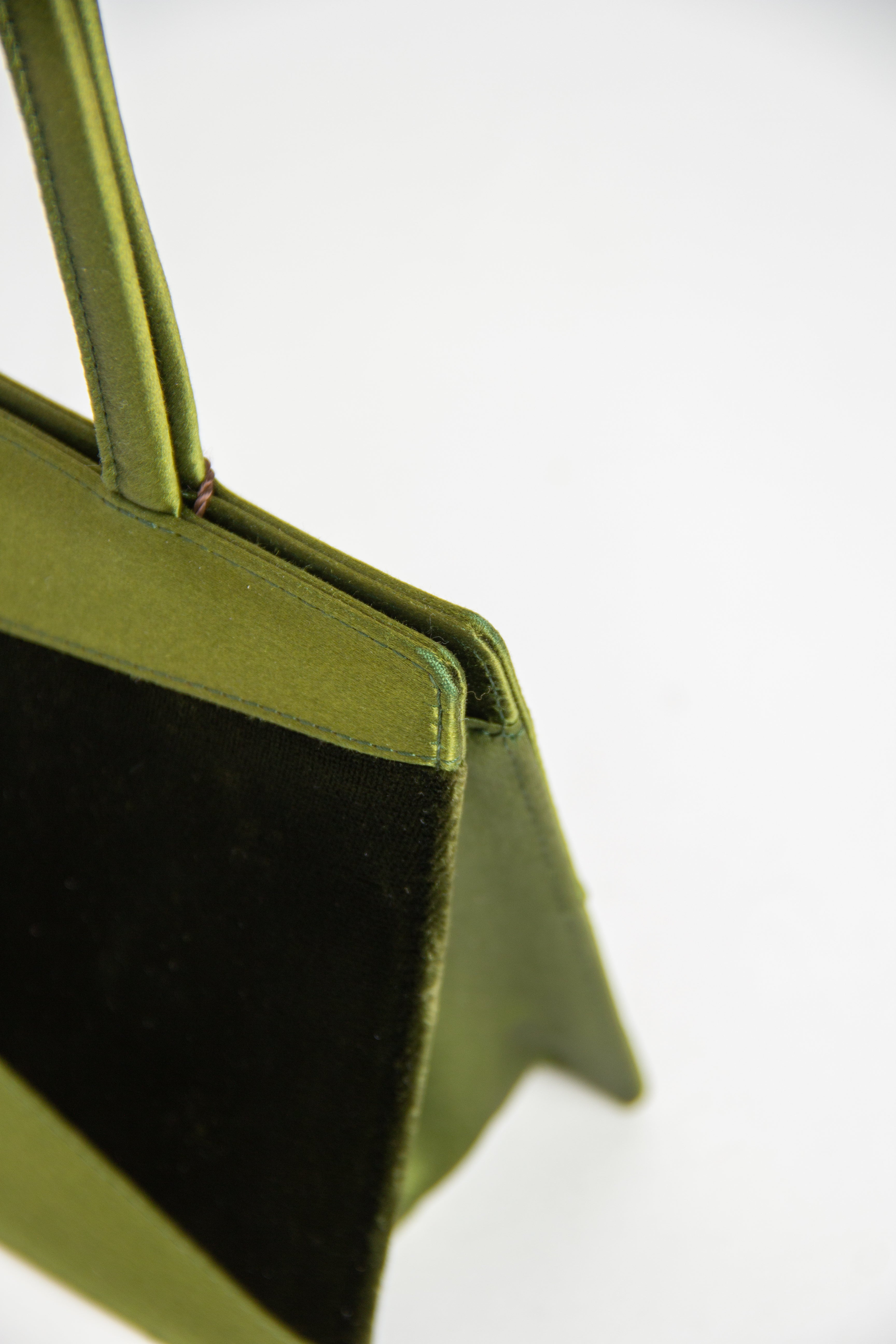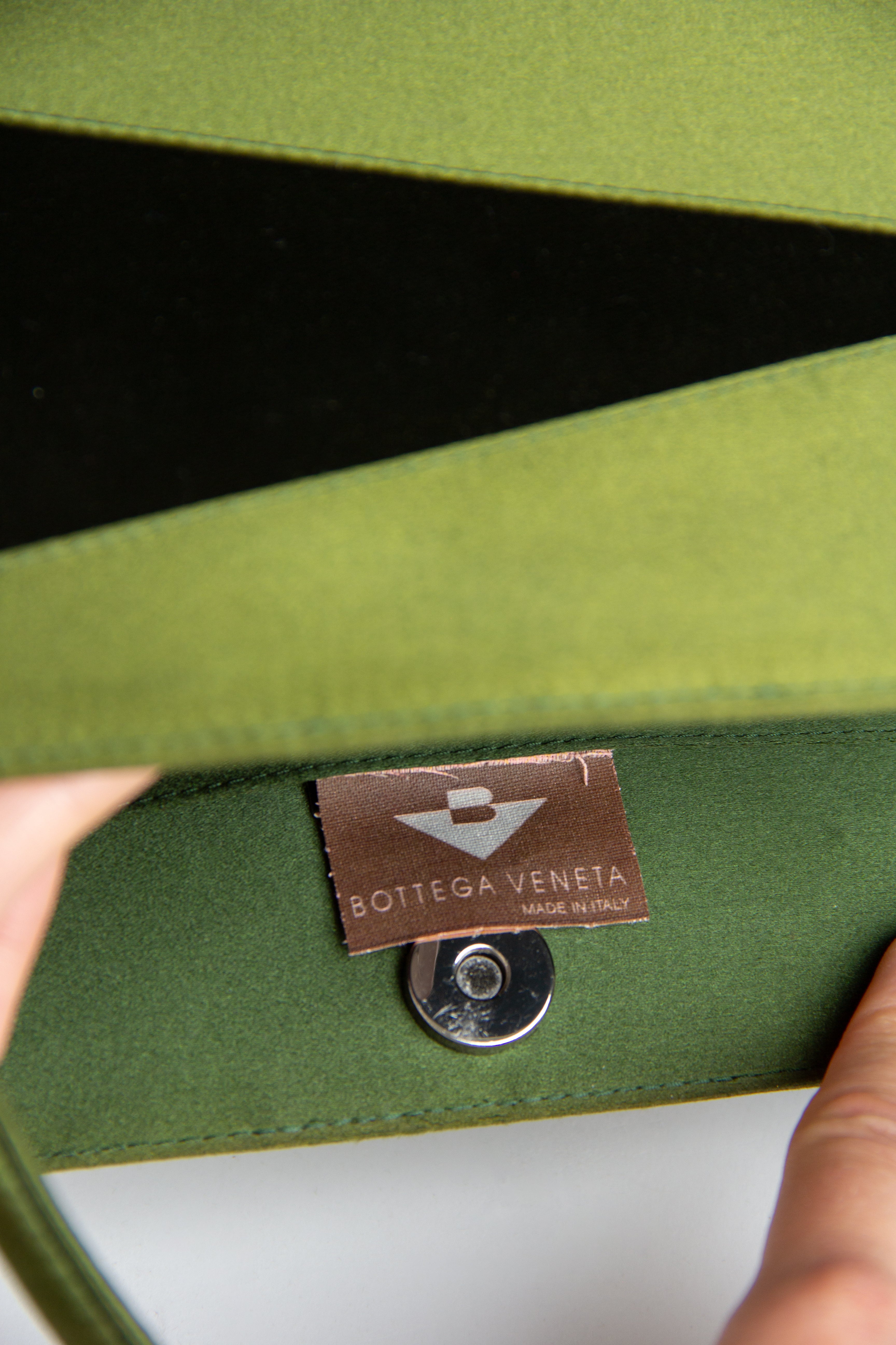 Chic, statement Bottega Veneta satin bag in a beautiful green color with velvet triangle accents on the front and bac...