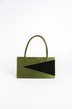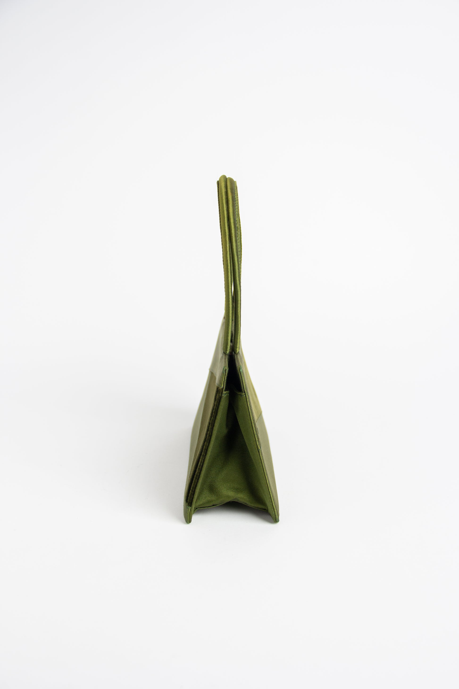 Chic, statement Bottega Veneta satin bag in a beautiful green color with velvet triangle accents on the front and back. Magnetic enclosure style.