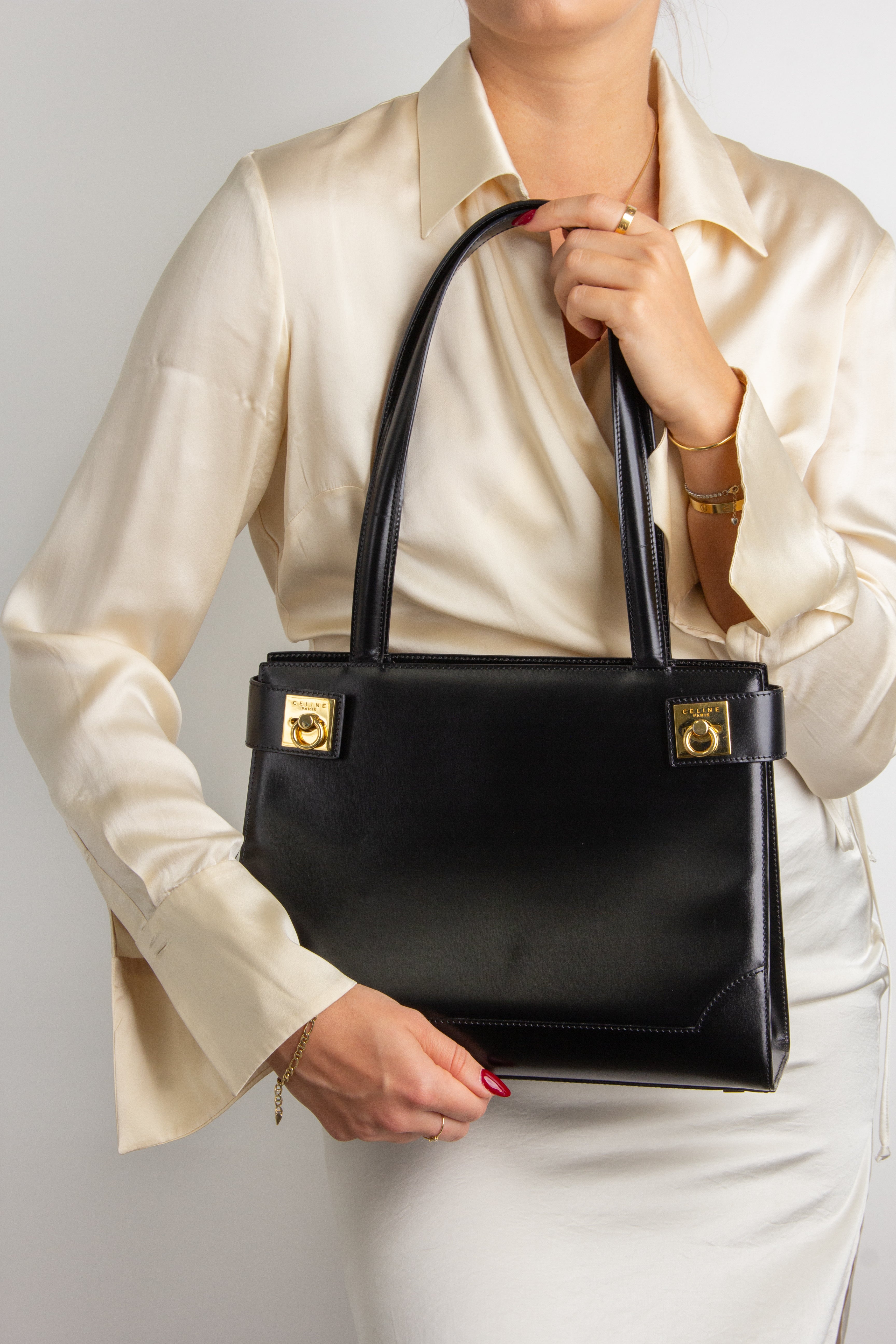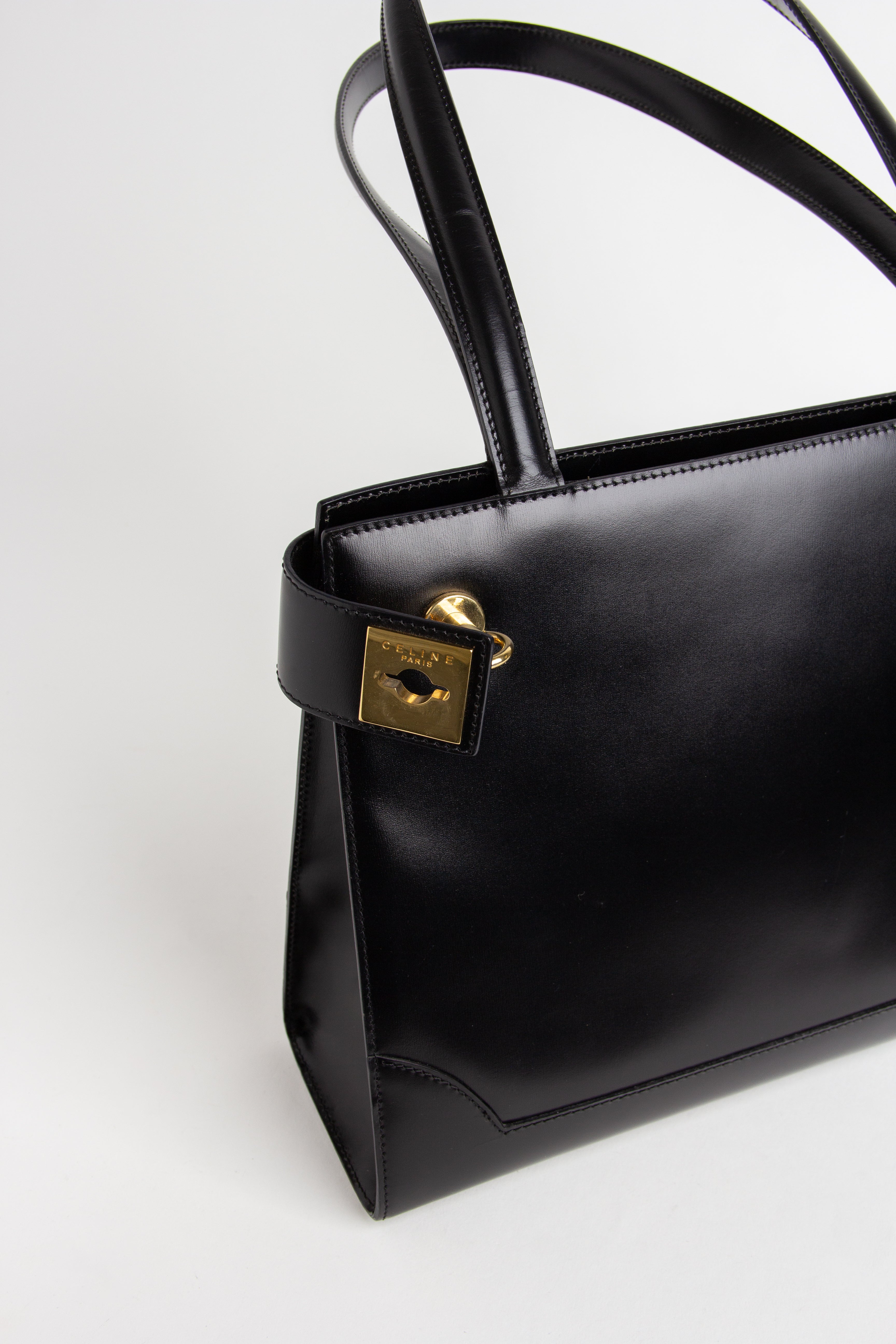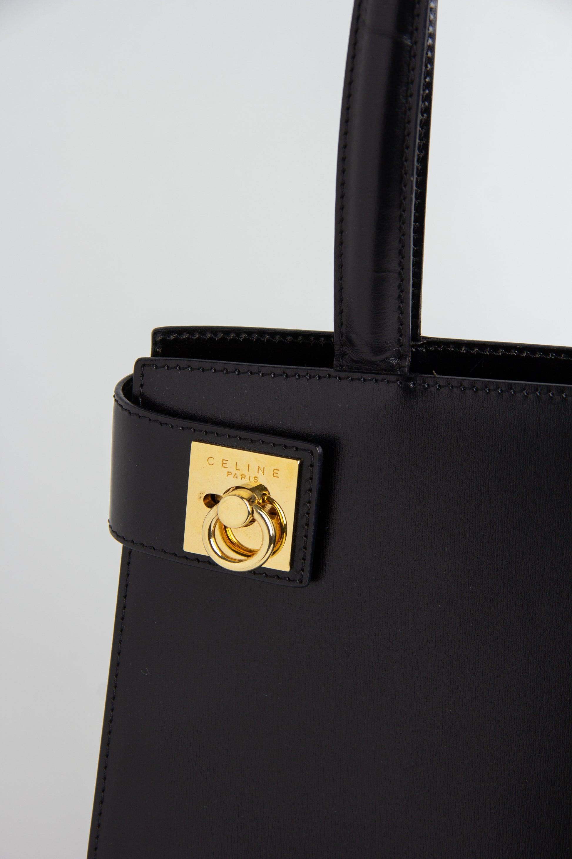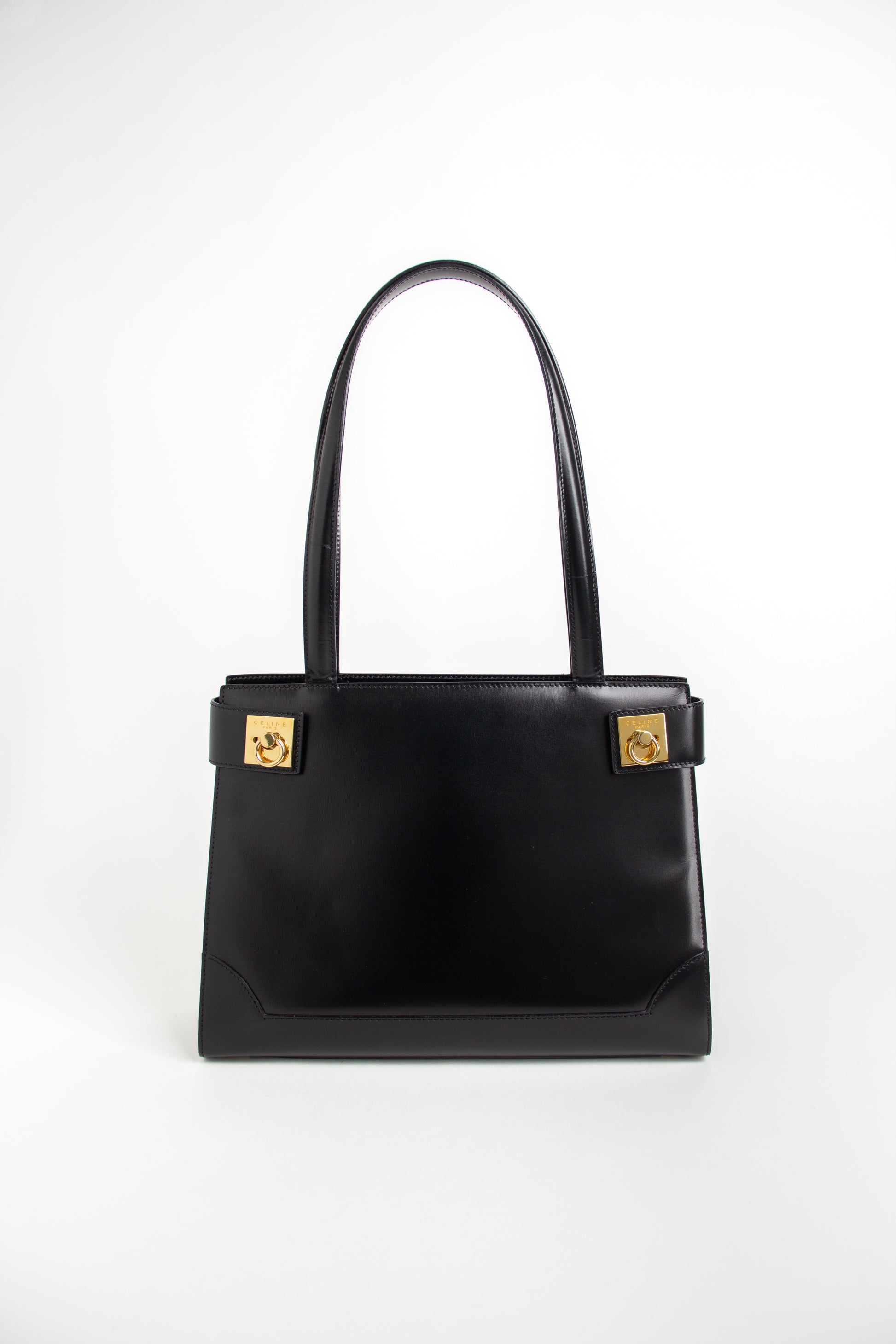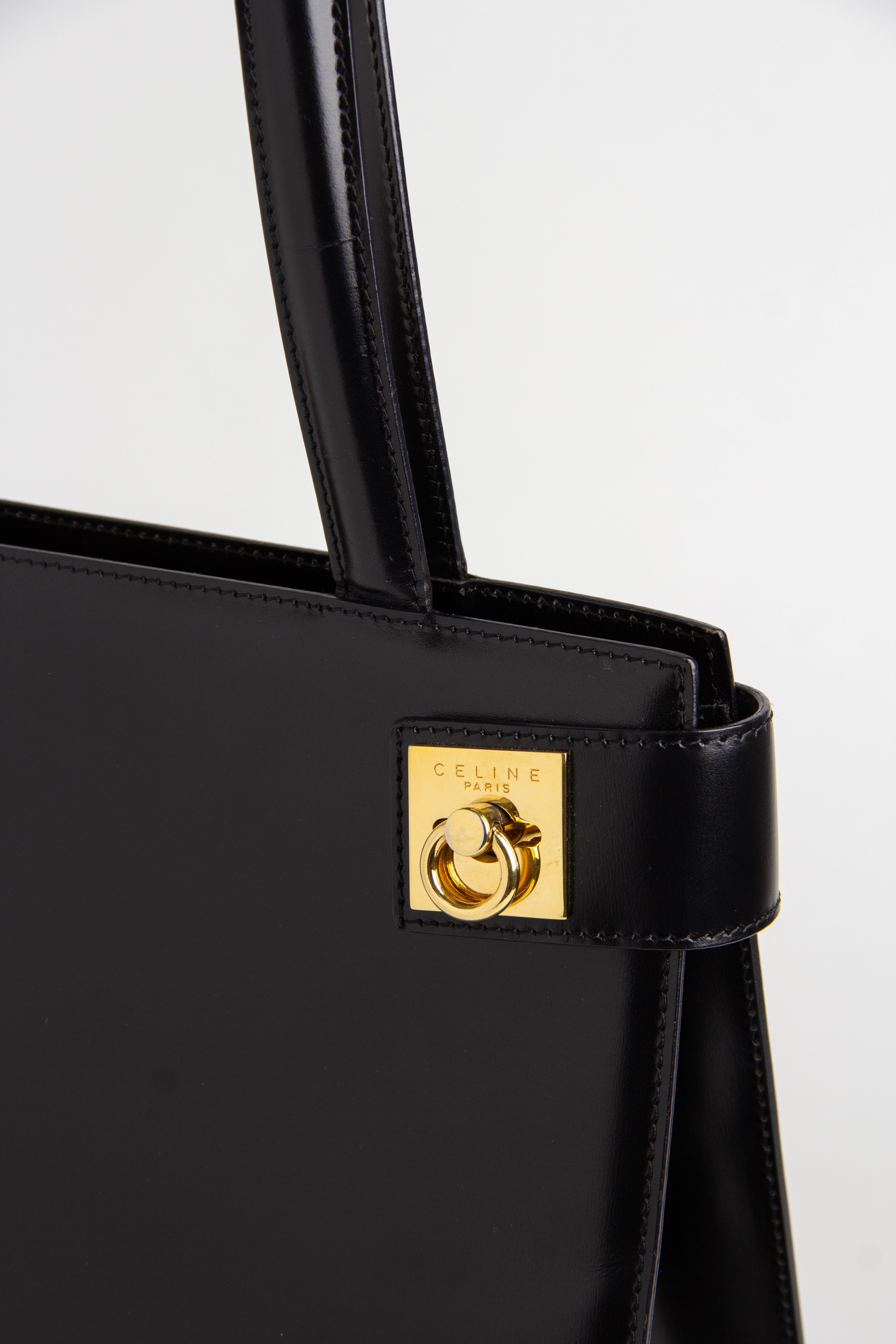 Incredible, elegant black Celine shoulder bag with gold Gancini detailing on the sides. Unclasp the Gancini hardware ...