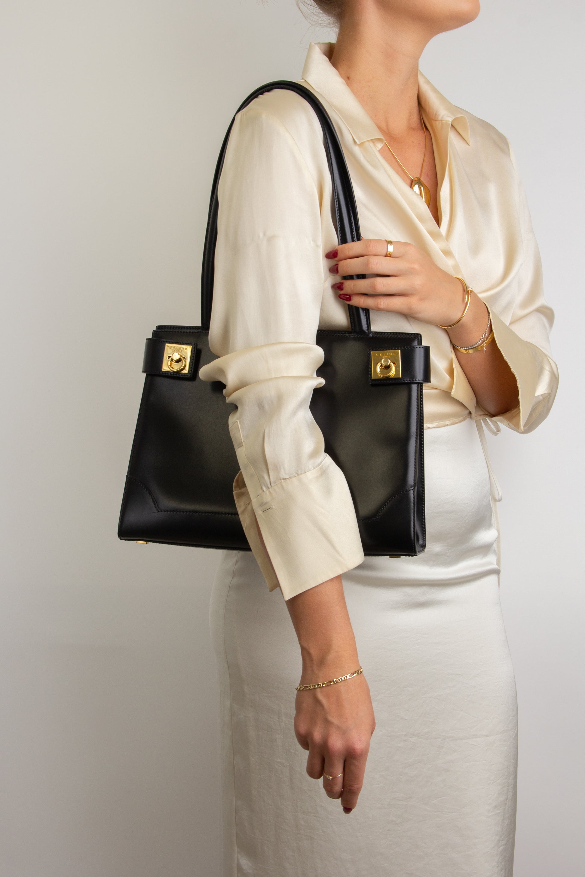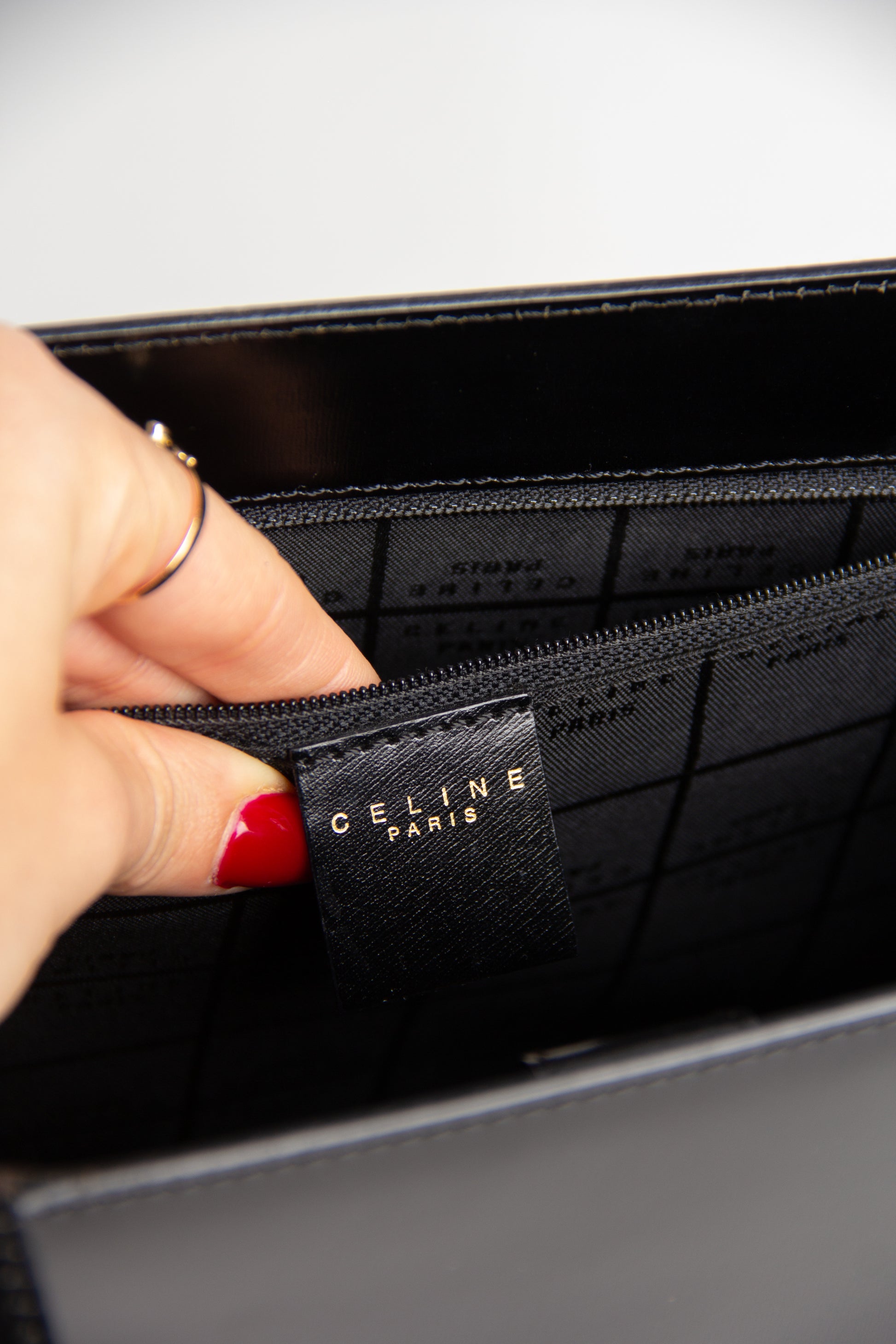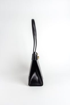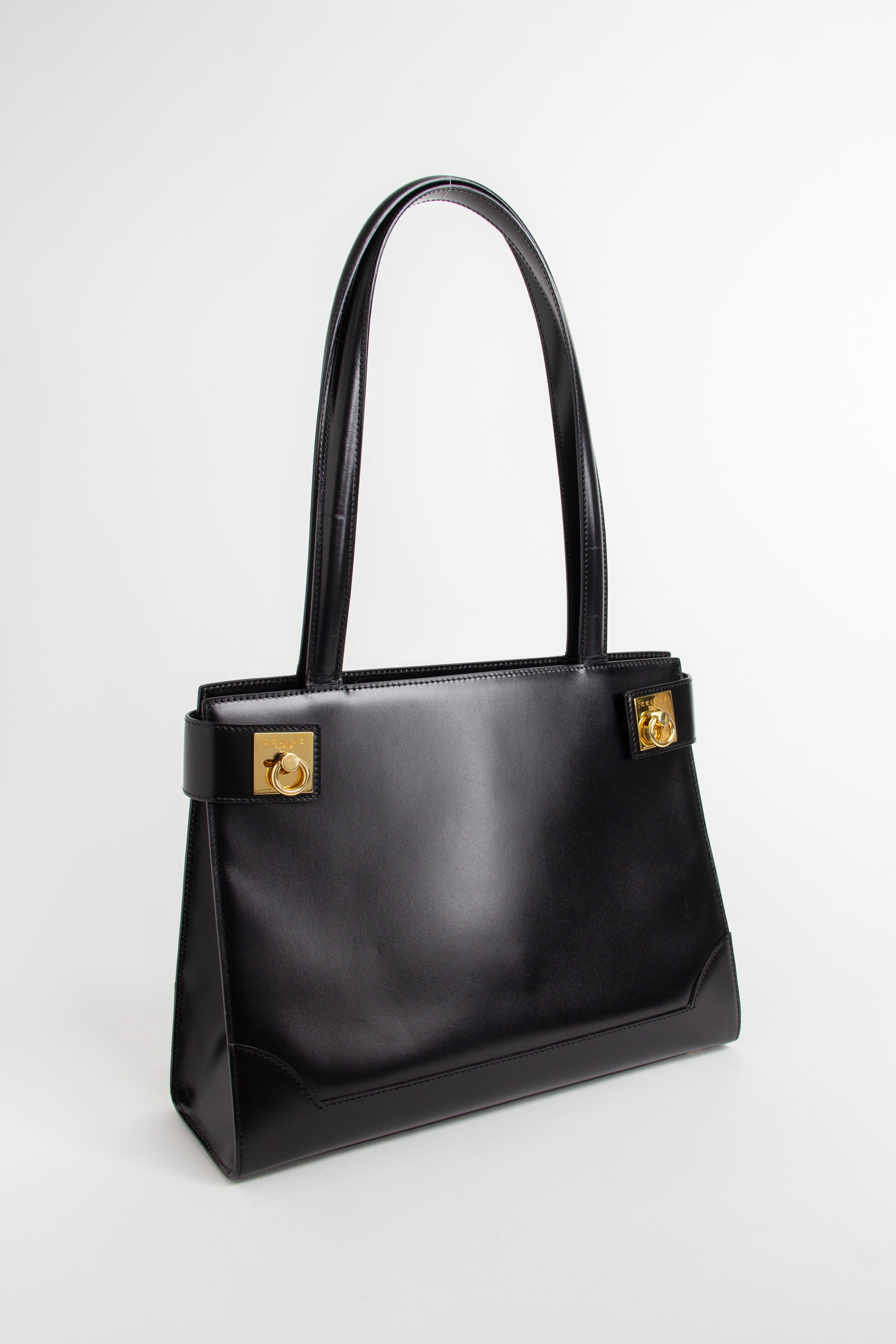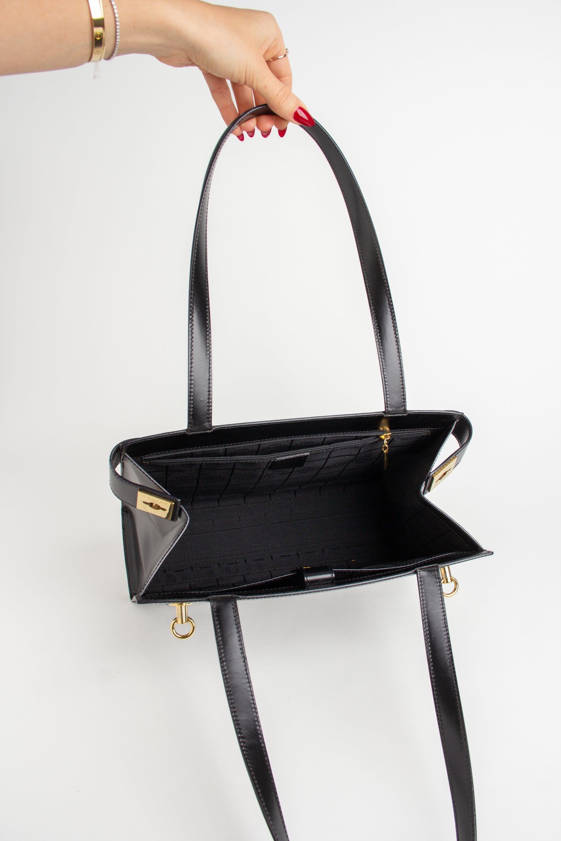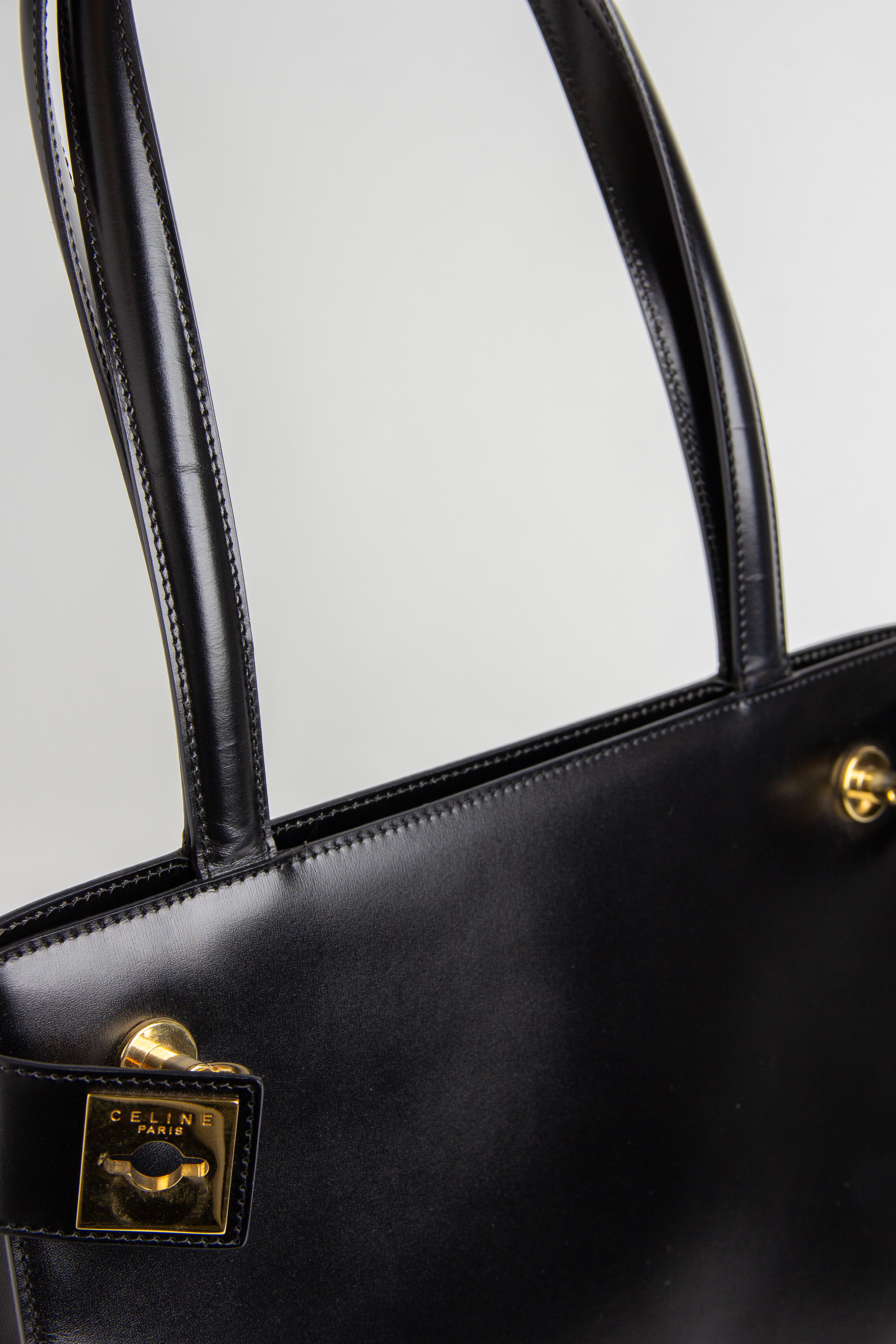 Incredible, elegant black Celine shoulder bag with gold Gancini detailing on the sides. Unclasp the Gancini hardware ...