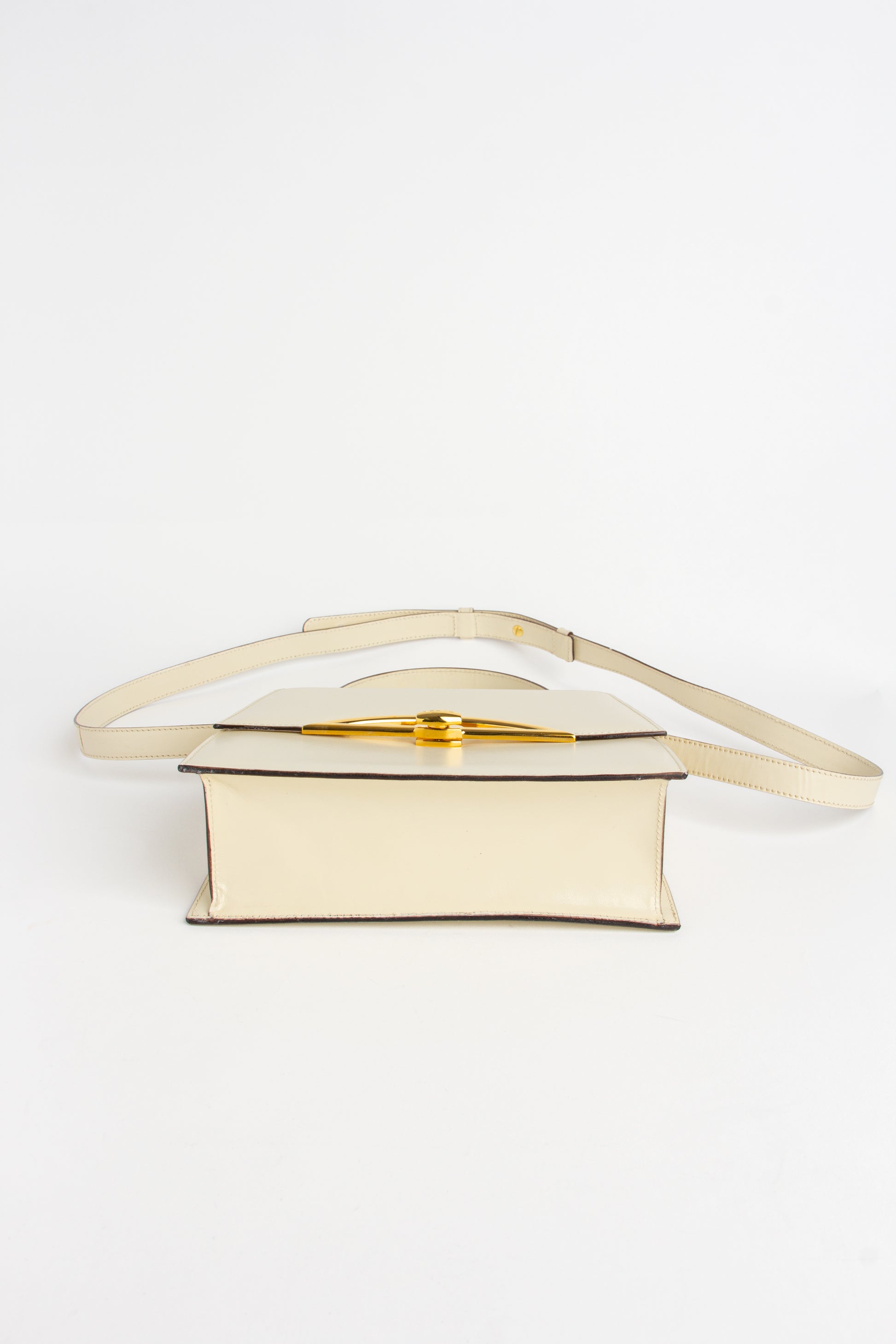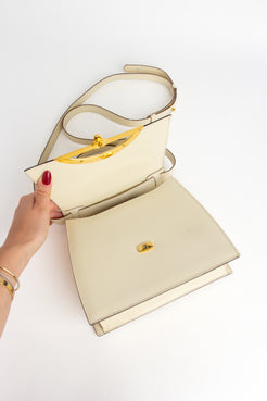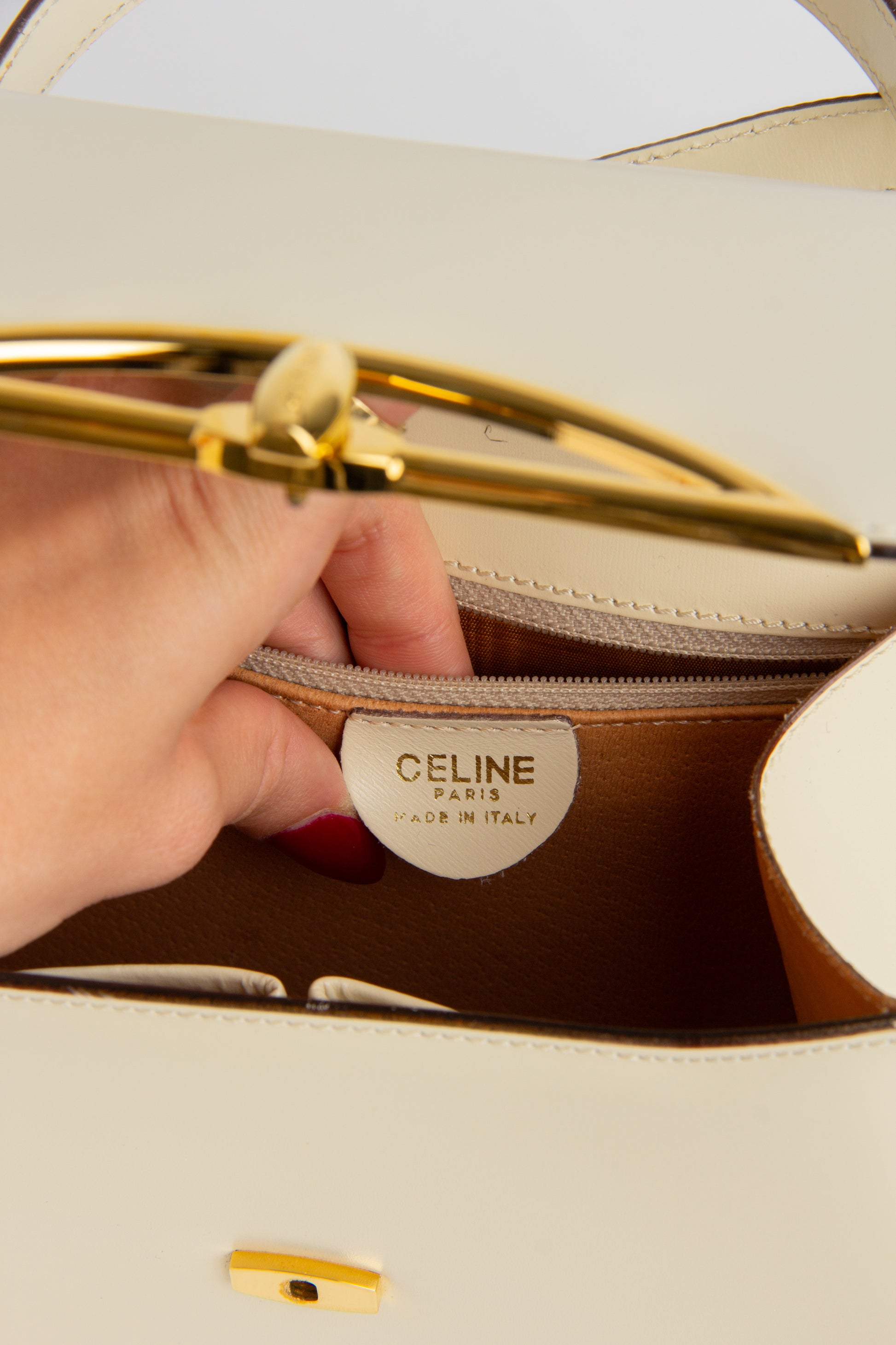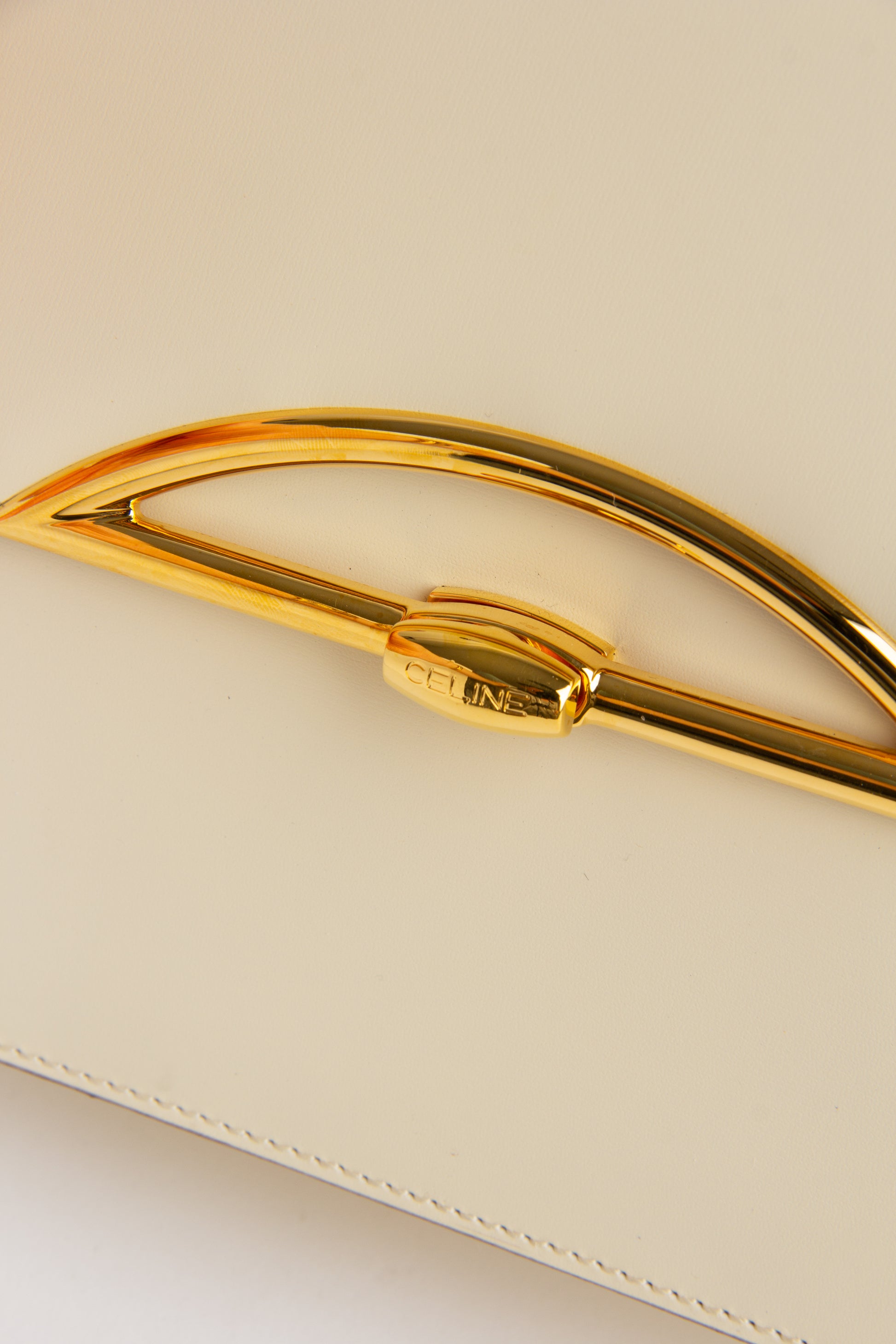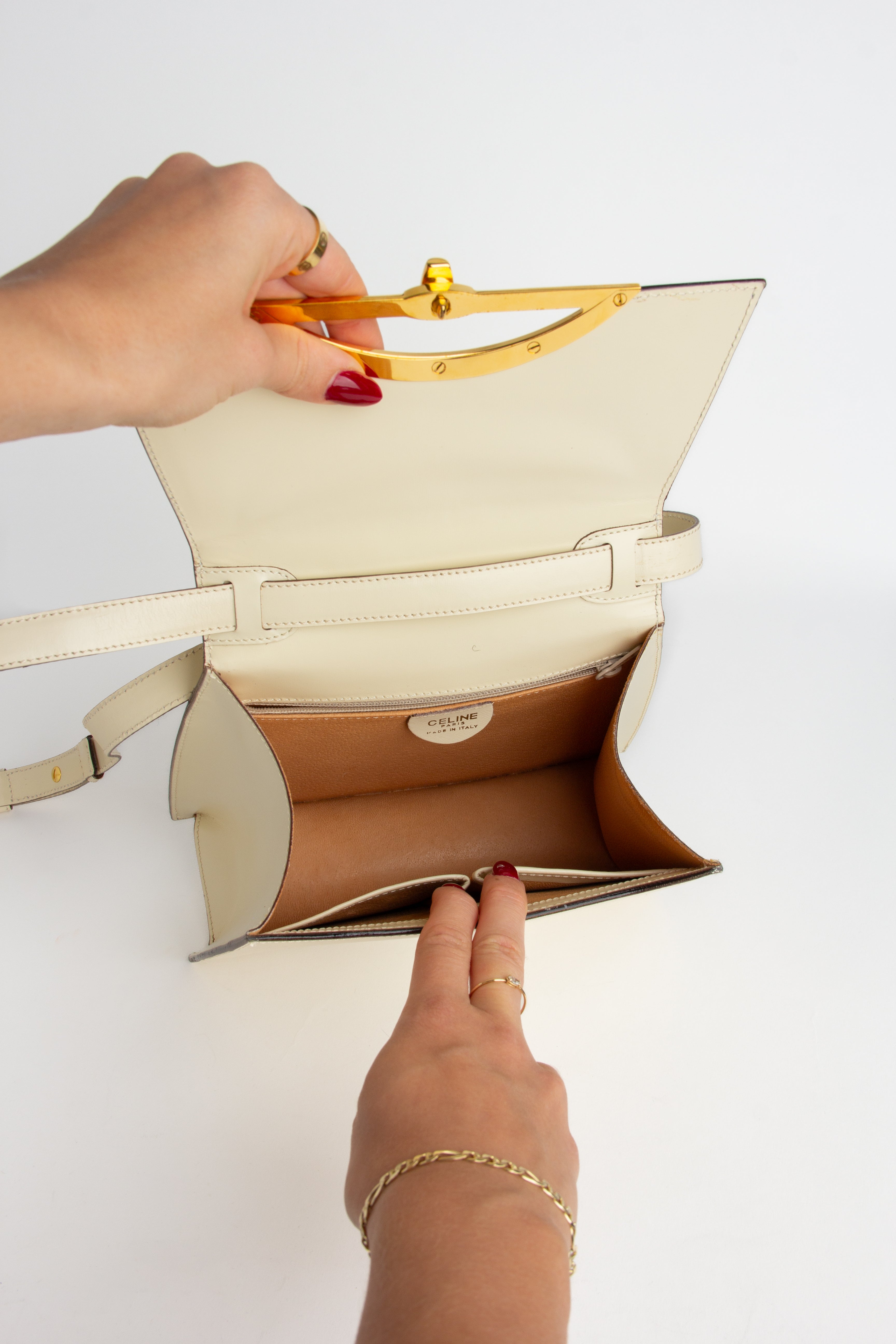 Adorable, elegant little cream Celine bag with gold hardware and a turnlock closure. Can be worn as a handbag or crossbody.