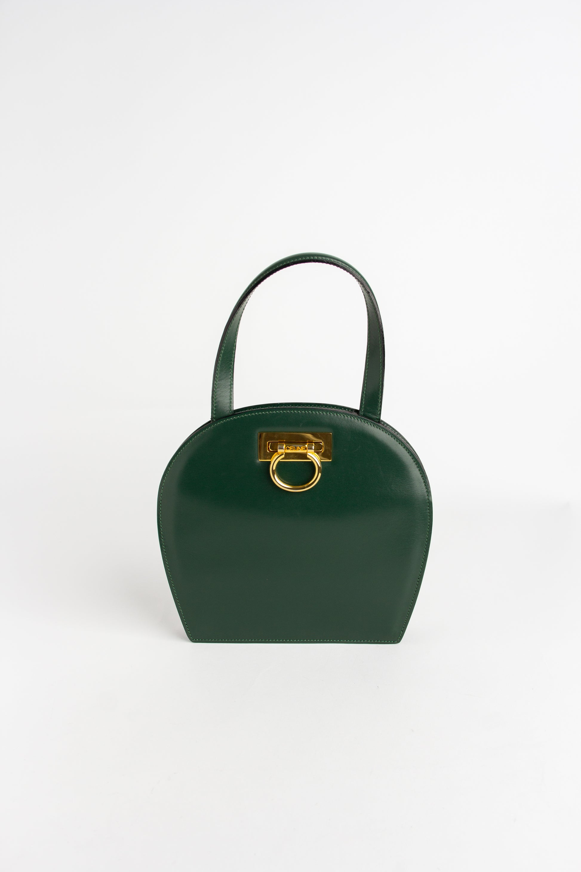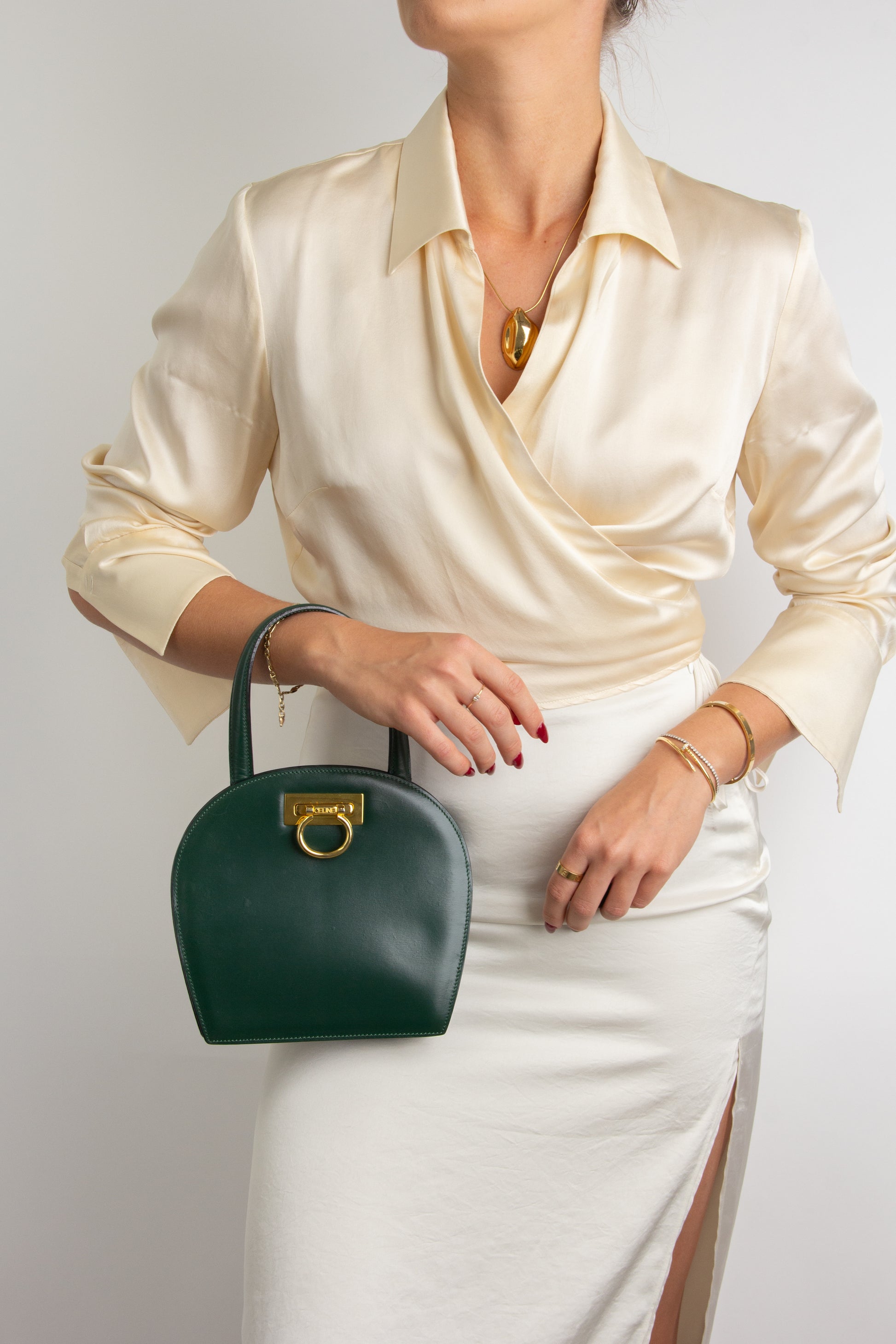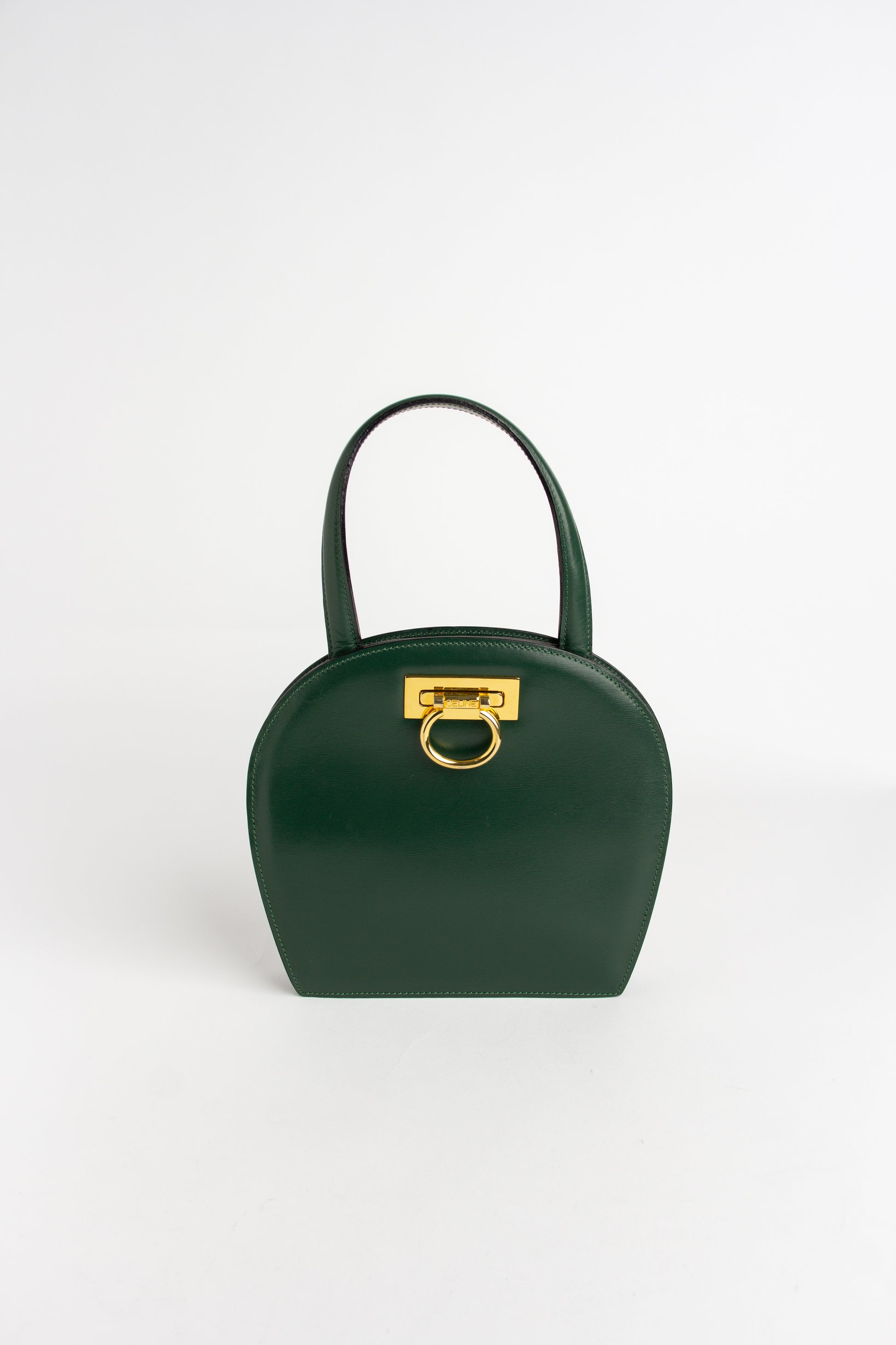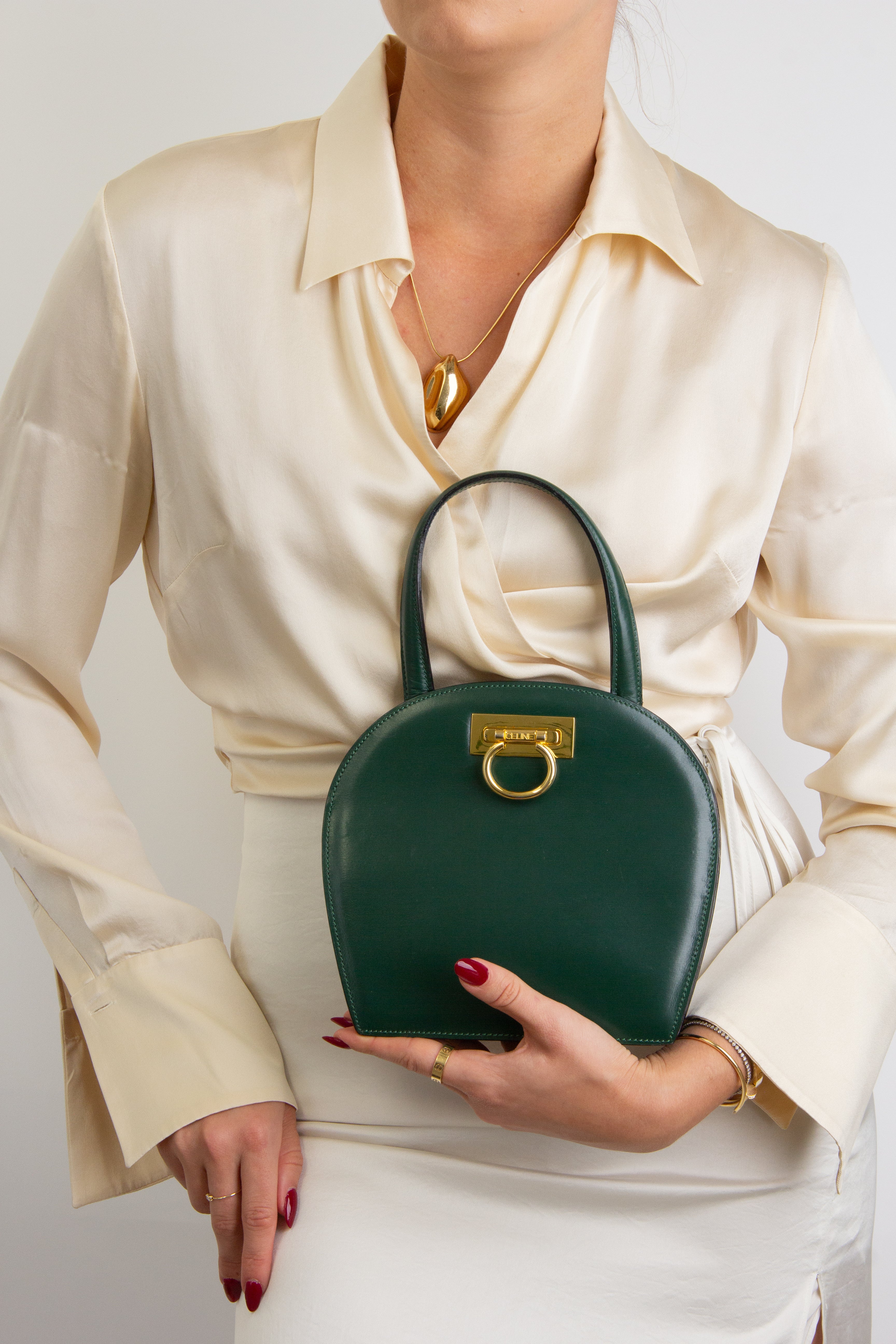 Unique and adorable vintage Celine mini bag in a rare dark green color. Gold Gancini closures on both sides. A beautiful color to pair with fall / winter looks.