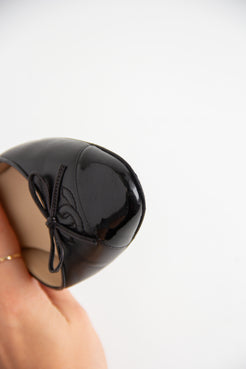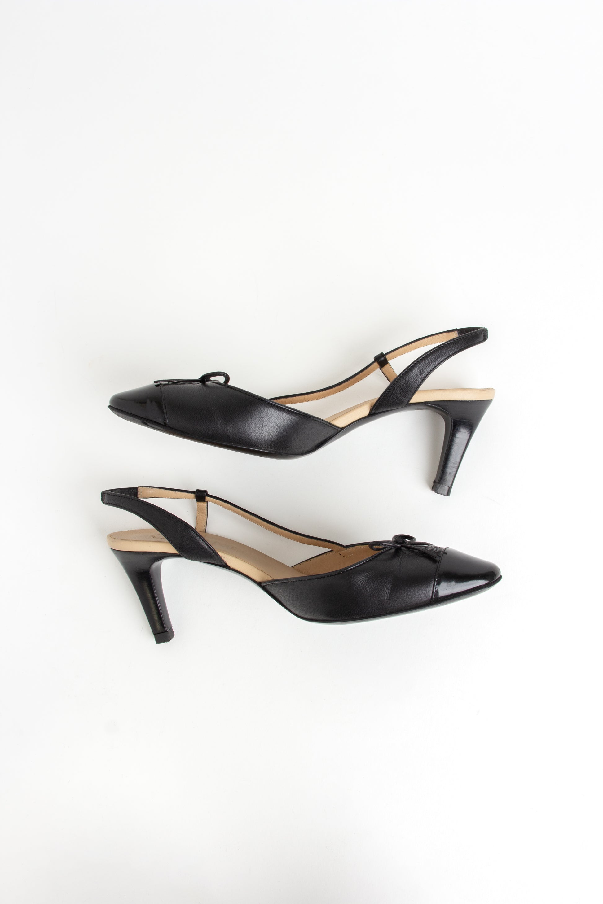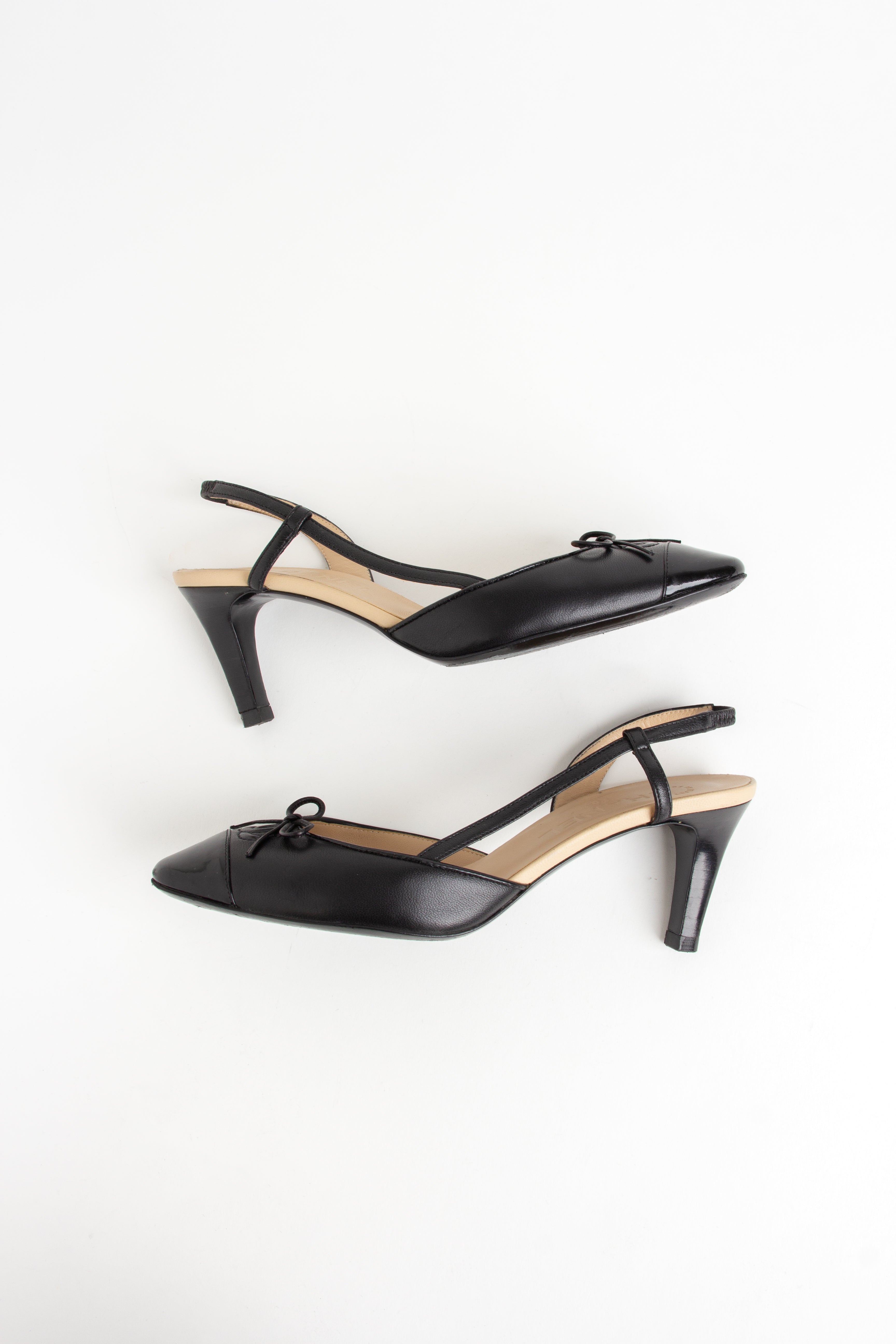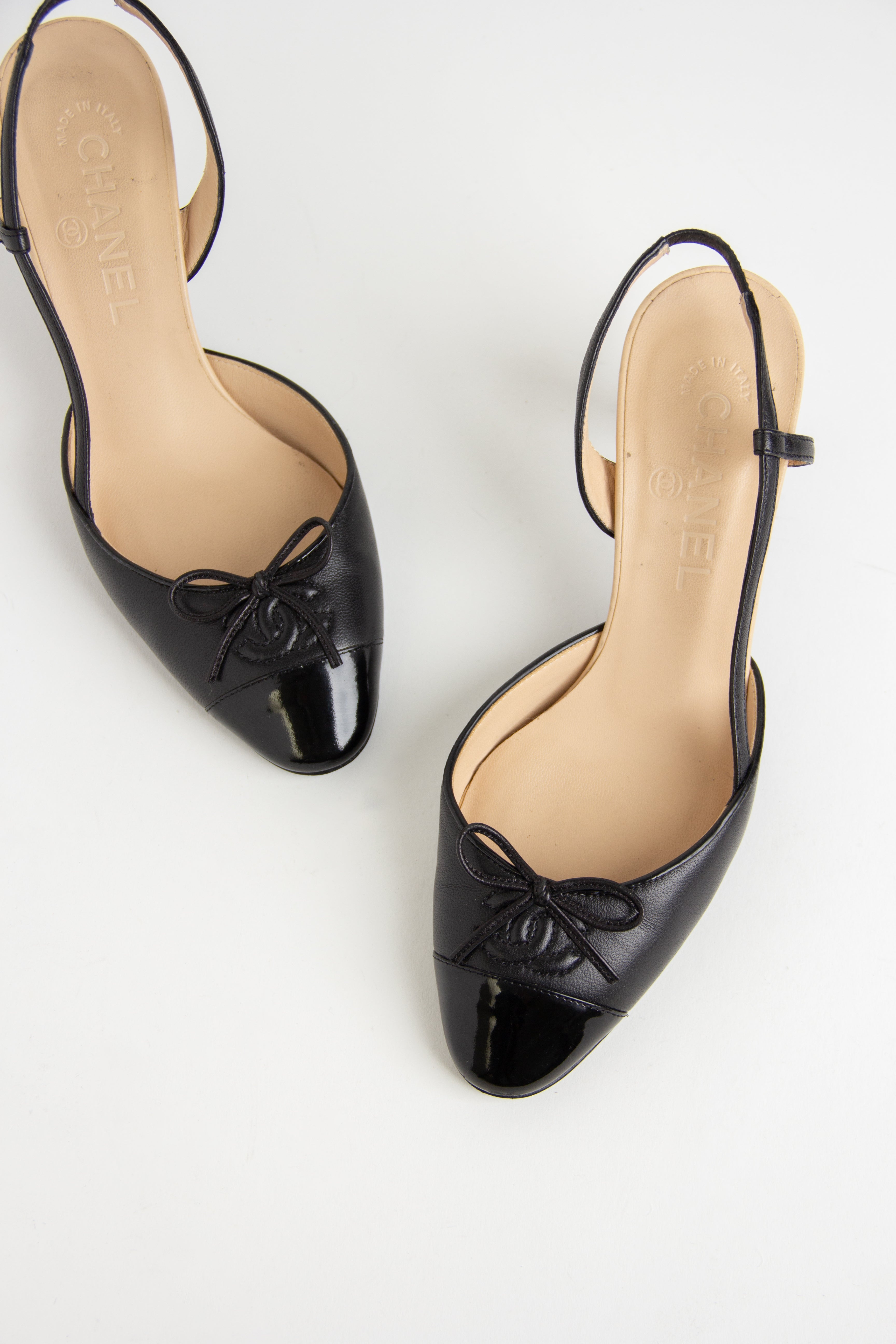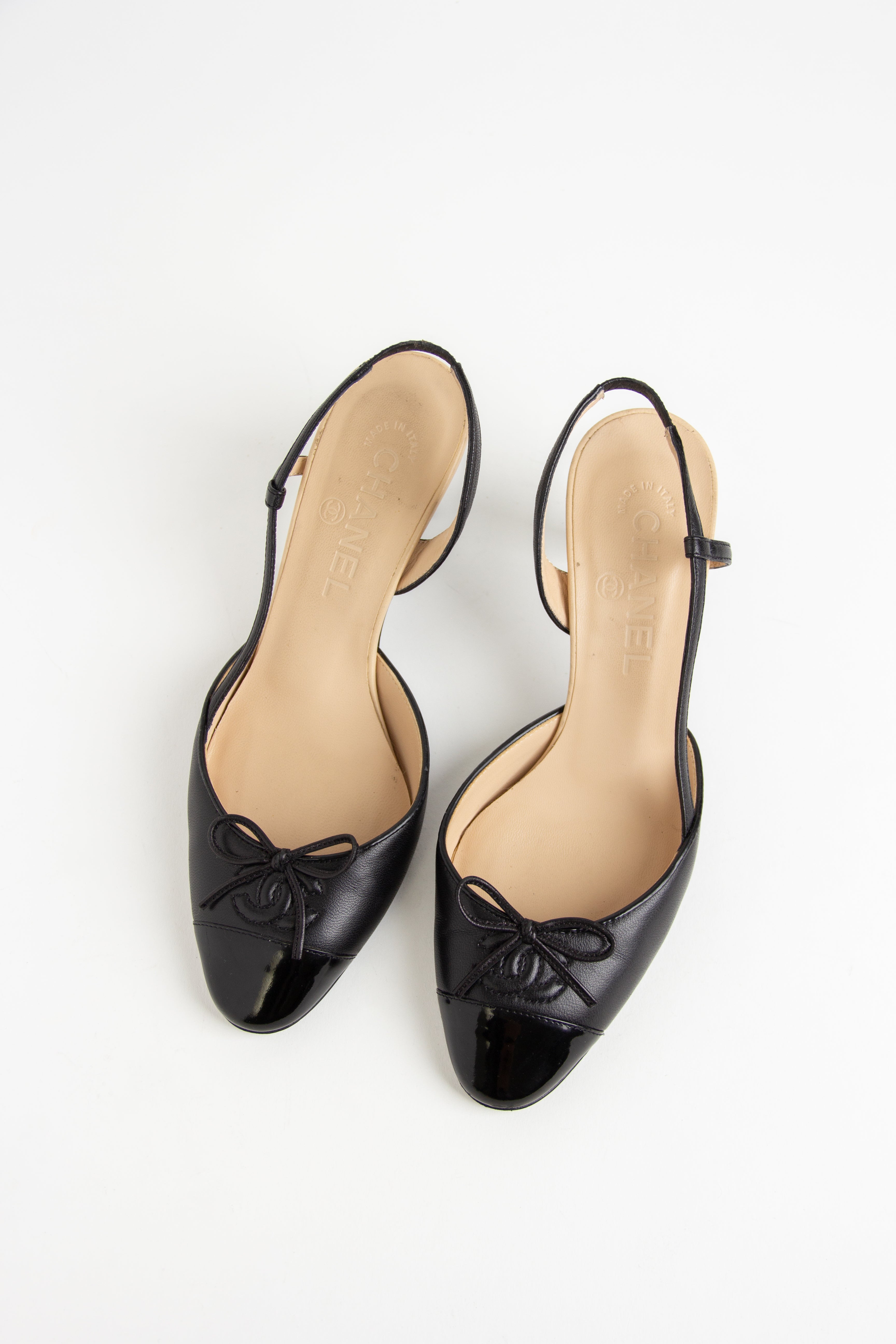Classic Chanel black ballerina slingback heels with a patent toe. CC stitching and a bow on the foot. A staple you can wear for years to come.