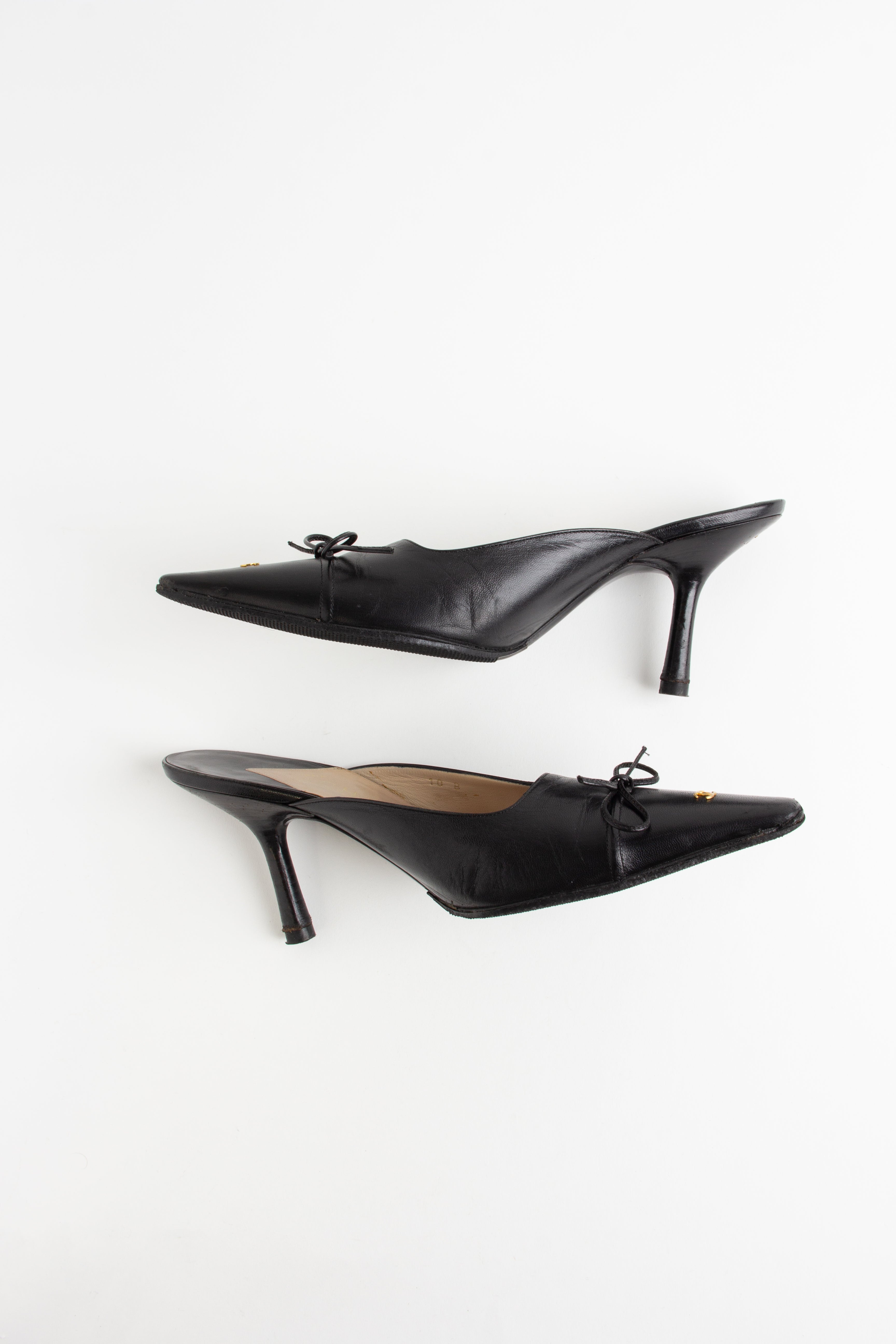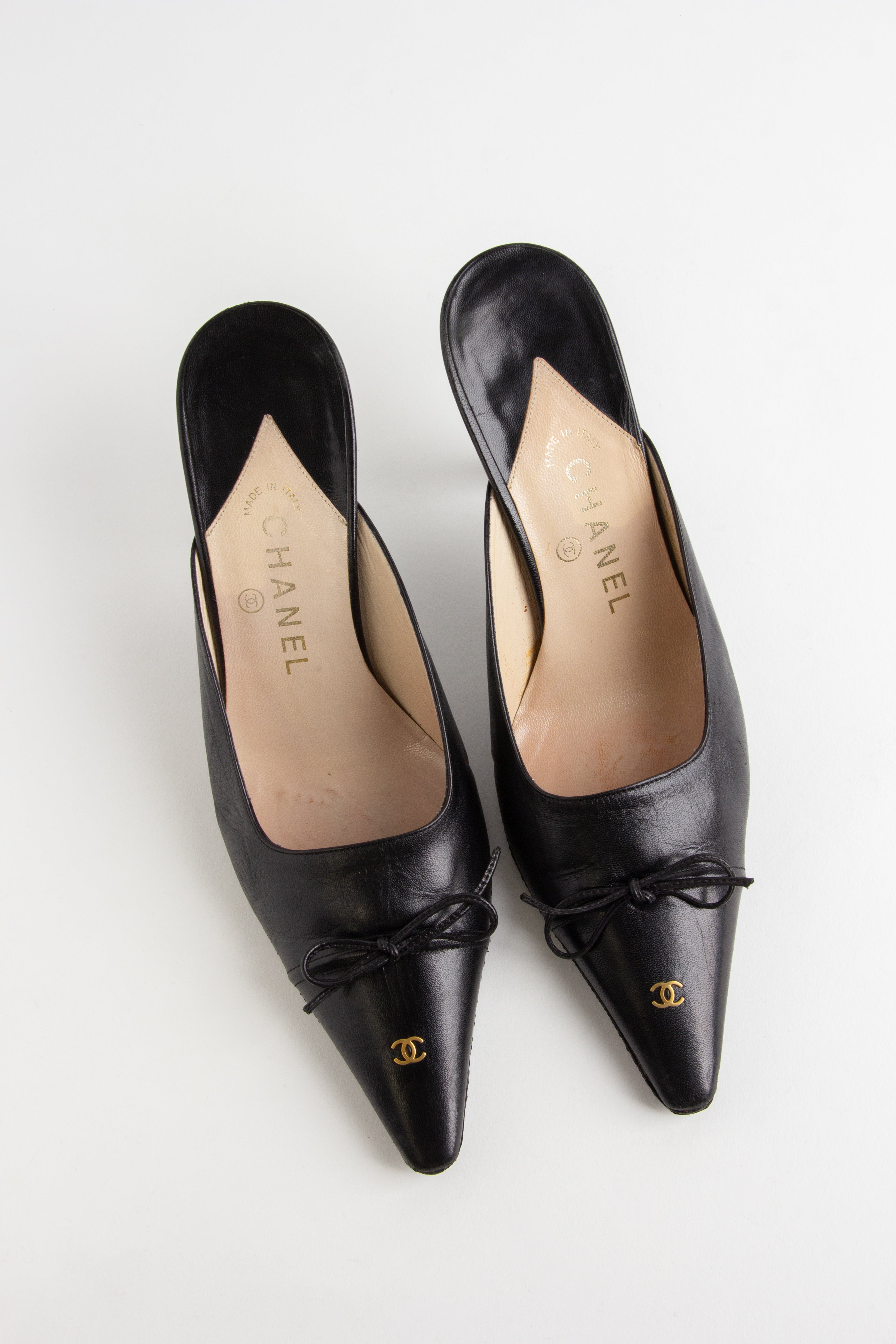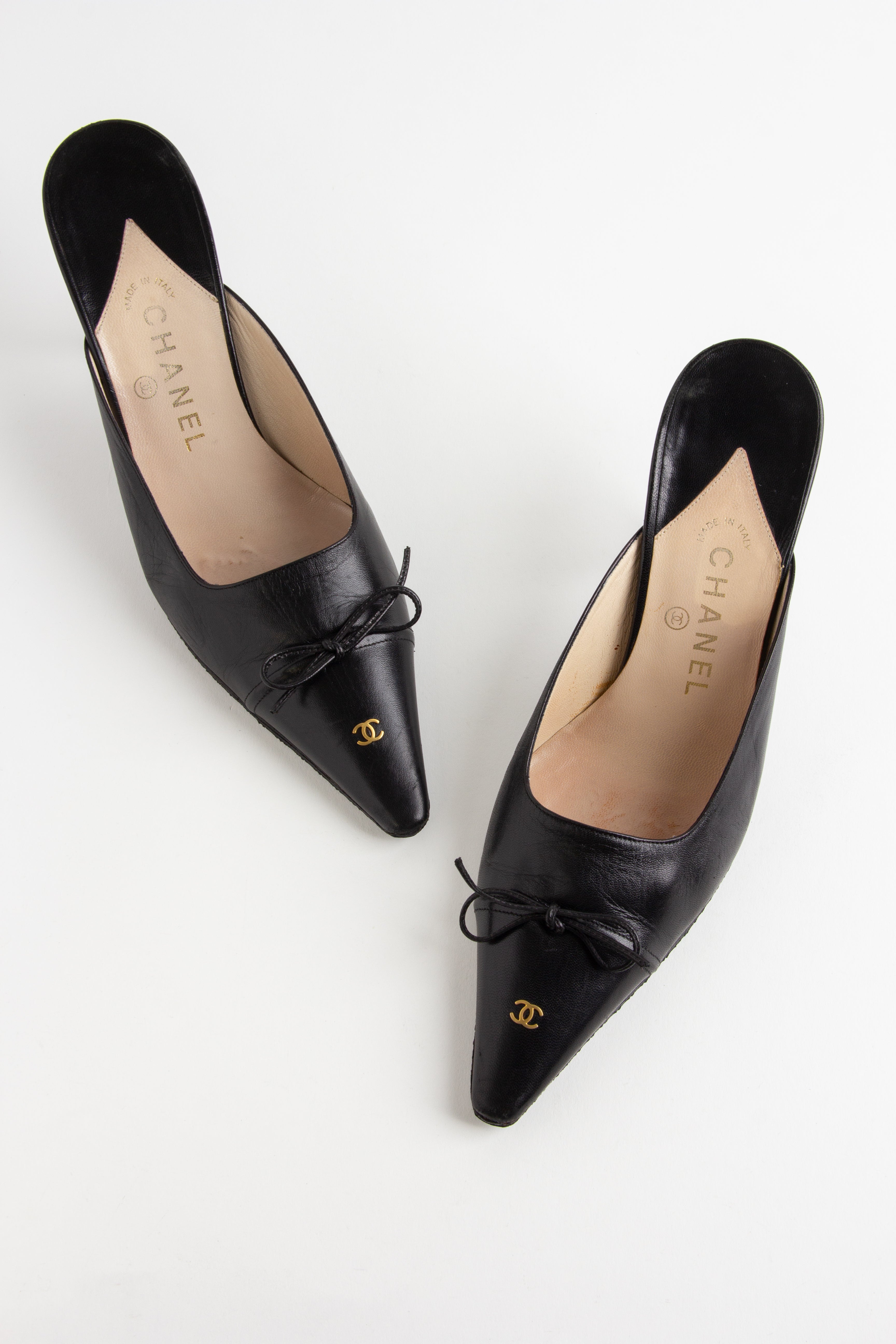 Adorable black Chanel point toe mules with gold CC emblems on the foot and heel. A classic, timeless vintage style.  ...