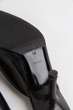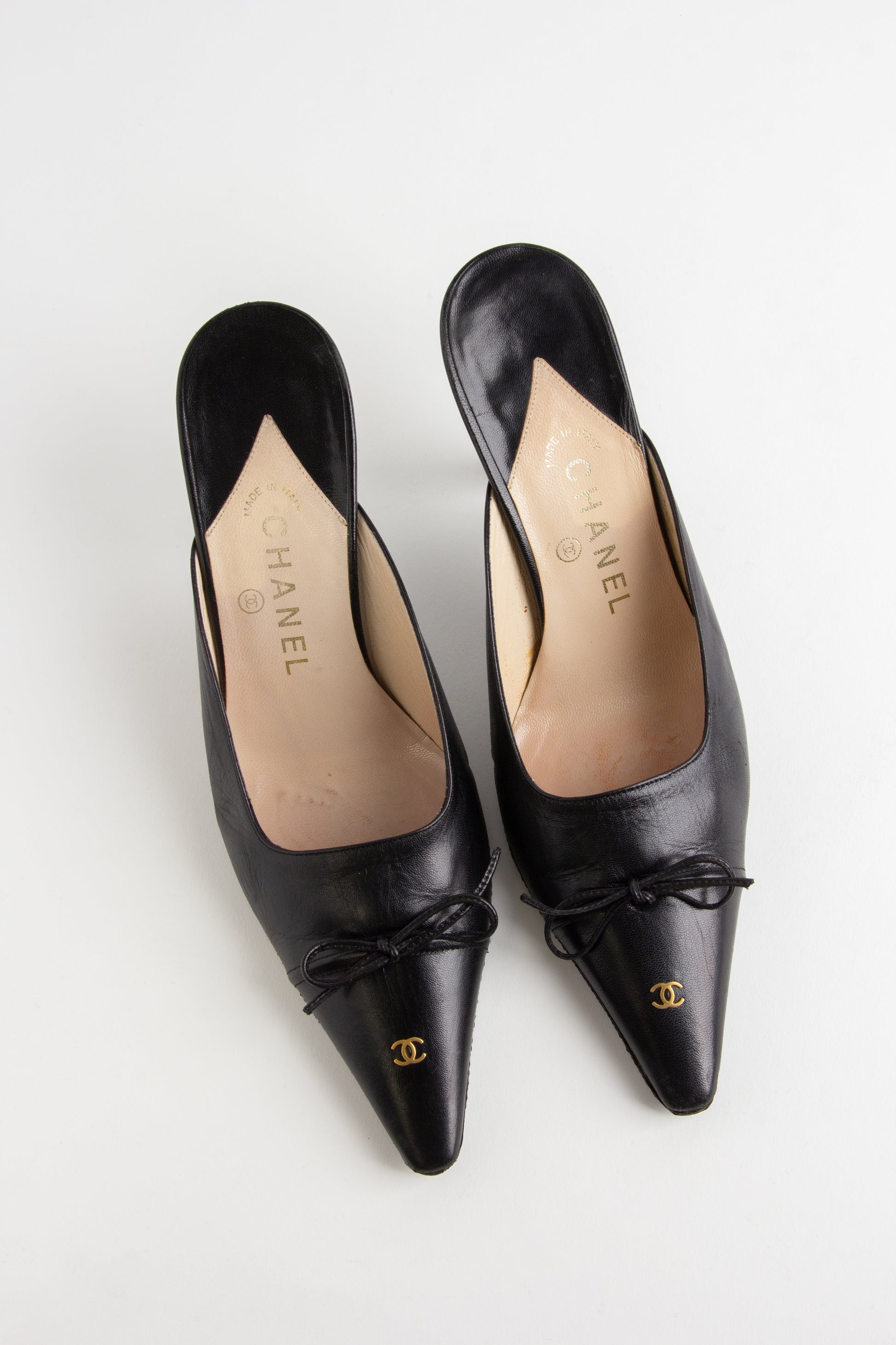 Adorable black Chanel point toe mules with gold CC emblems on the foot and heel. A classic, timeless vintage style.