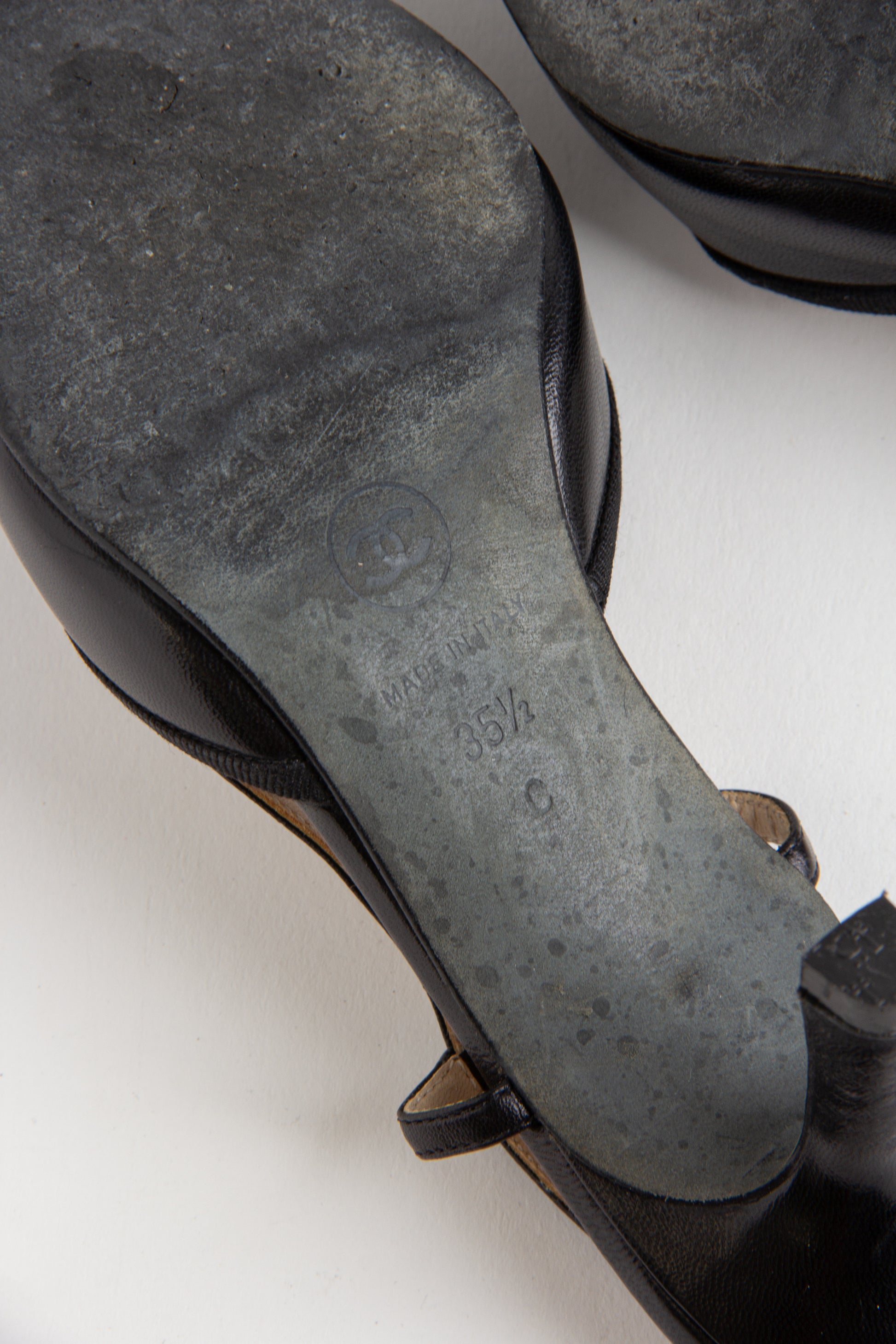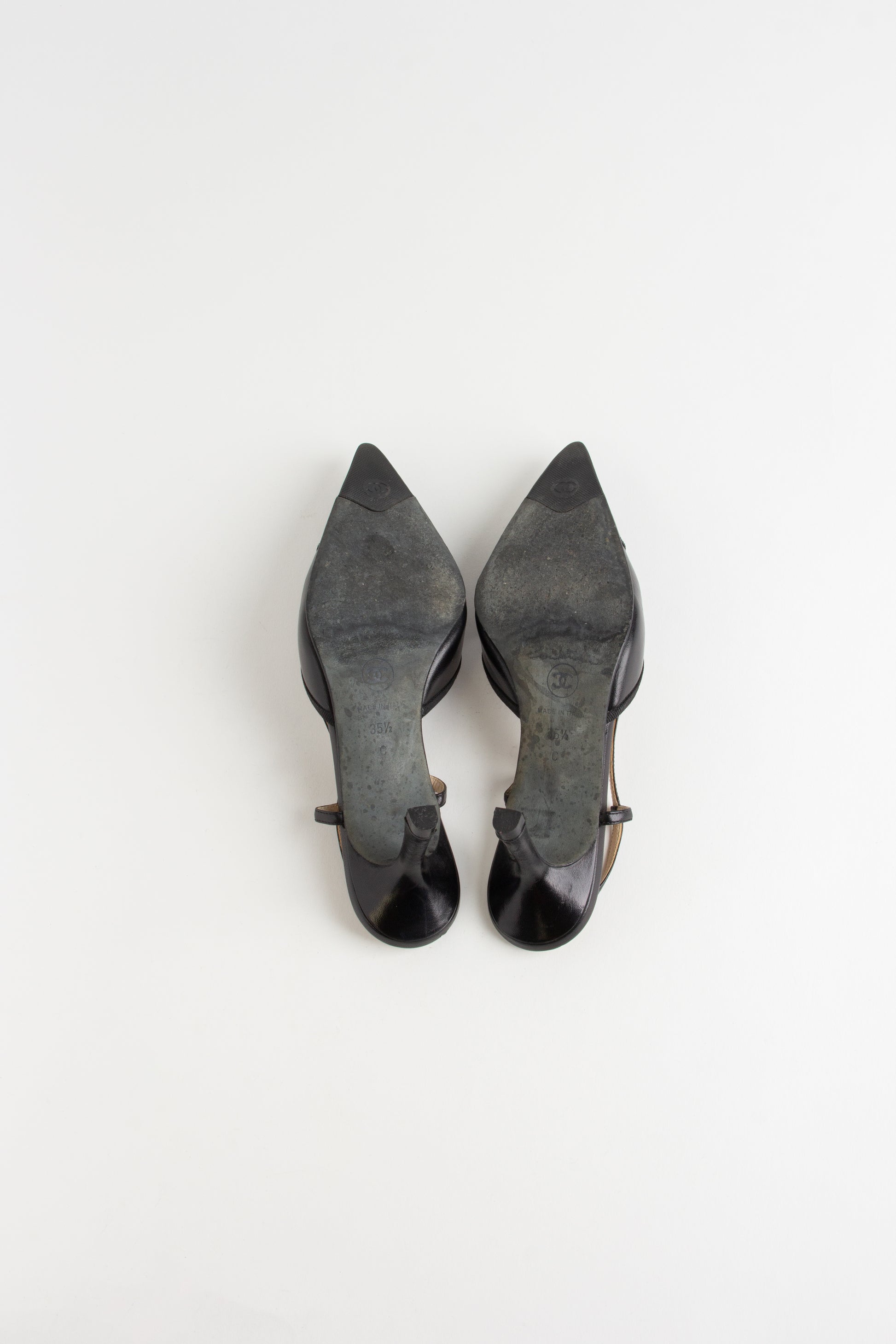 Rare, in-demand black Chanel slingback heels with the classic CC stitching on the toe. A beautiful minimalist heel to...