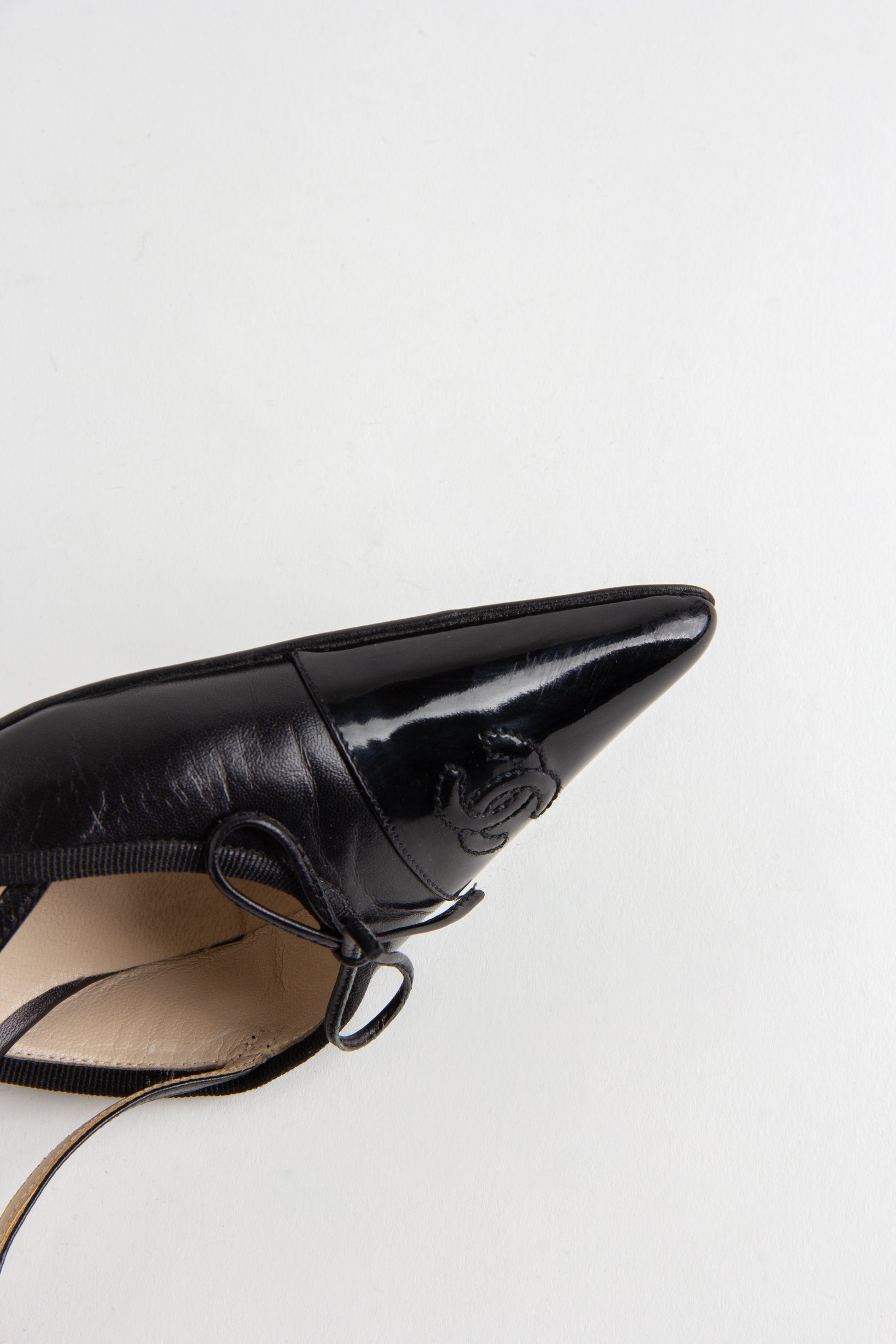 Rare, in-demand black Chanel slingback heels with the classic CC stitching on the toe. A beautiful minimalist heel to dress up or down.