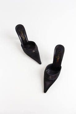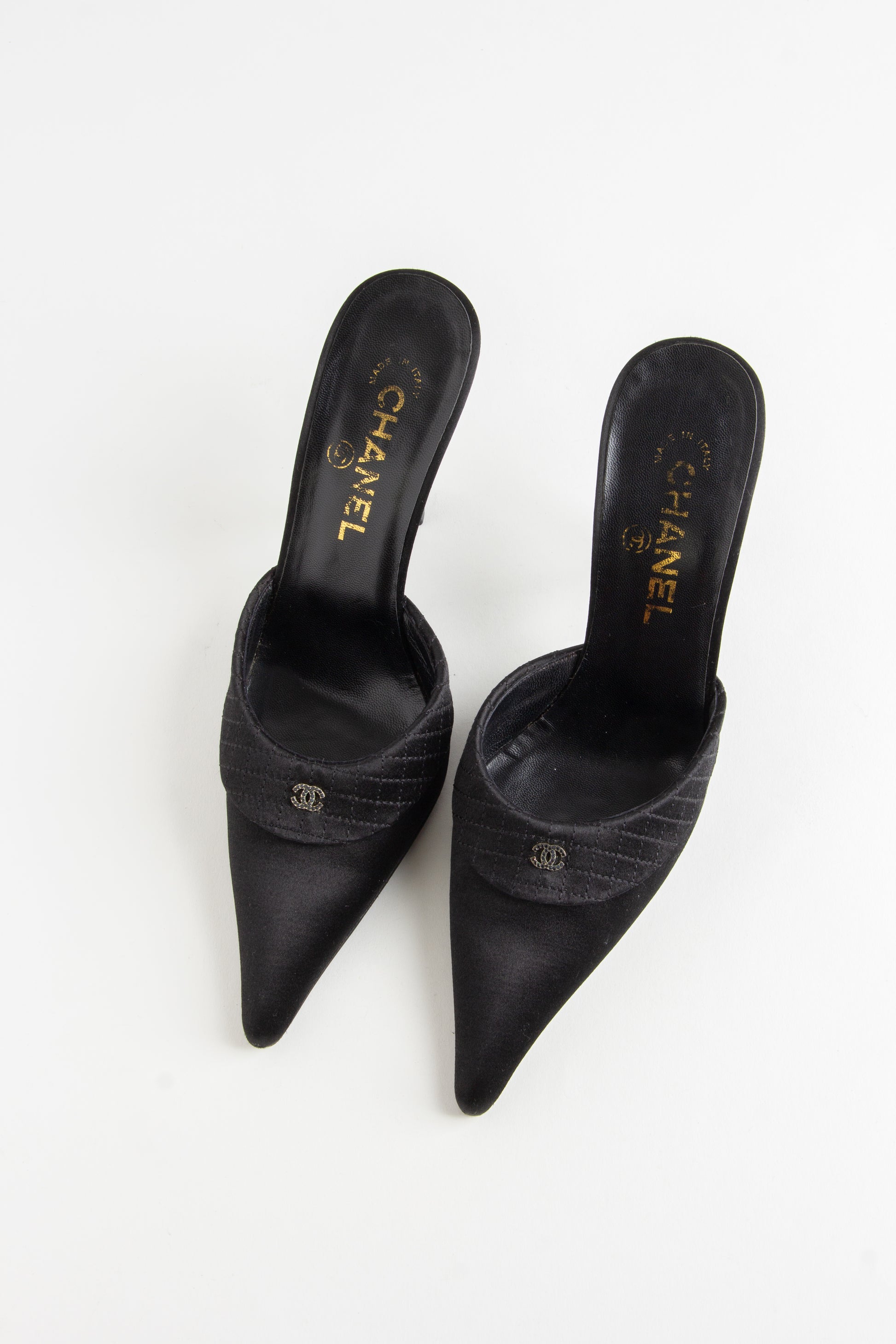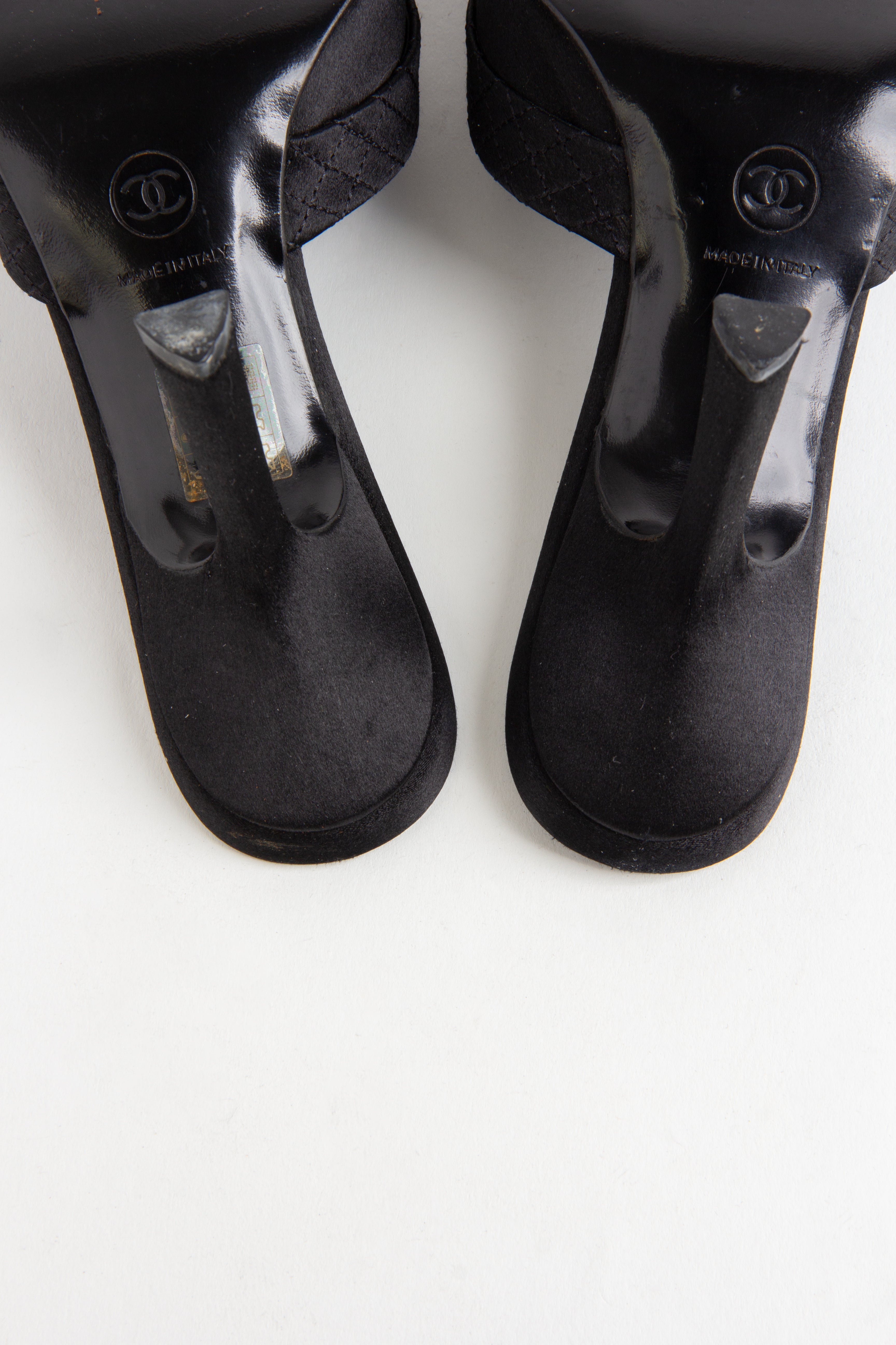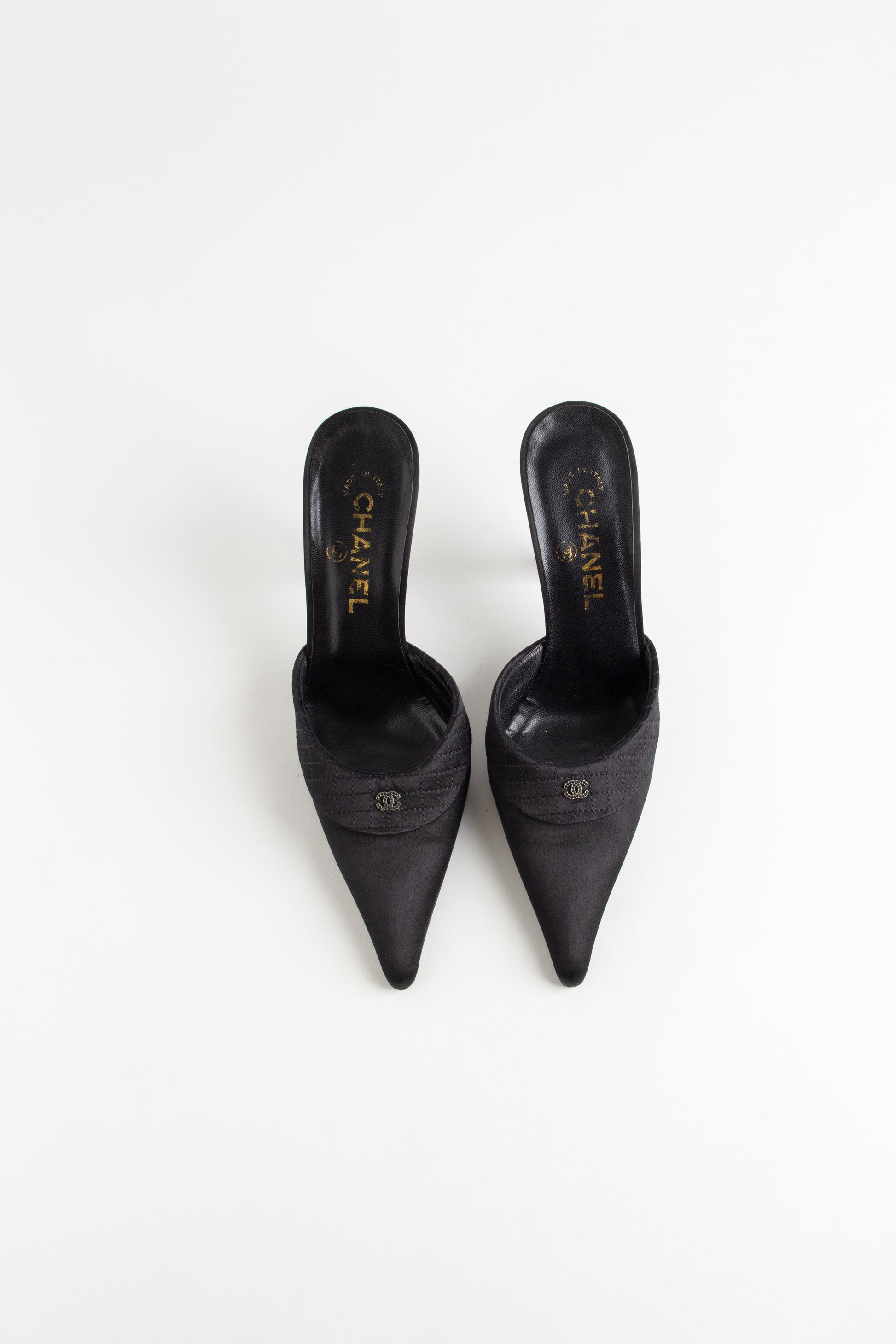 Stunning rare Chanel silk / satin mules with stitch detailing and jeweled CC emblems on the foot. Such a beautiful evening heel.