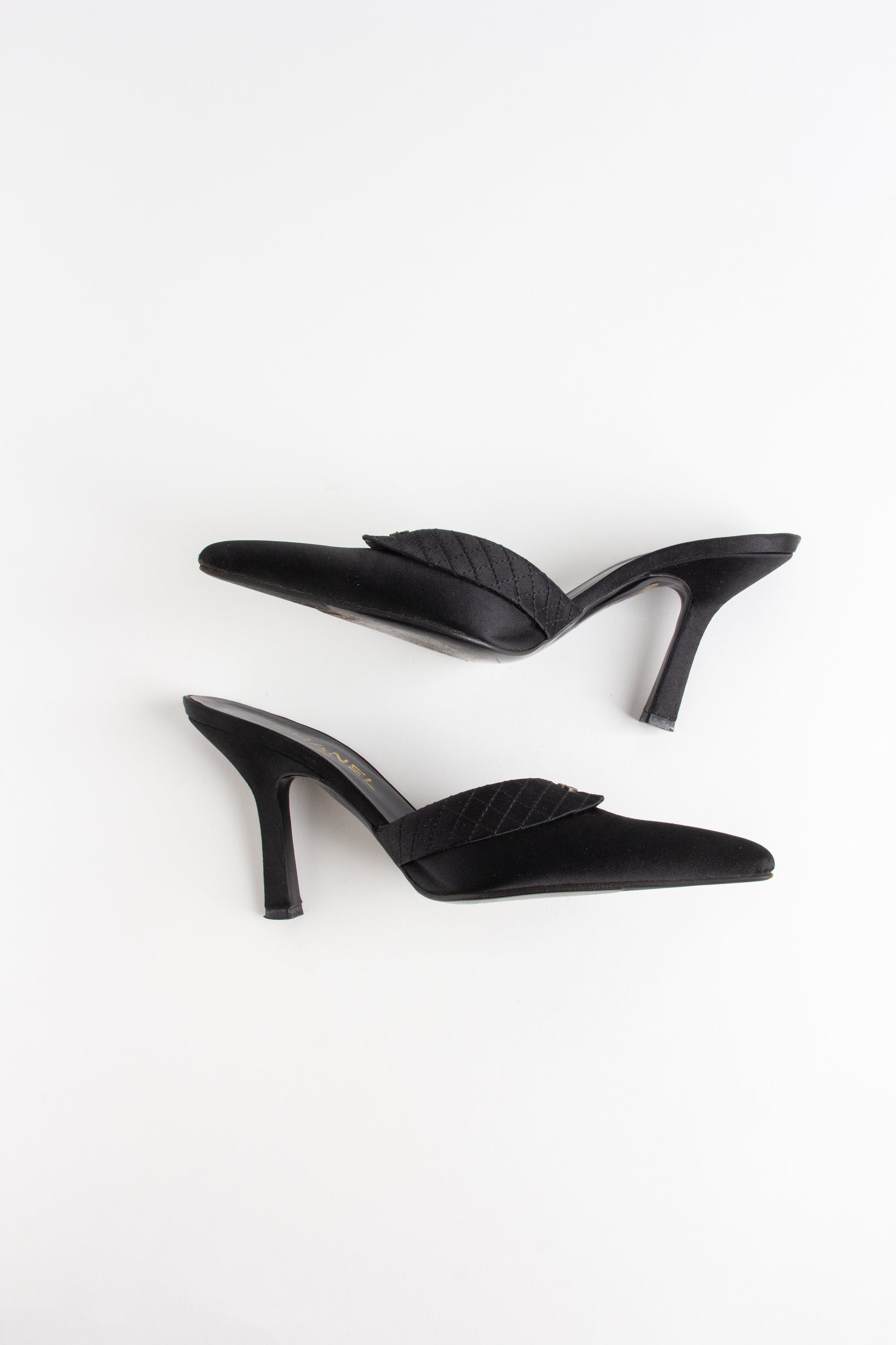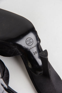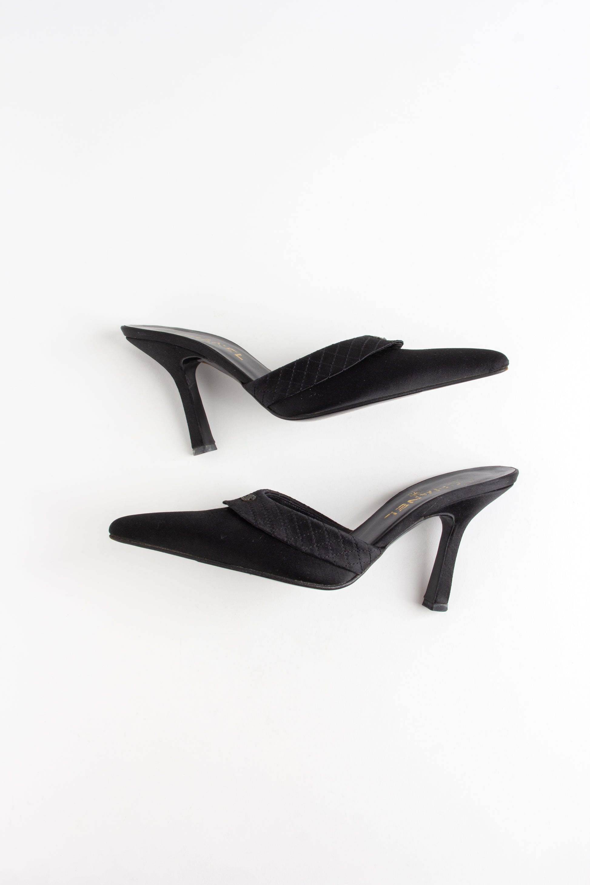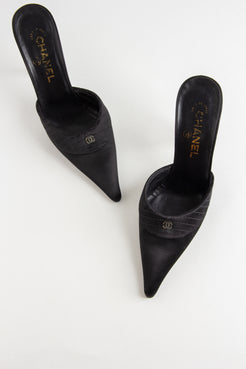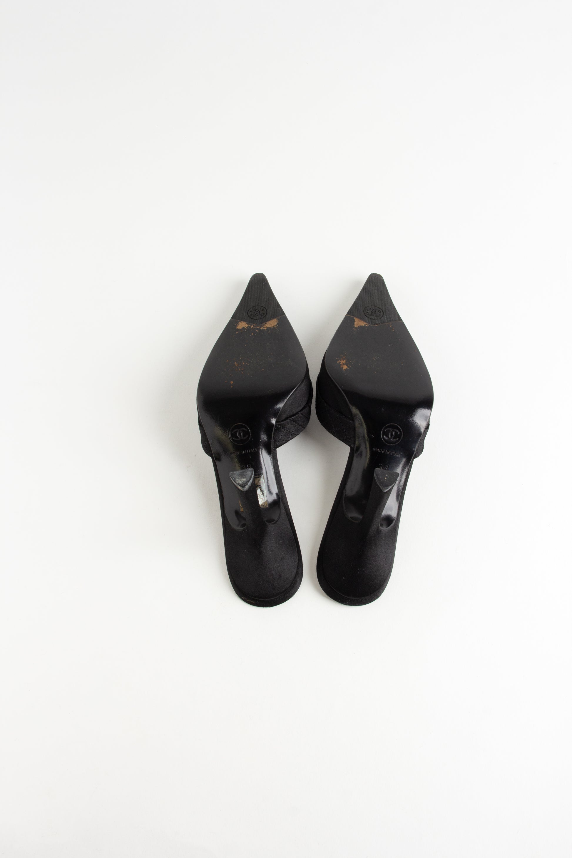 Stunning rare Chanel silk / satin mules with stitch detailing and jeweled CC emblems on the foot. Such a beautiful evening heel.