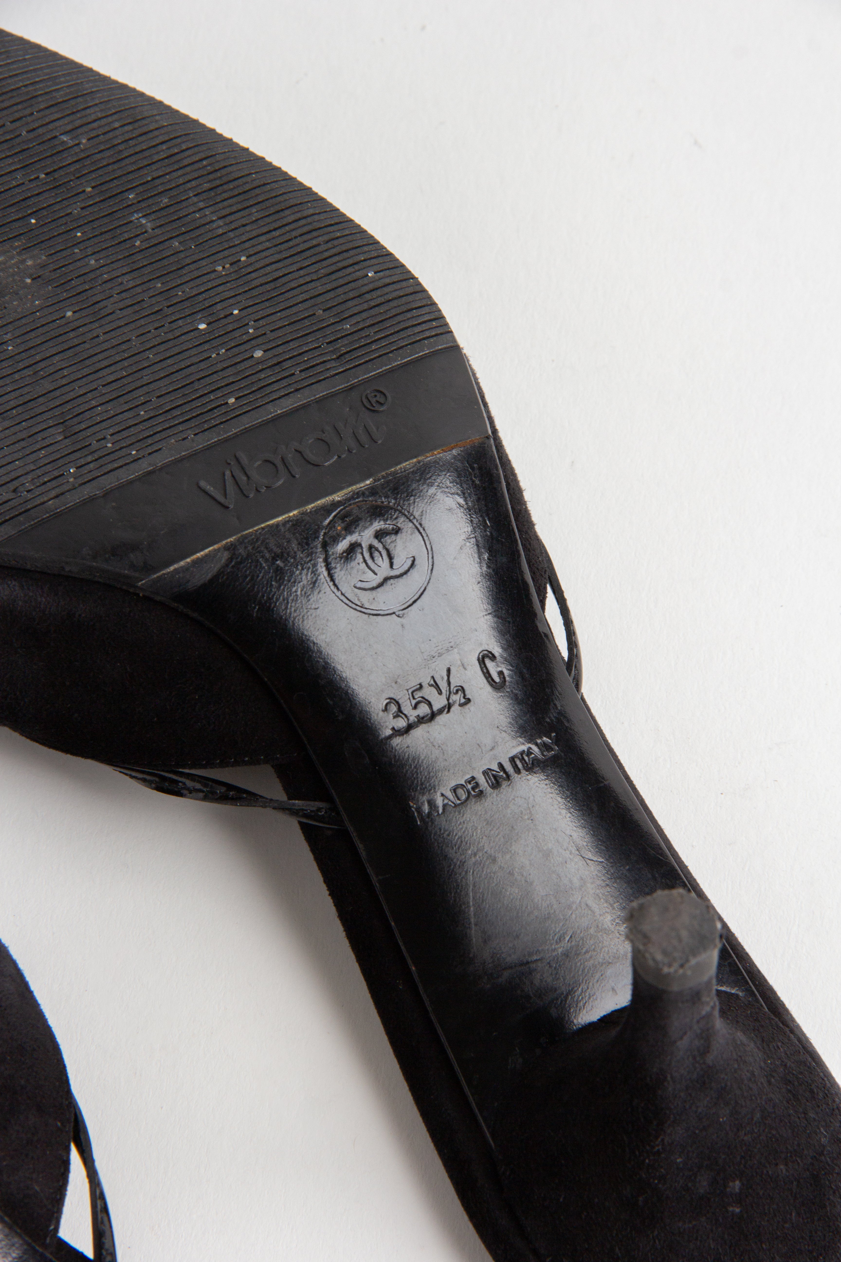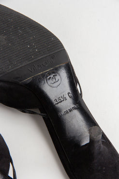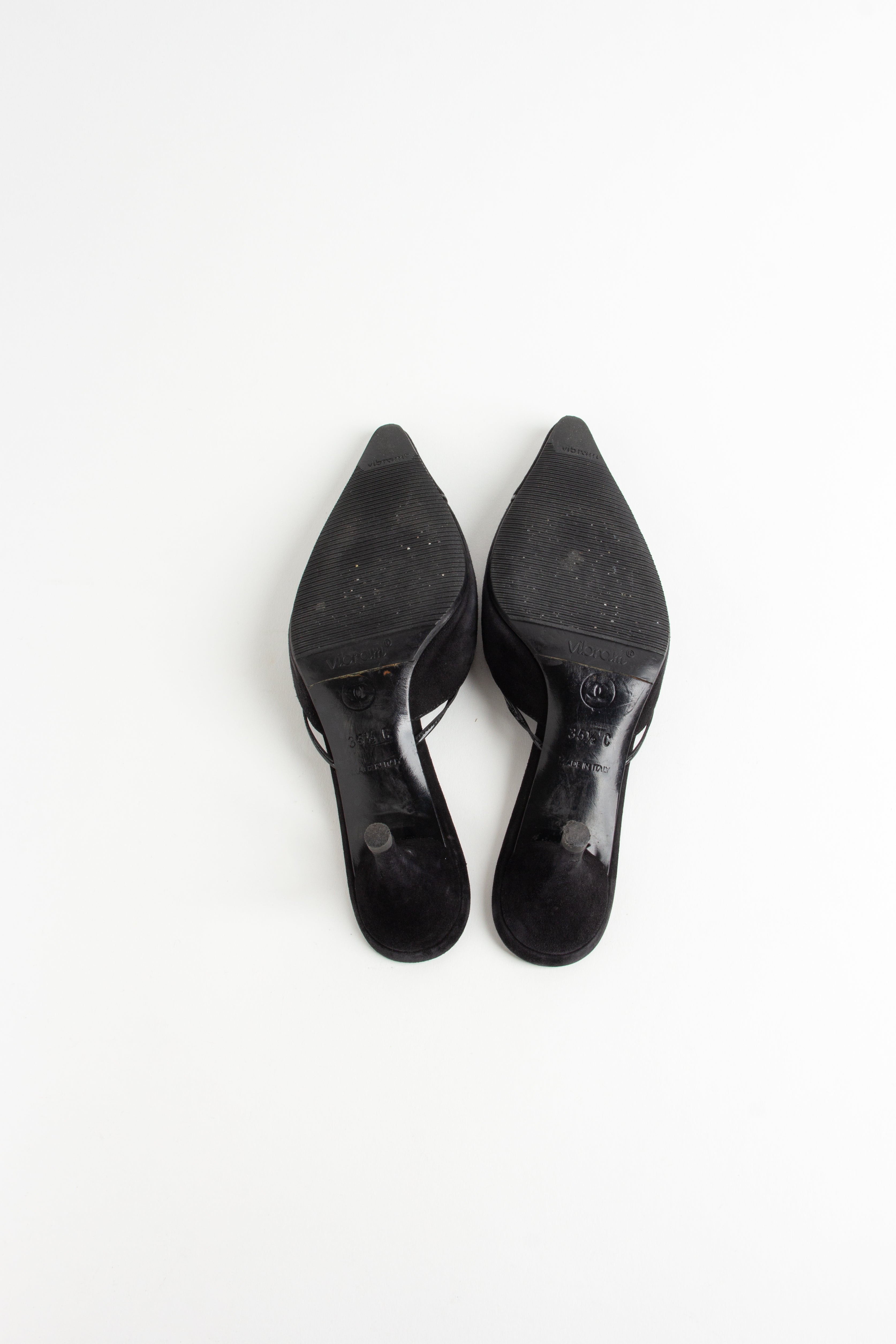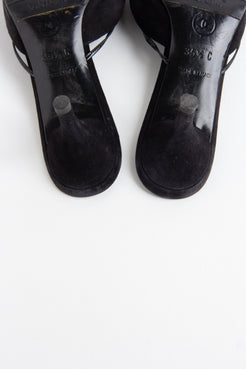 Charming strappy black Chanel point toe suede mules with silver CC emblems on the foot.