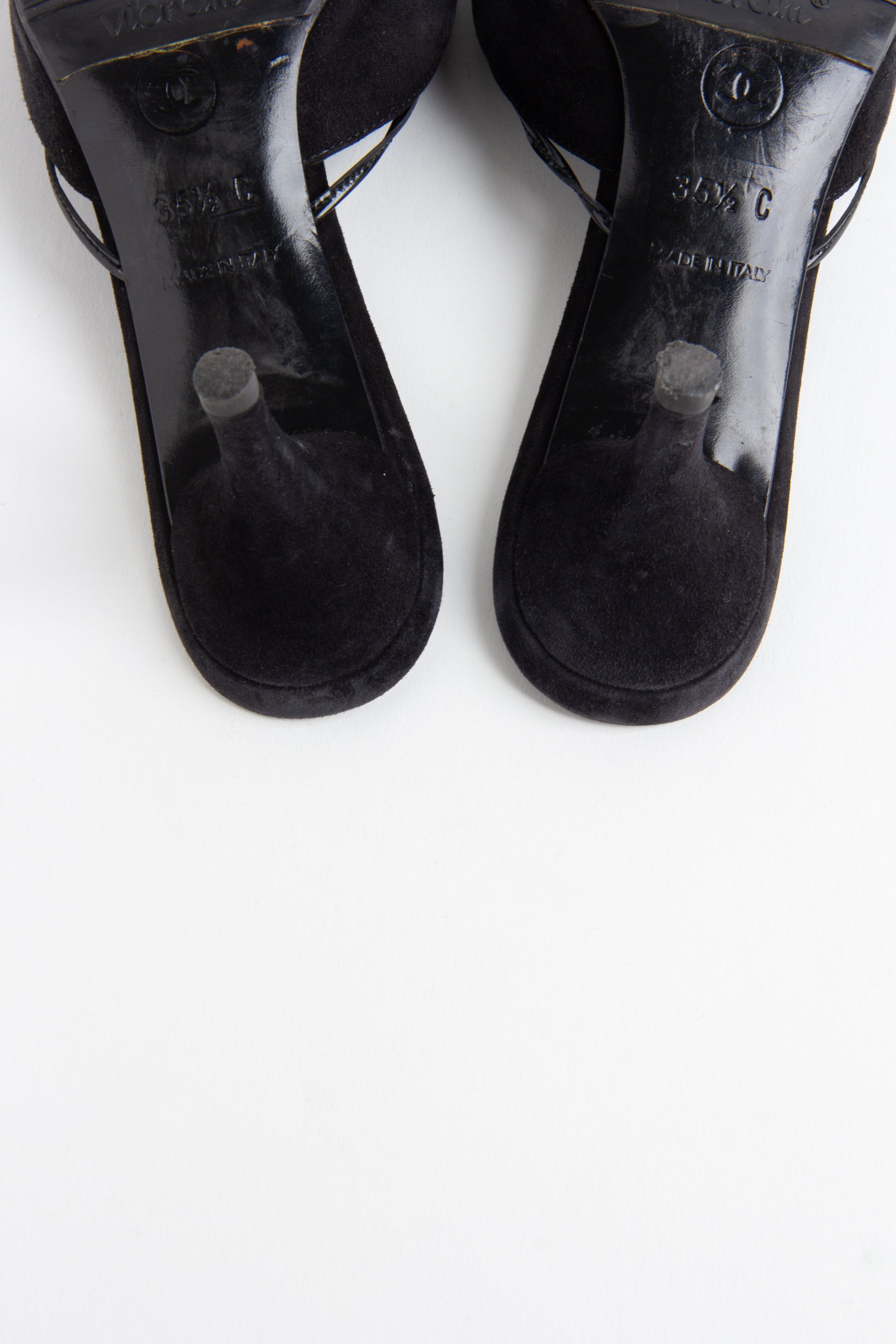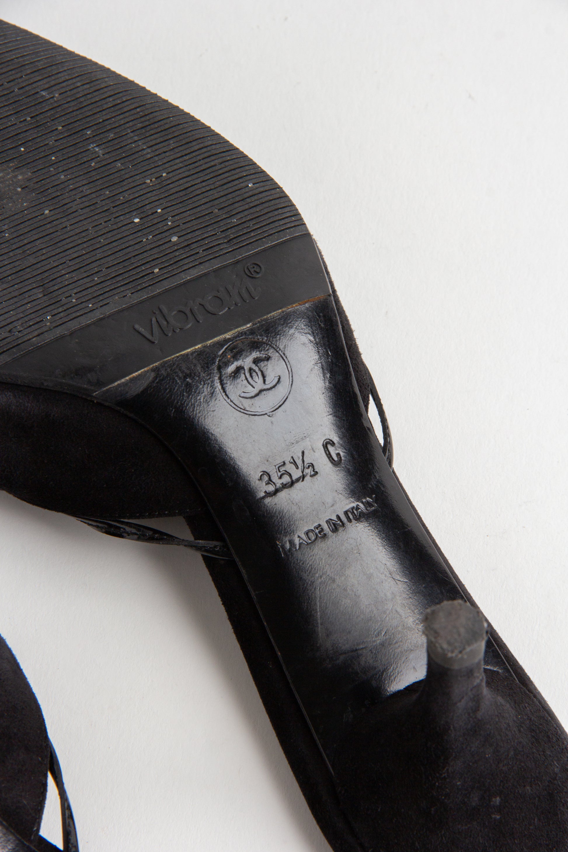 Charming strappy black Chanel point toe suede mules with silver CC emblems on the foot. SIZE: IT 35.5 or US 5.5. Chan...