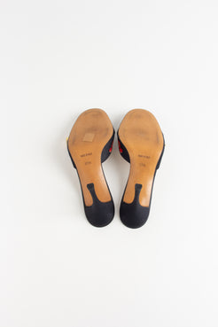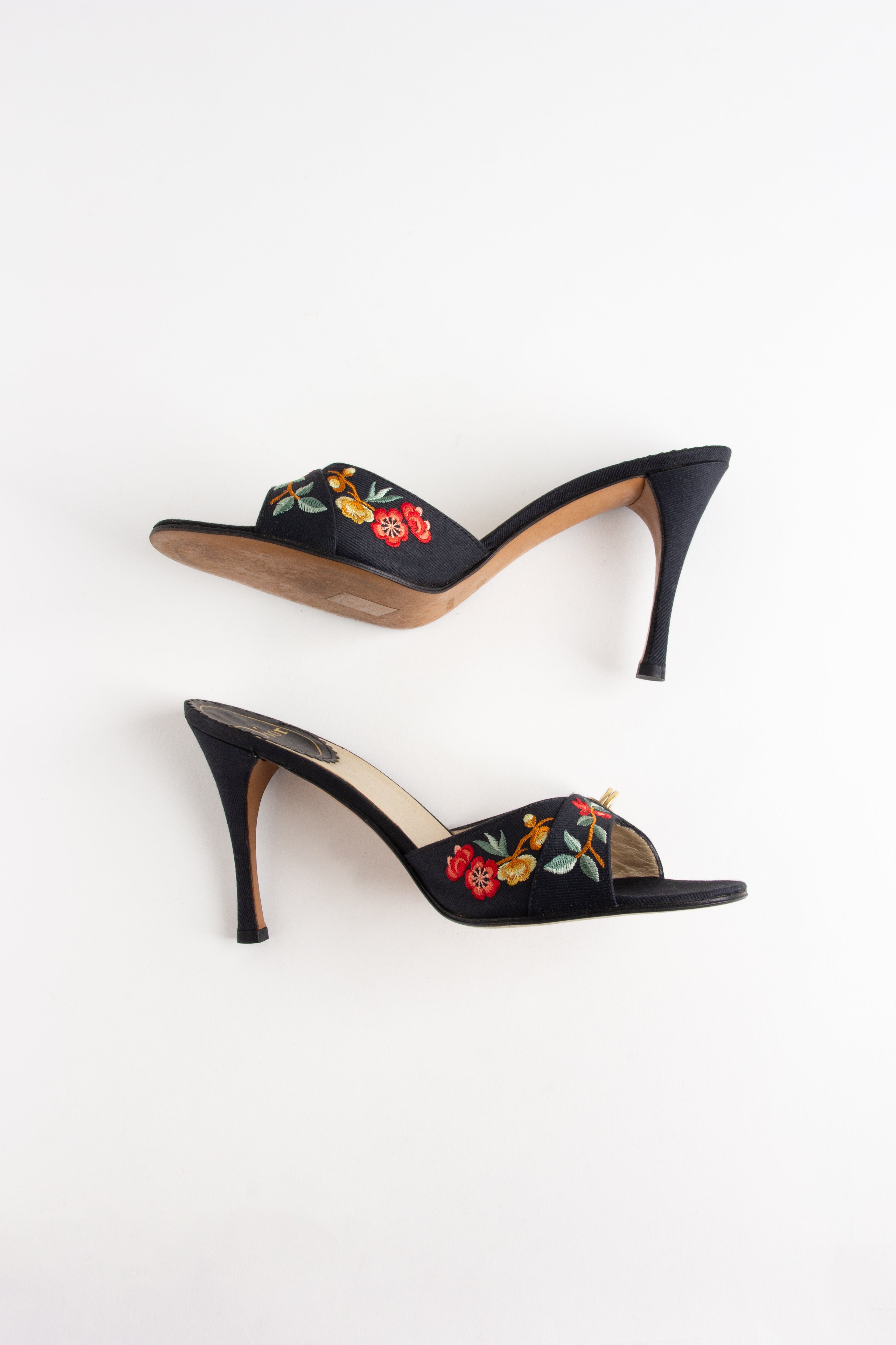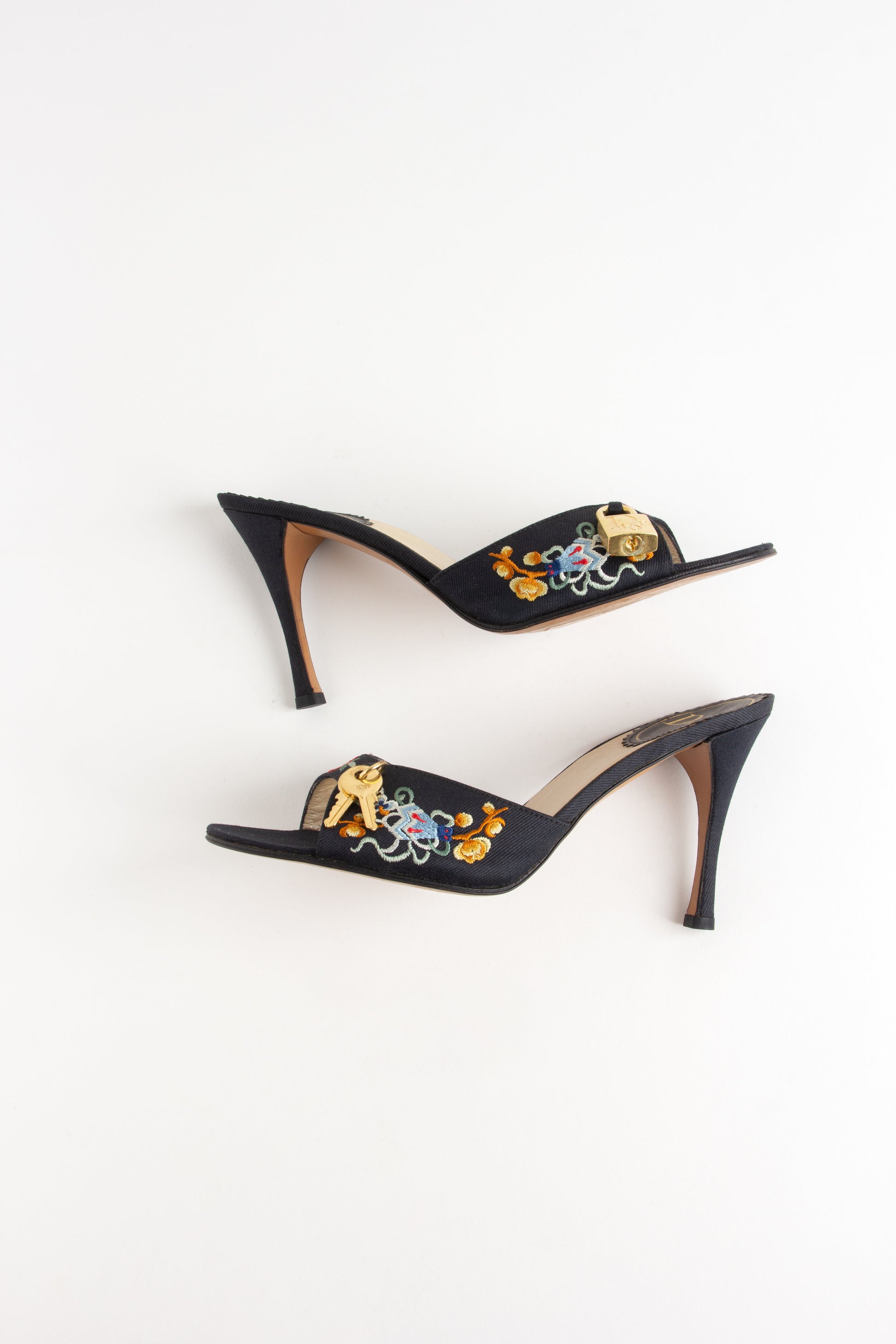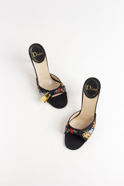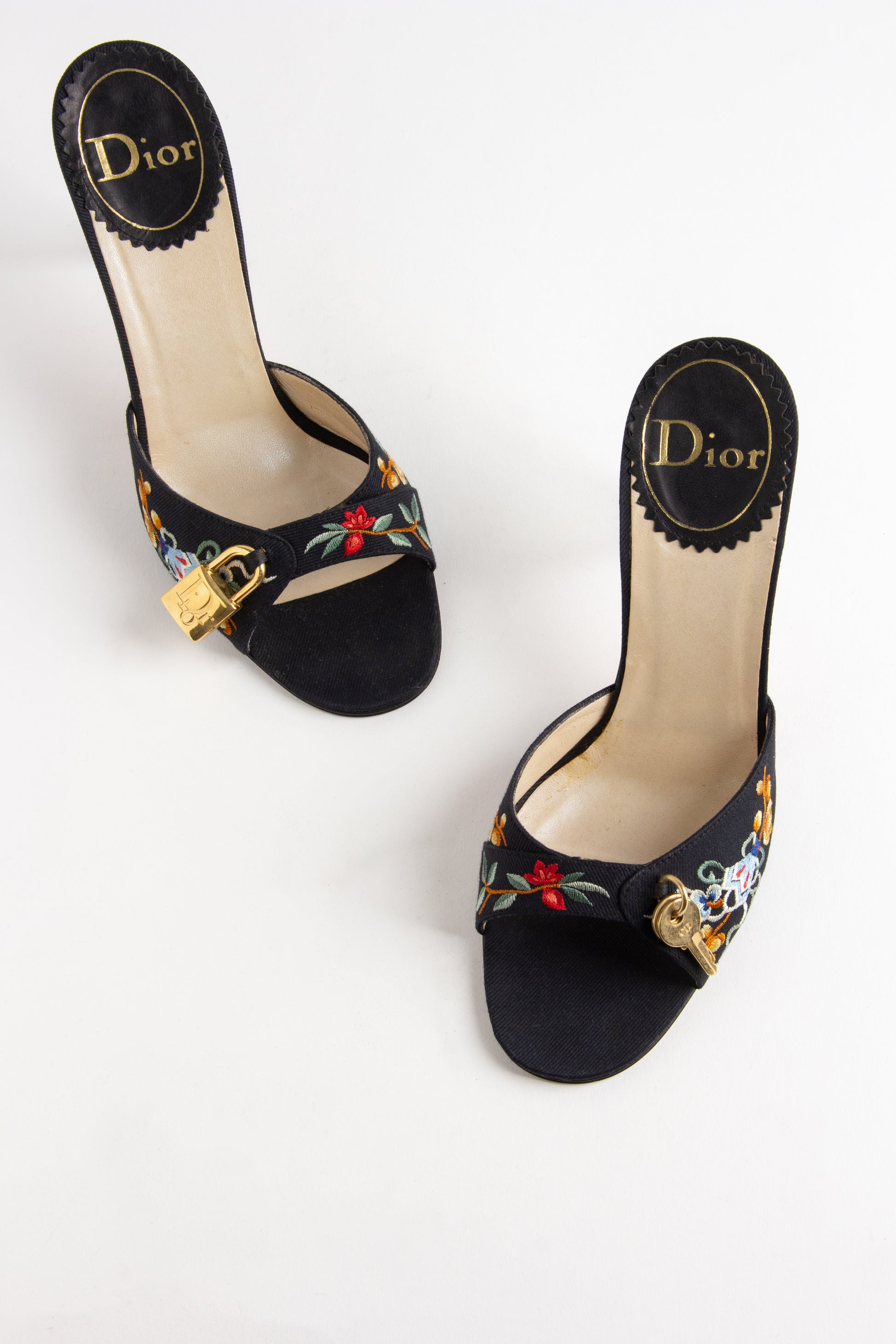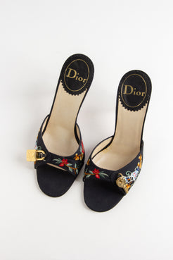 Adorable rare Dior open toe multicolor floral embroidered heels with gold lock and key charm accents on the foot. A beautiful statement heel you can pair with jeans and a tee.