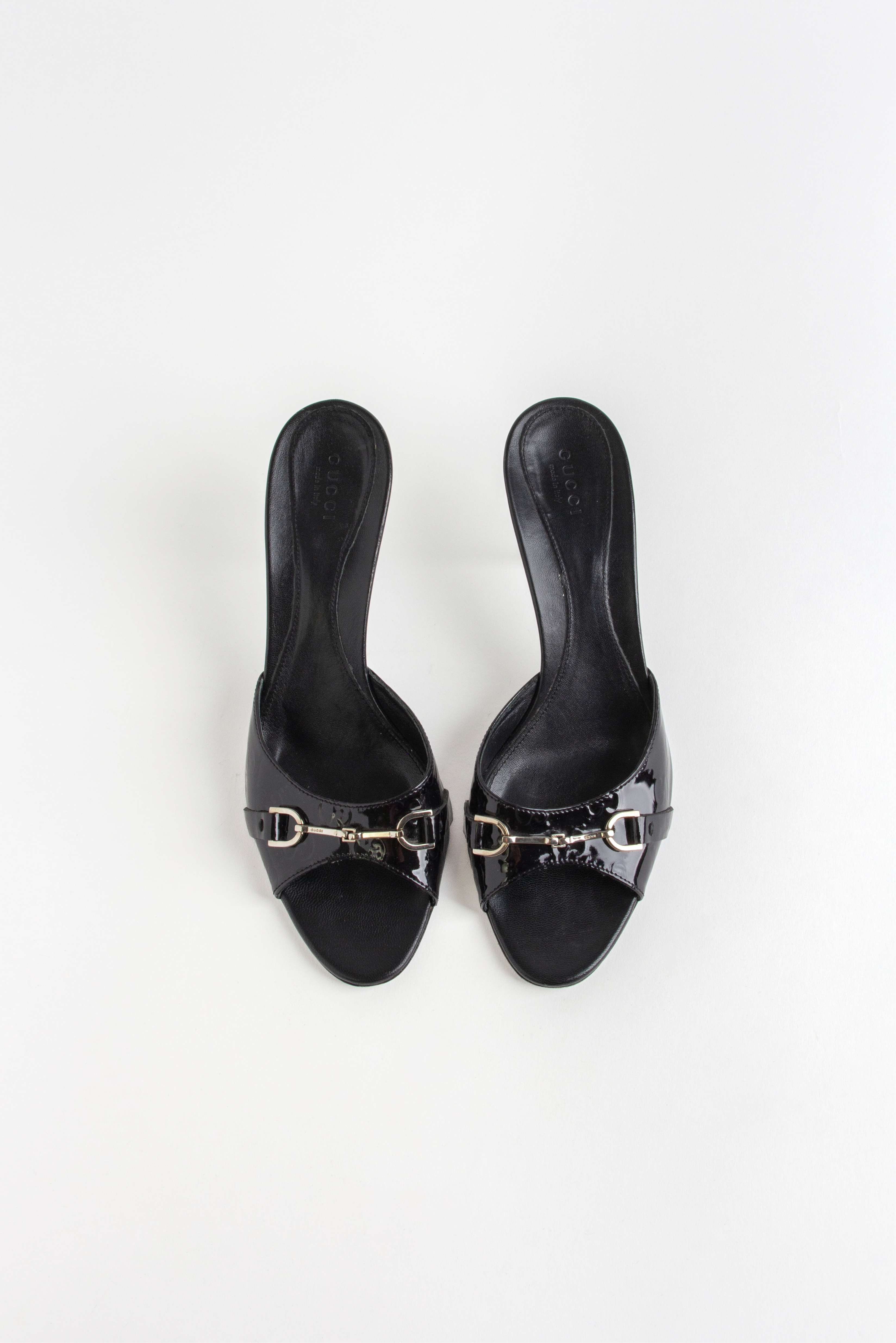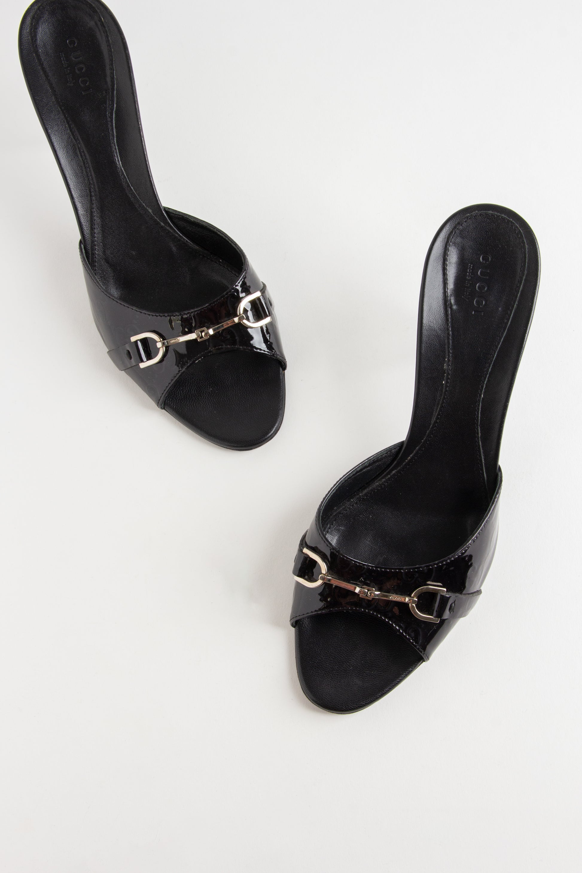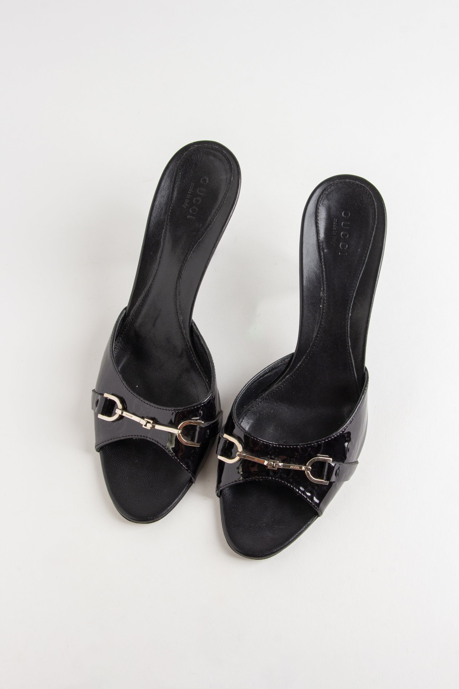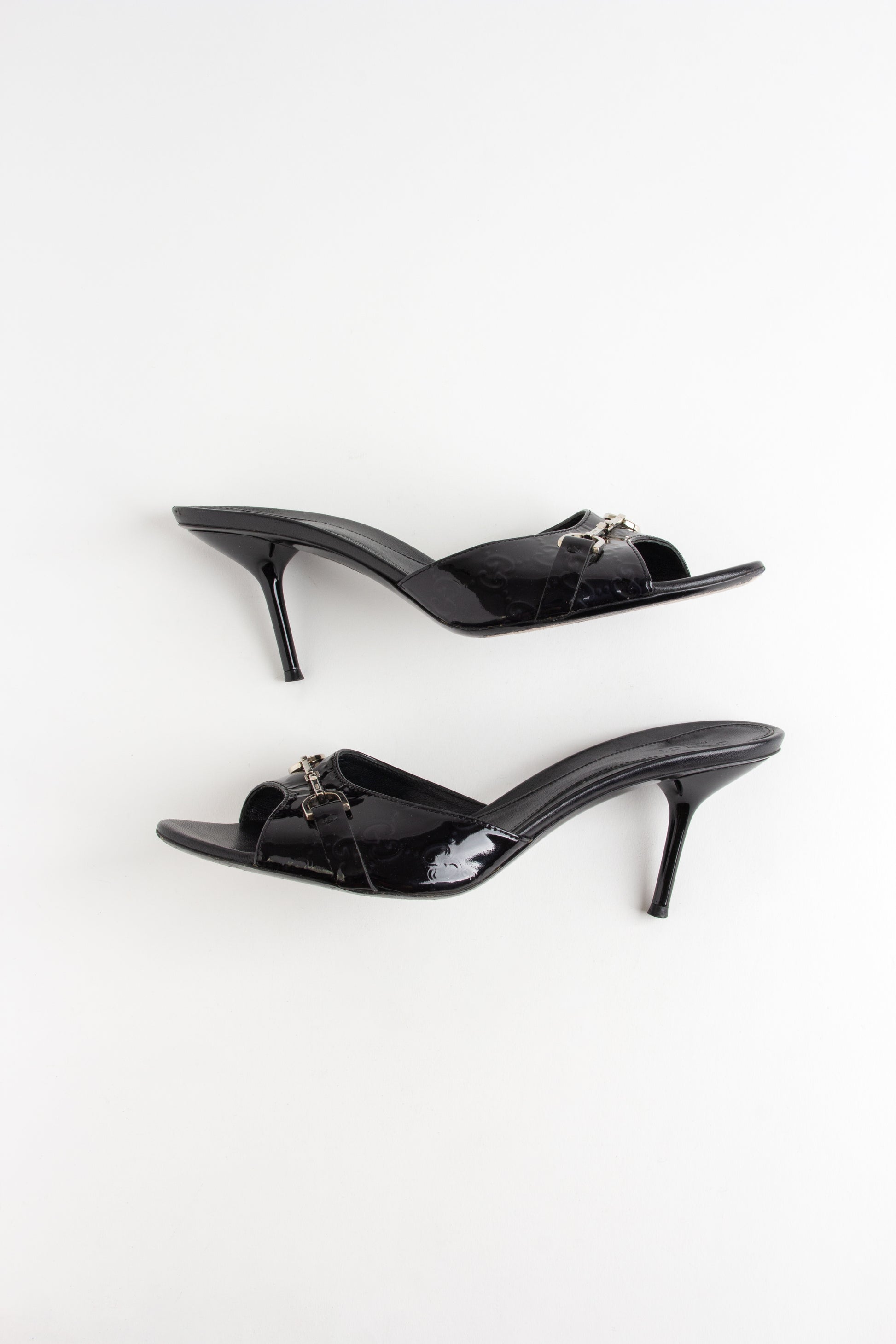 Beautiful black patent leather Gucci open toe heels with silver horsebit hardware on the foot. Subtle "GG" monogram embossing throughout.