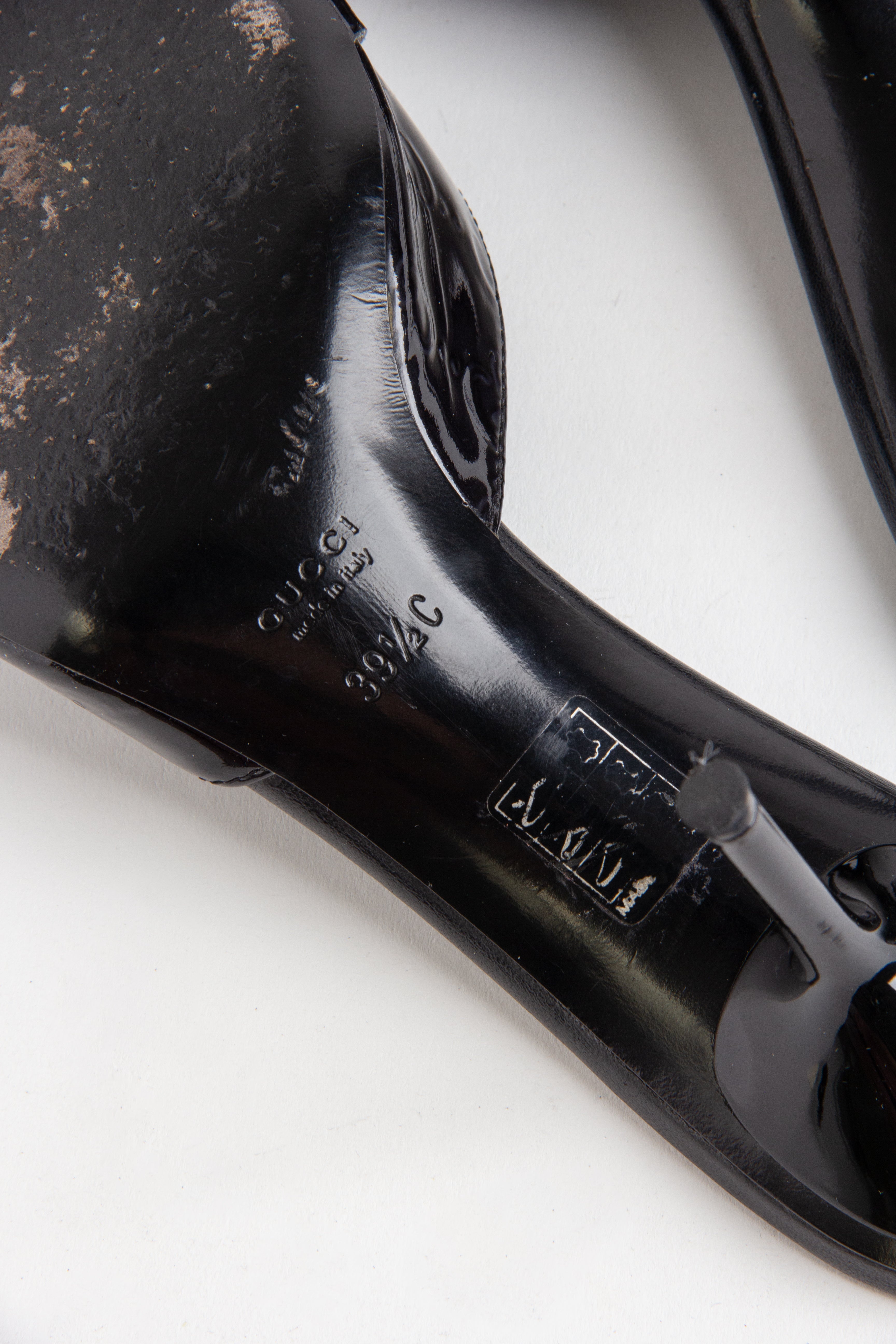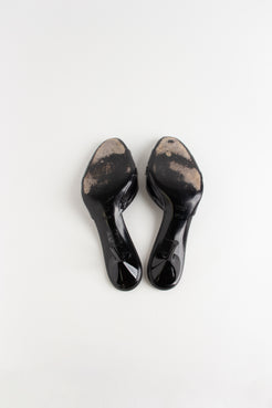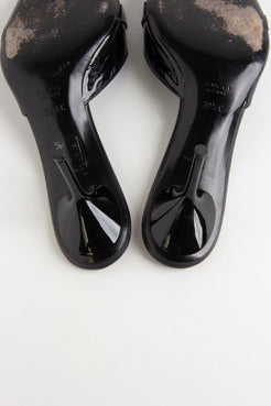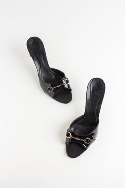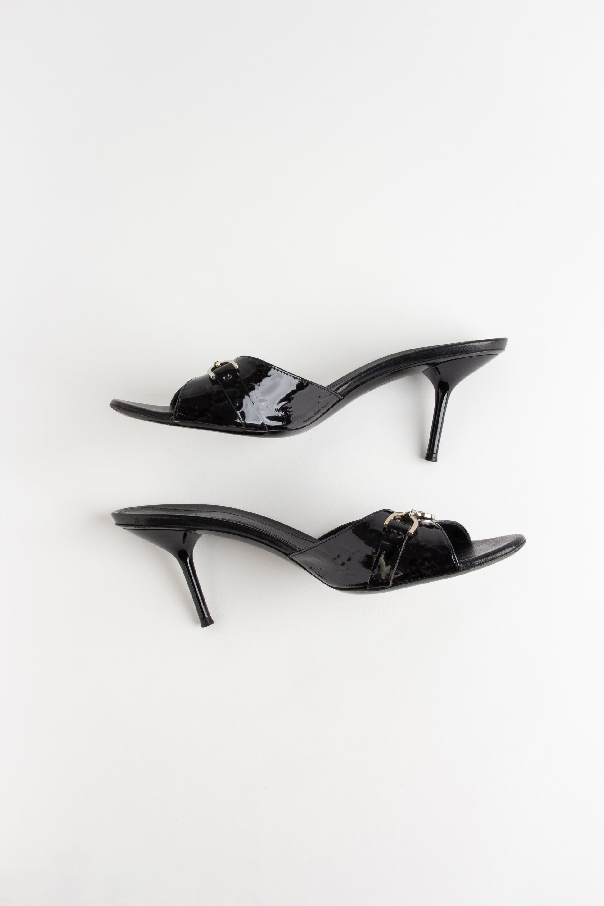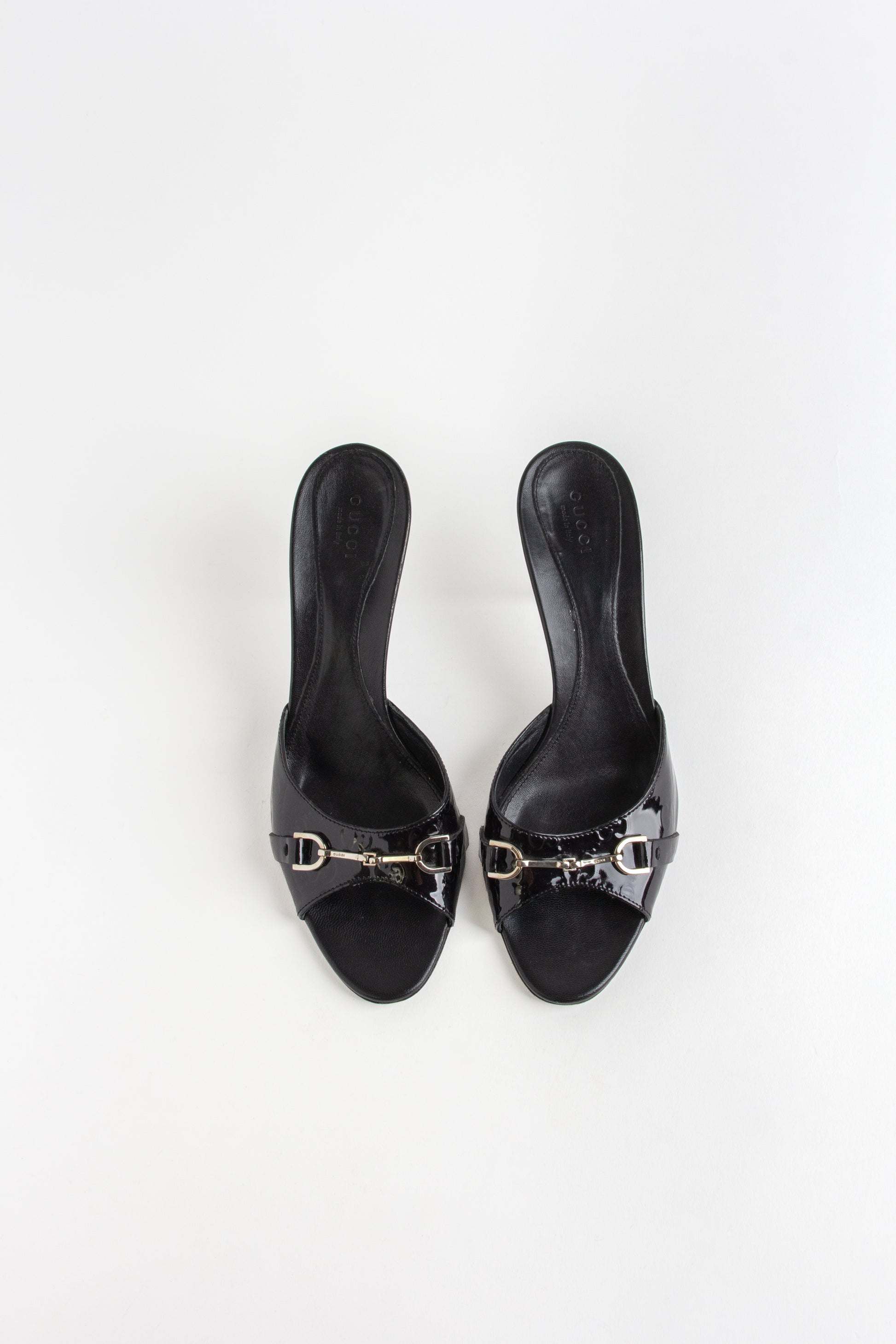 Beautiful black patent leather Gucci open toe heels with silver horsebit hardware on the foot. Subtle "GG" monogram embossing throughout.