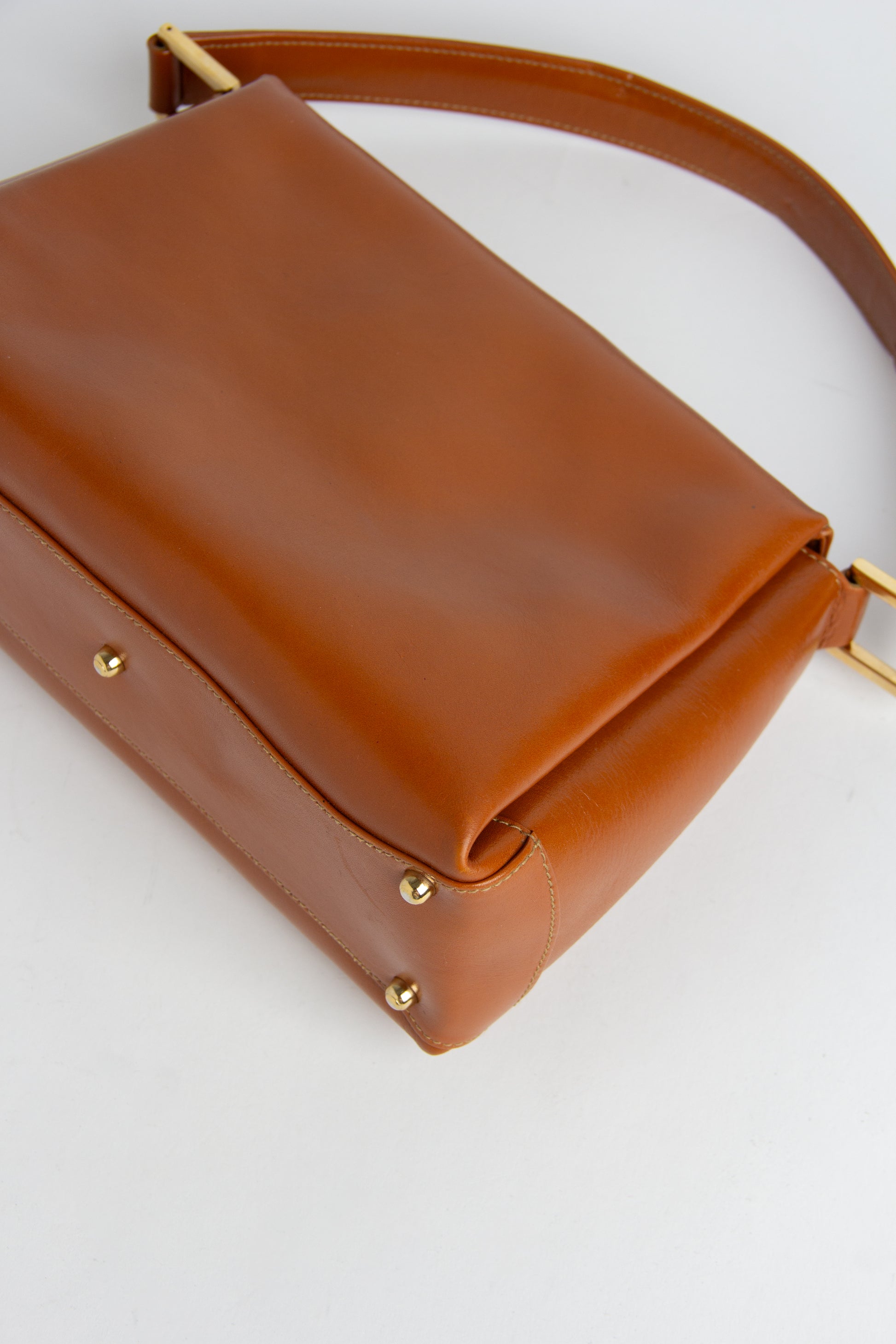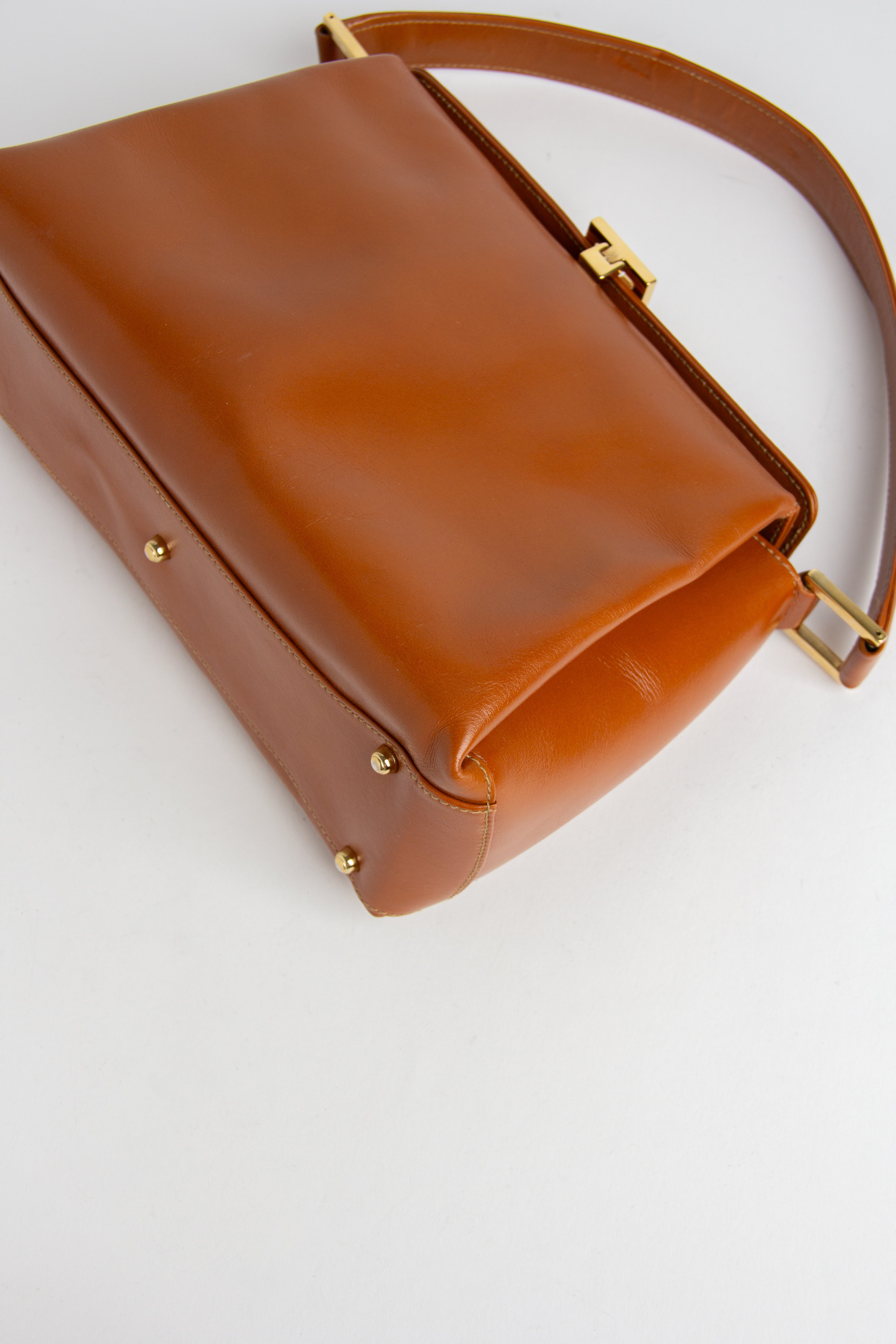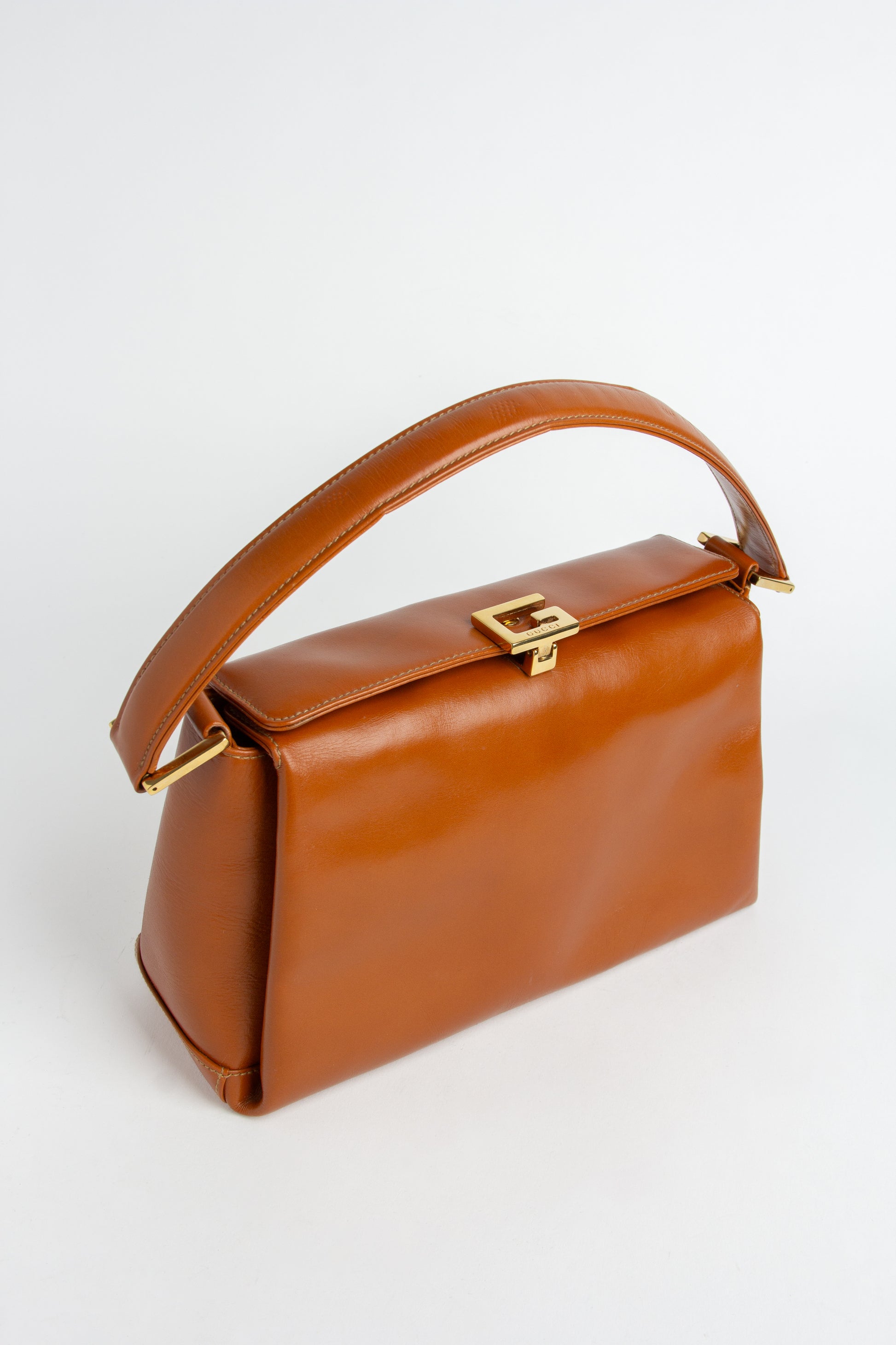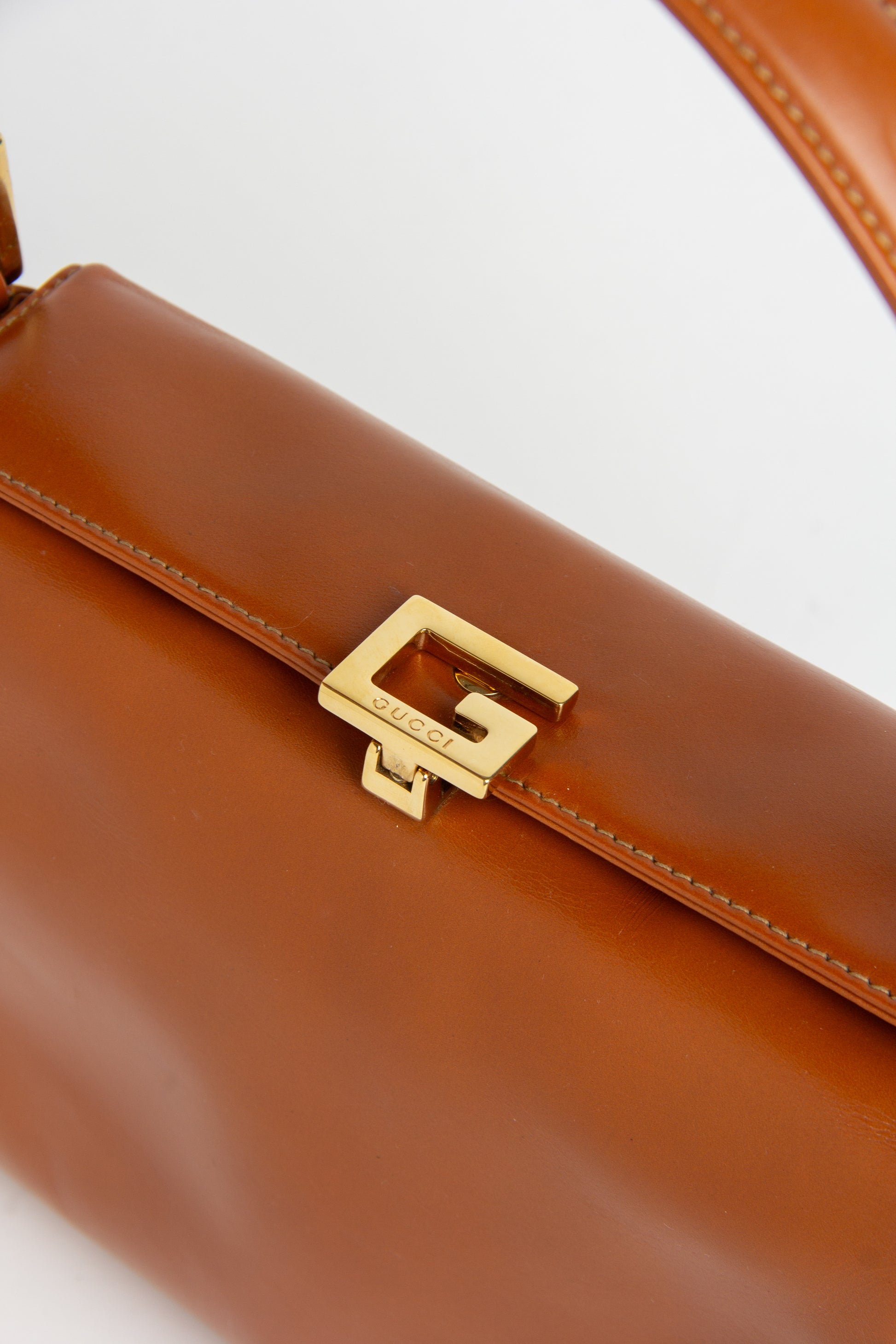 Lovely vintage Gucci saddle brown top handle bag with a gold "G" closure. Minimalist design and a smooth leather exte...