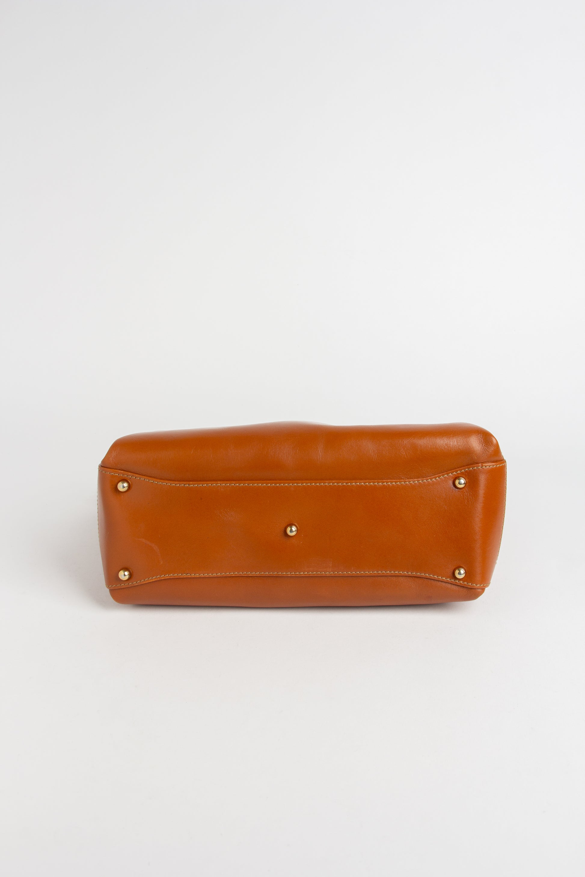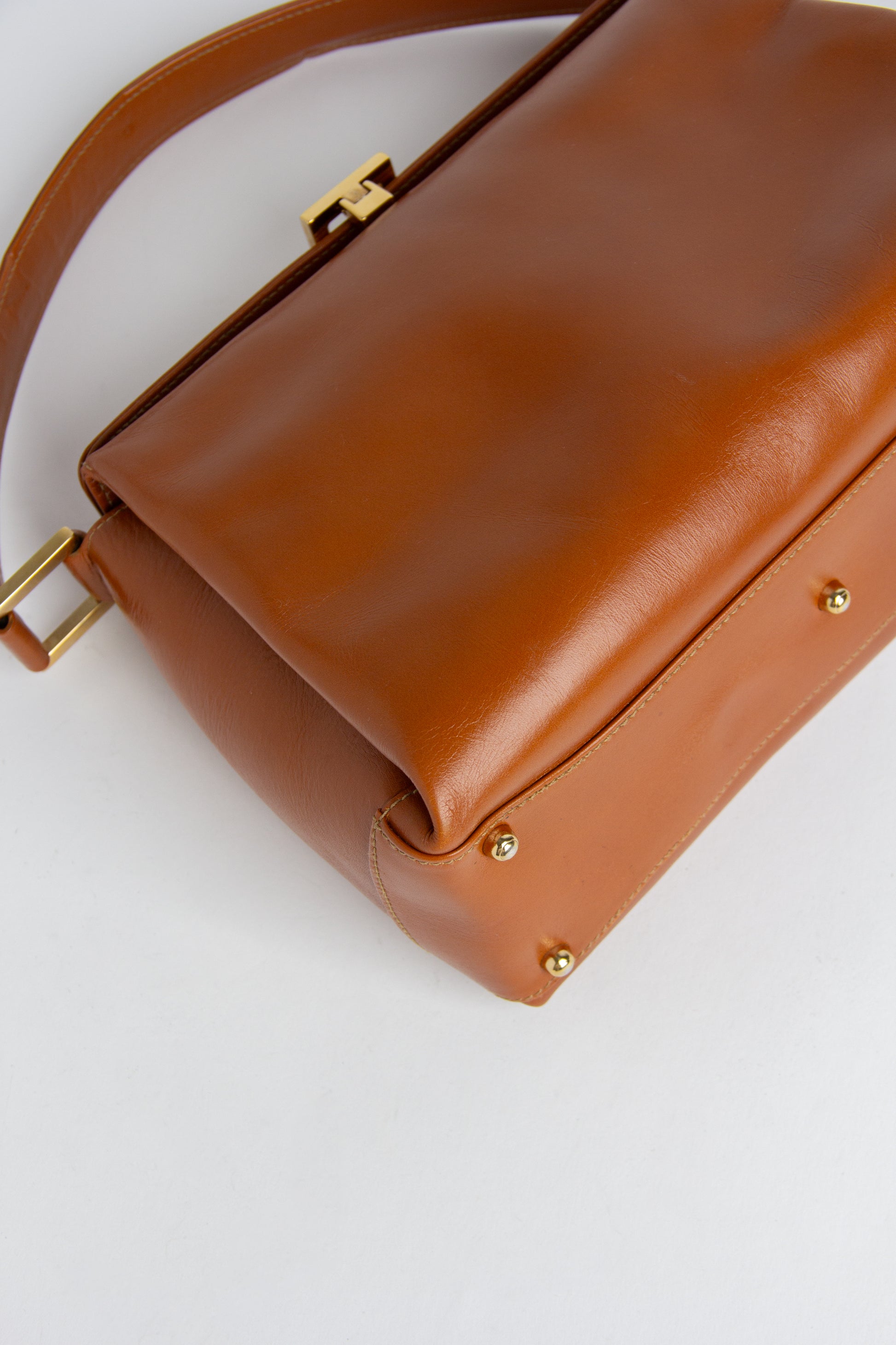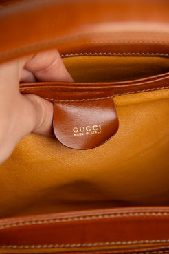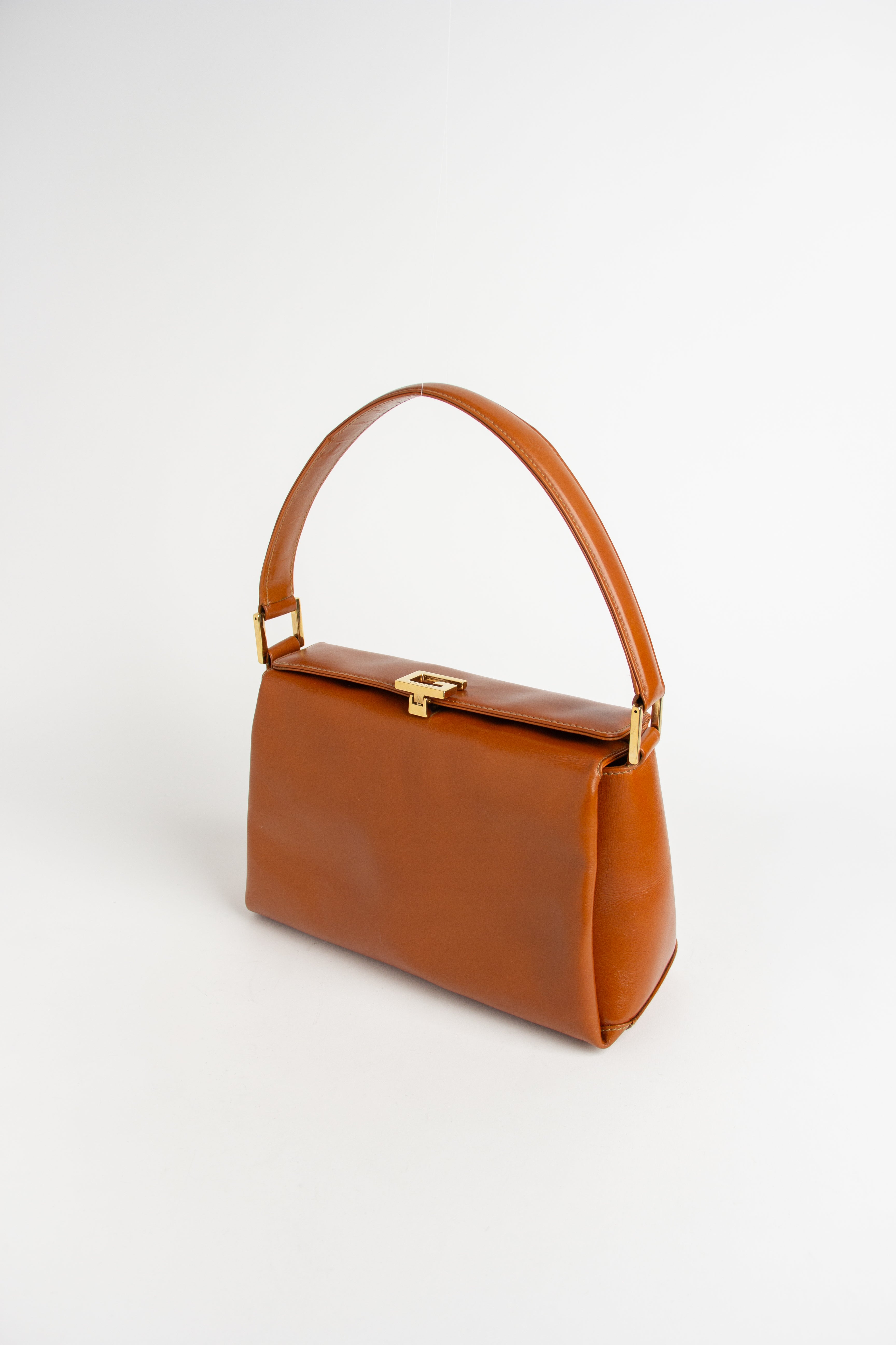 Lovely vintage Gucci saddle brown top handle bag with a gold "G" closure. Minimalist design and a smooth leather exterior. Has three compartments inside for carrying your daily essentials.