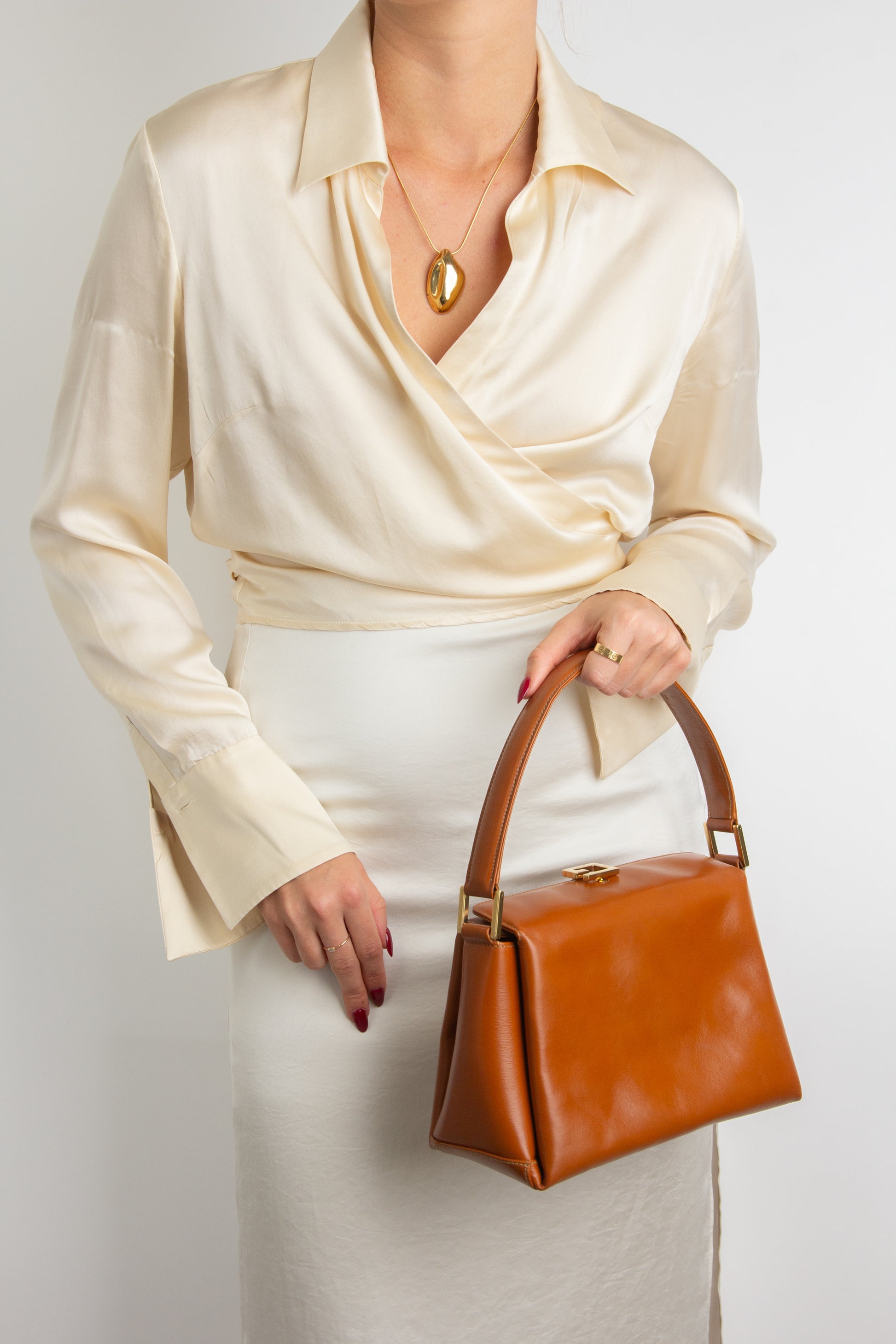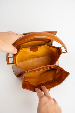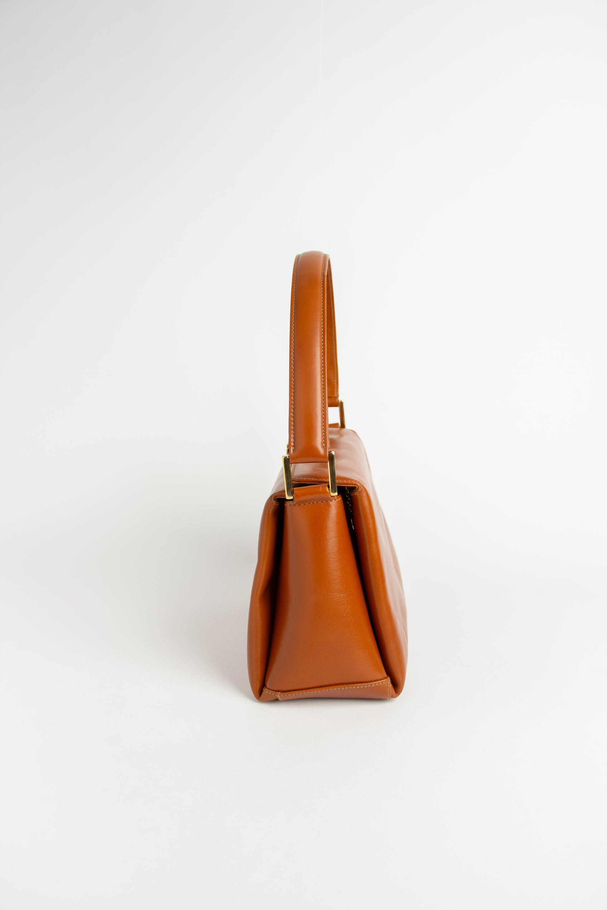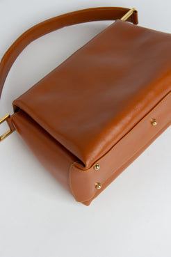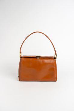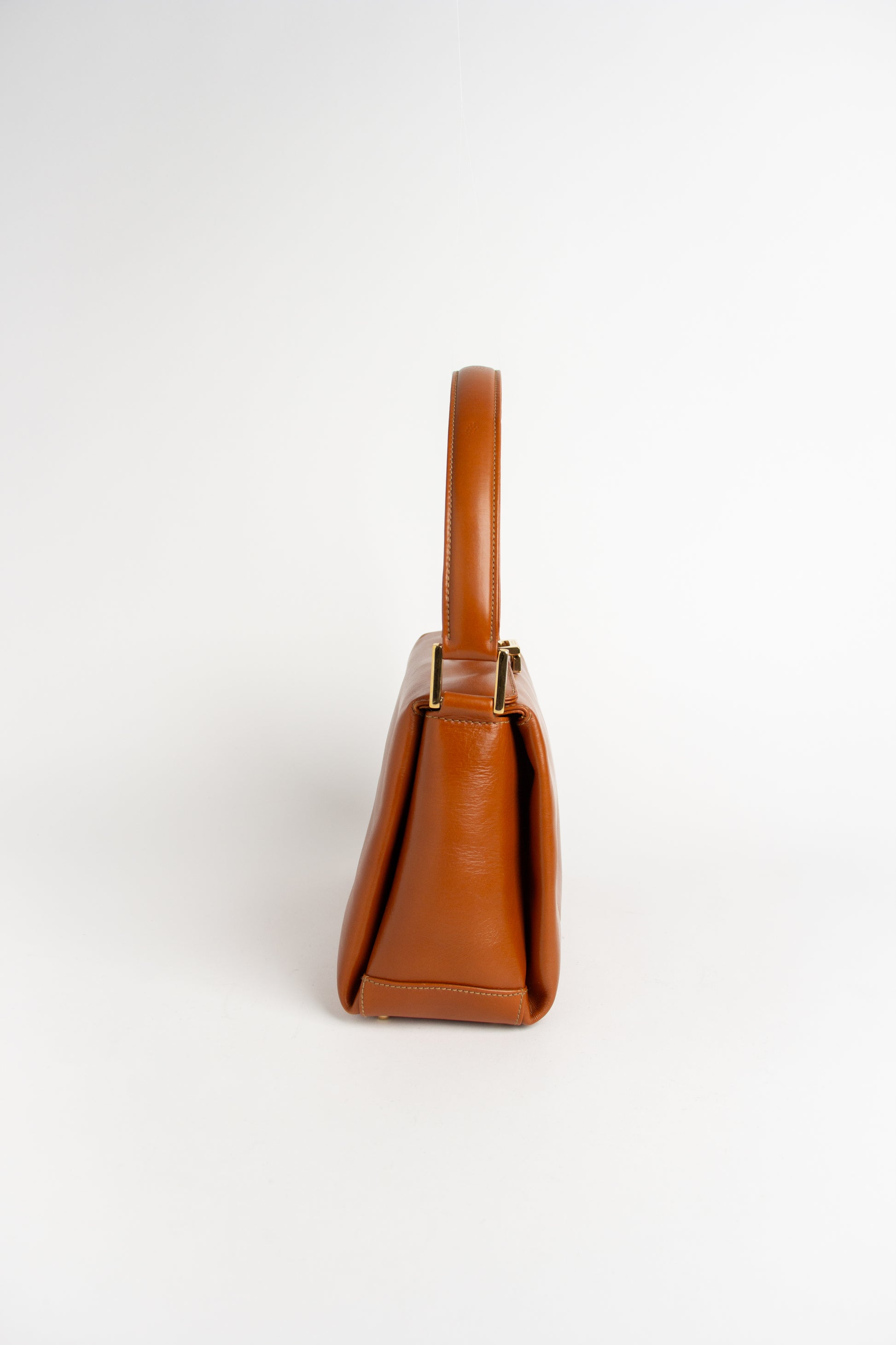 Lovely vintage Gucci saddle brown top handle bag with a gold "G" closure. Minimalist design and a smooth leather exterior. Has three compartments inside for carrying your daily essentials.