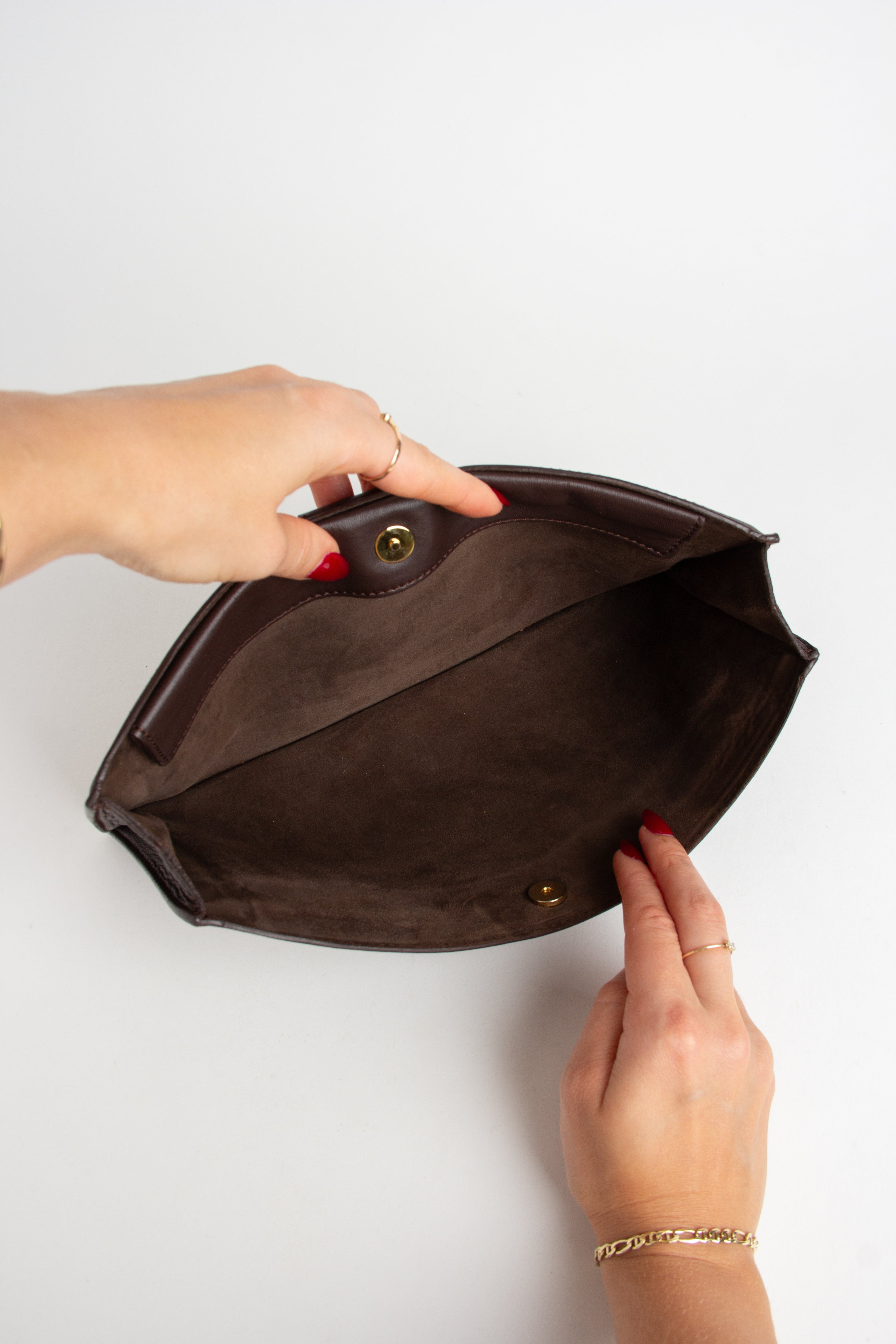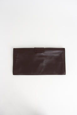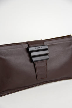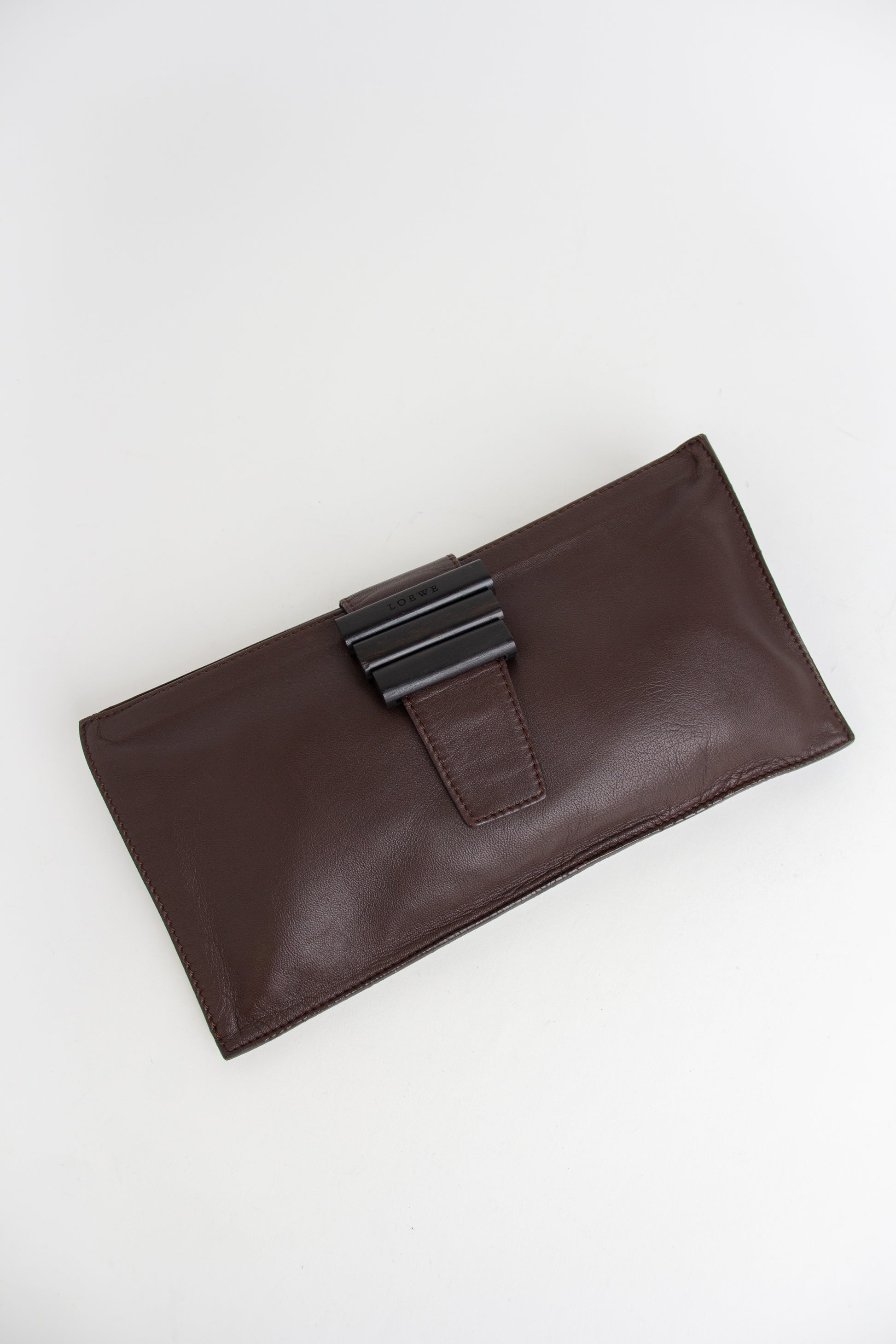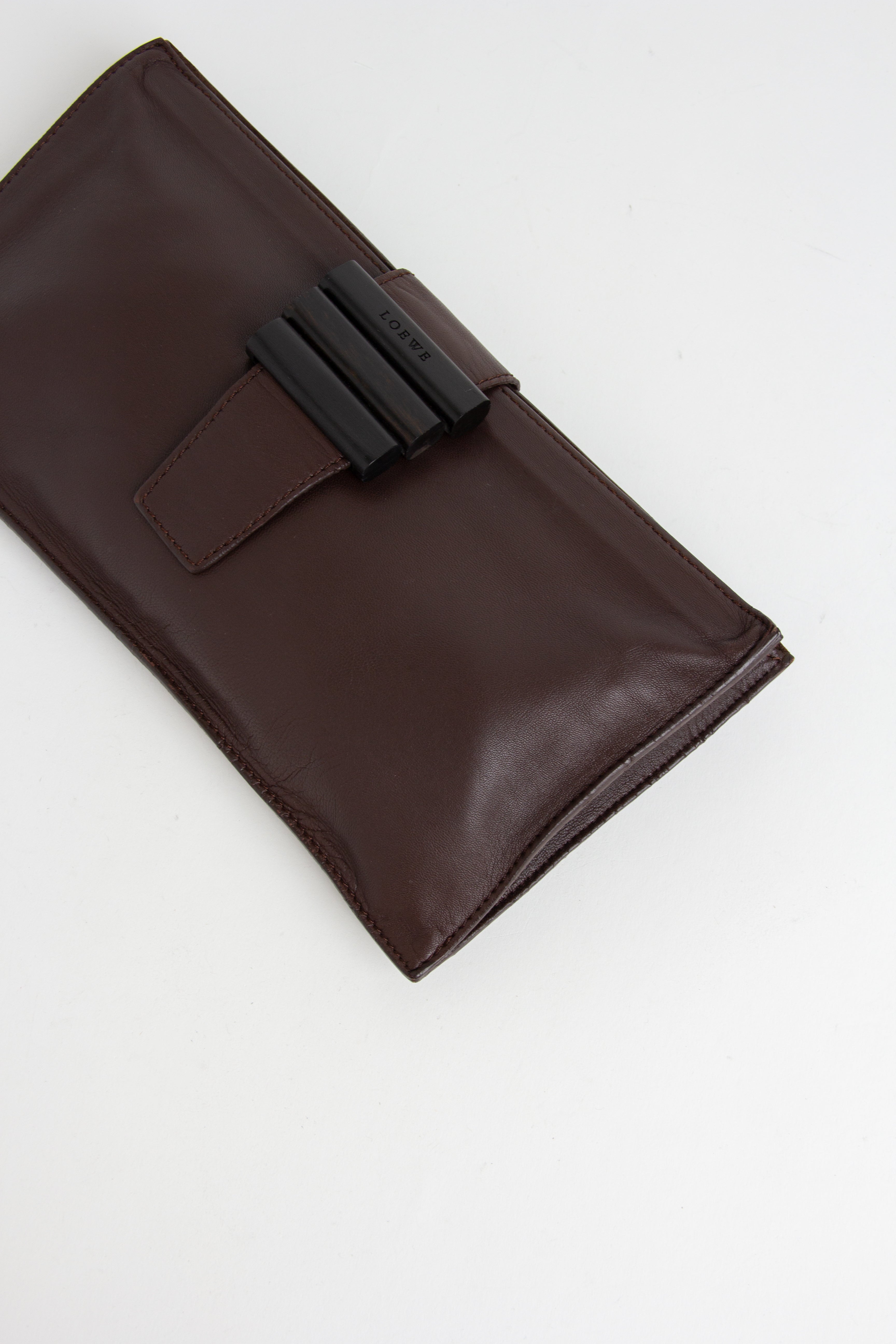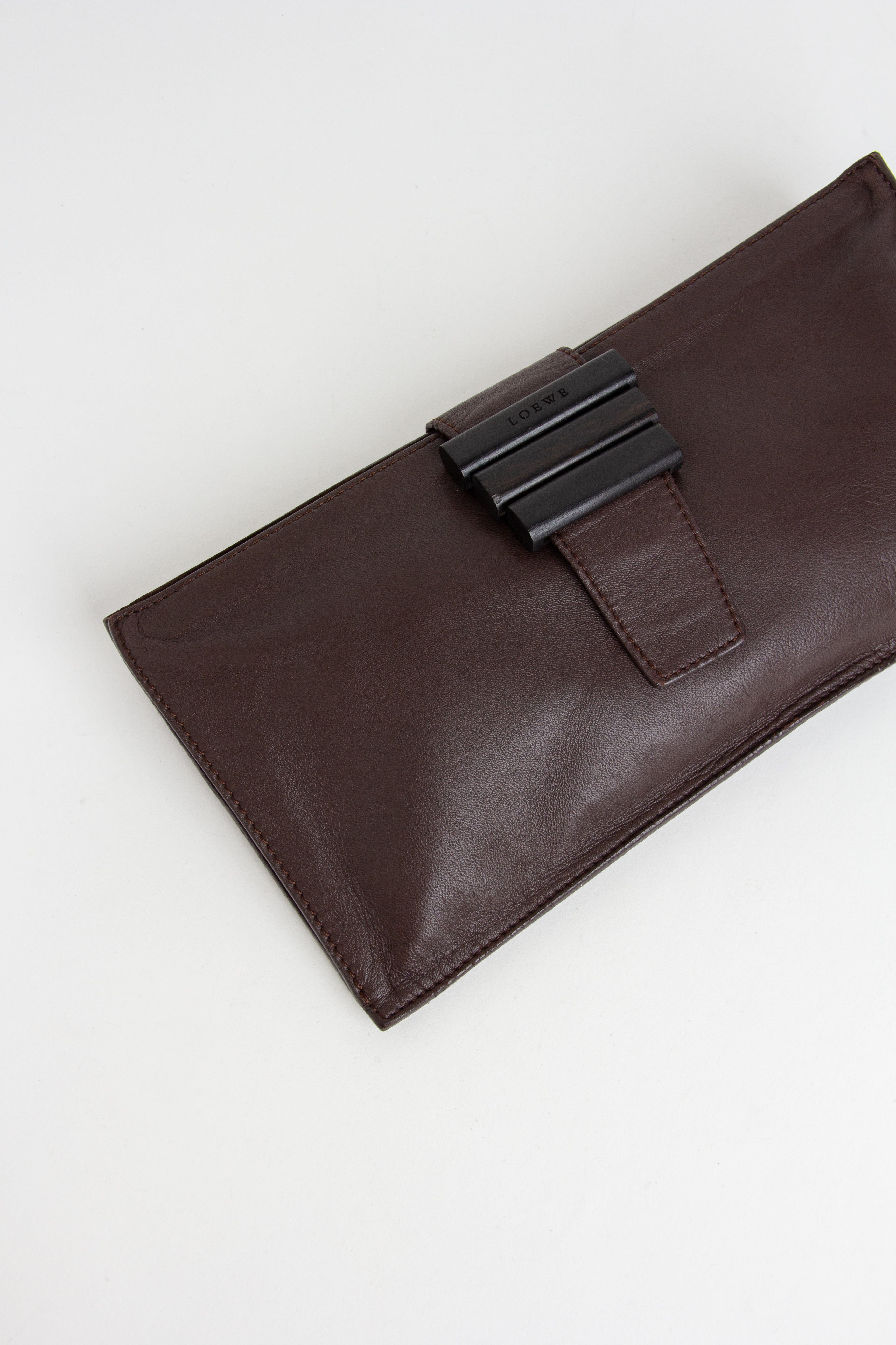 Chic Loewe dark brown buttery smooth leather clutch. Relaxed, unstructured style. Magnetic interior closure with a wooden accent strap that sits over the top. The leather is a super soft nappa style leather. The perfect fall accent piece.