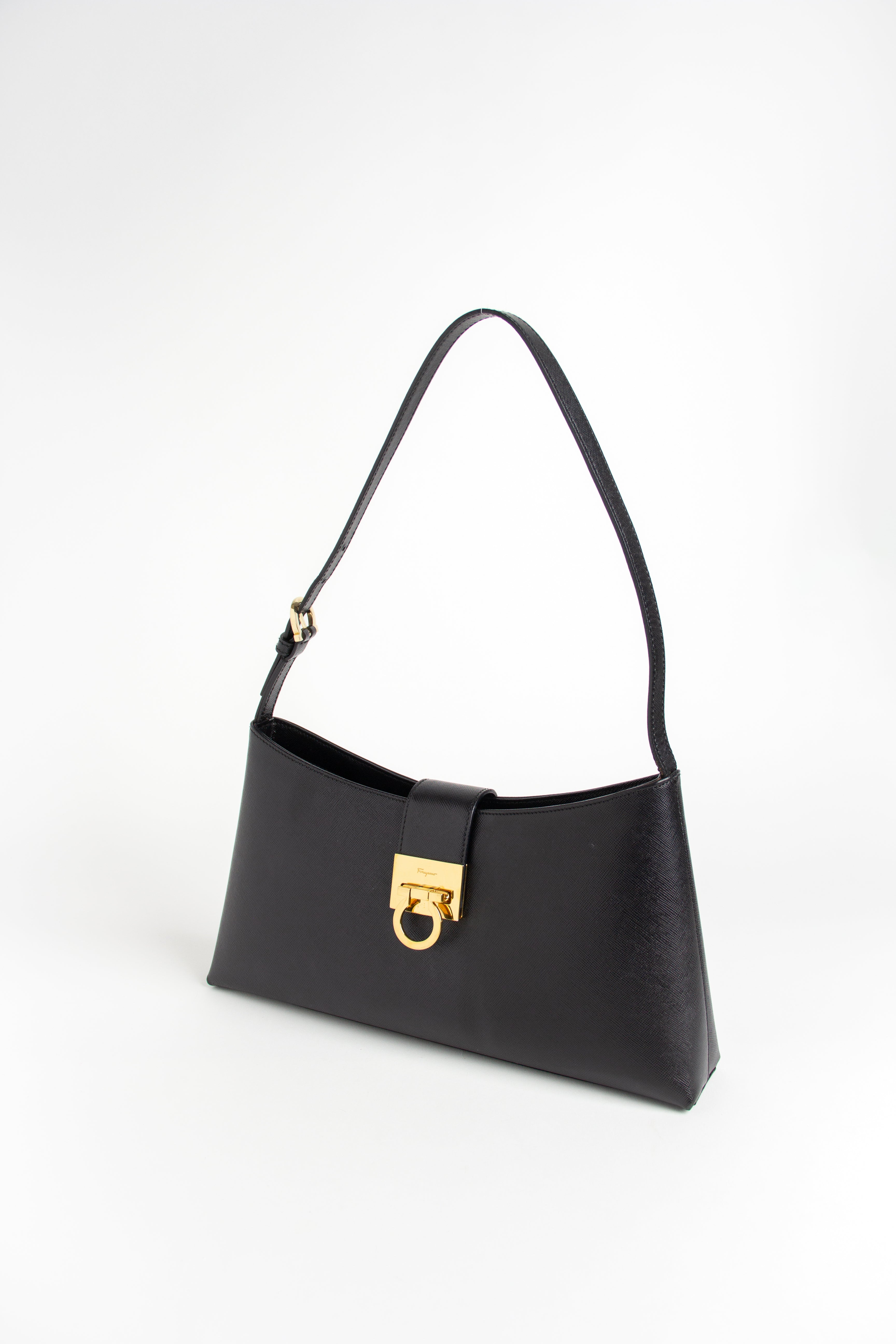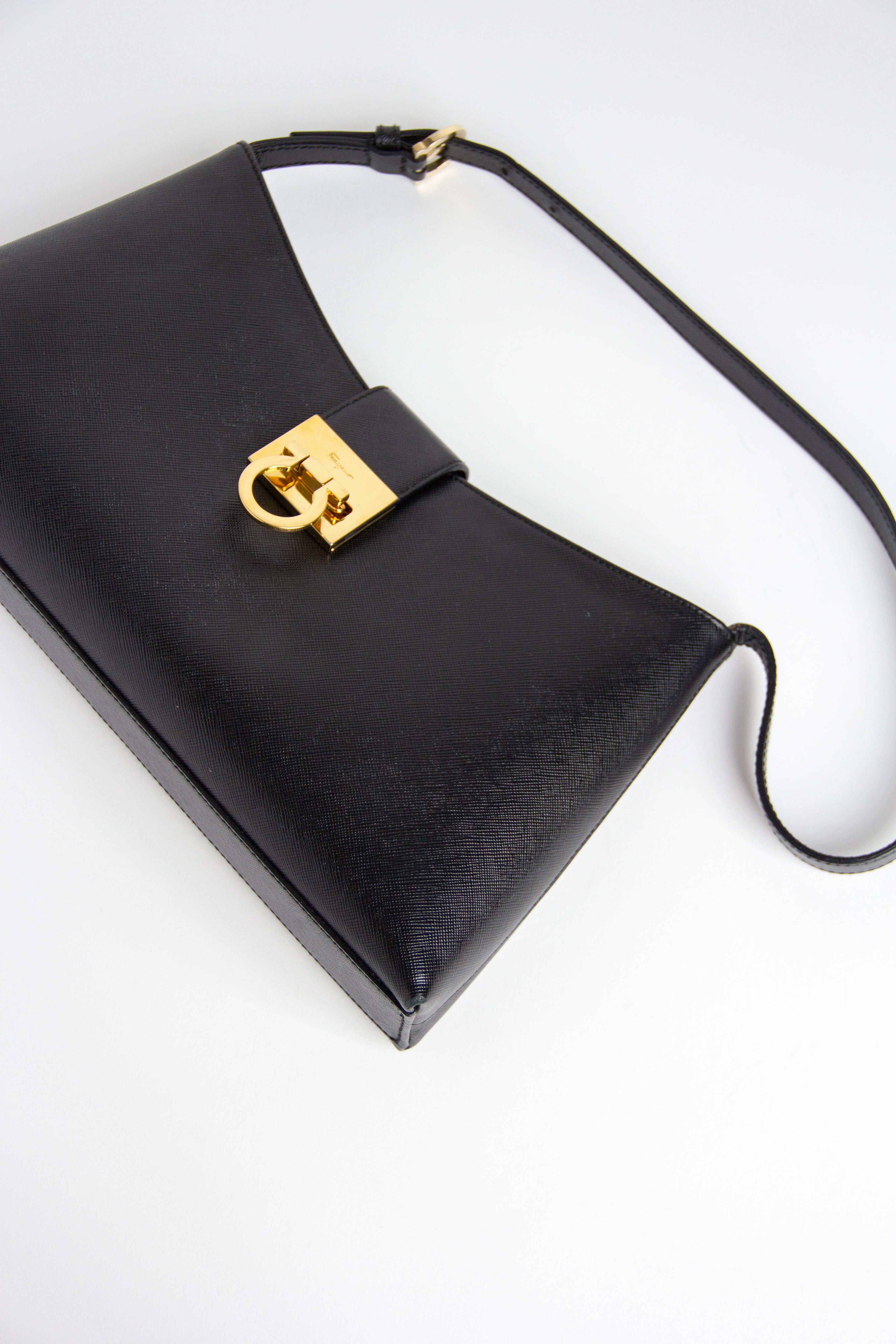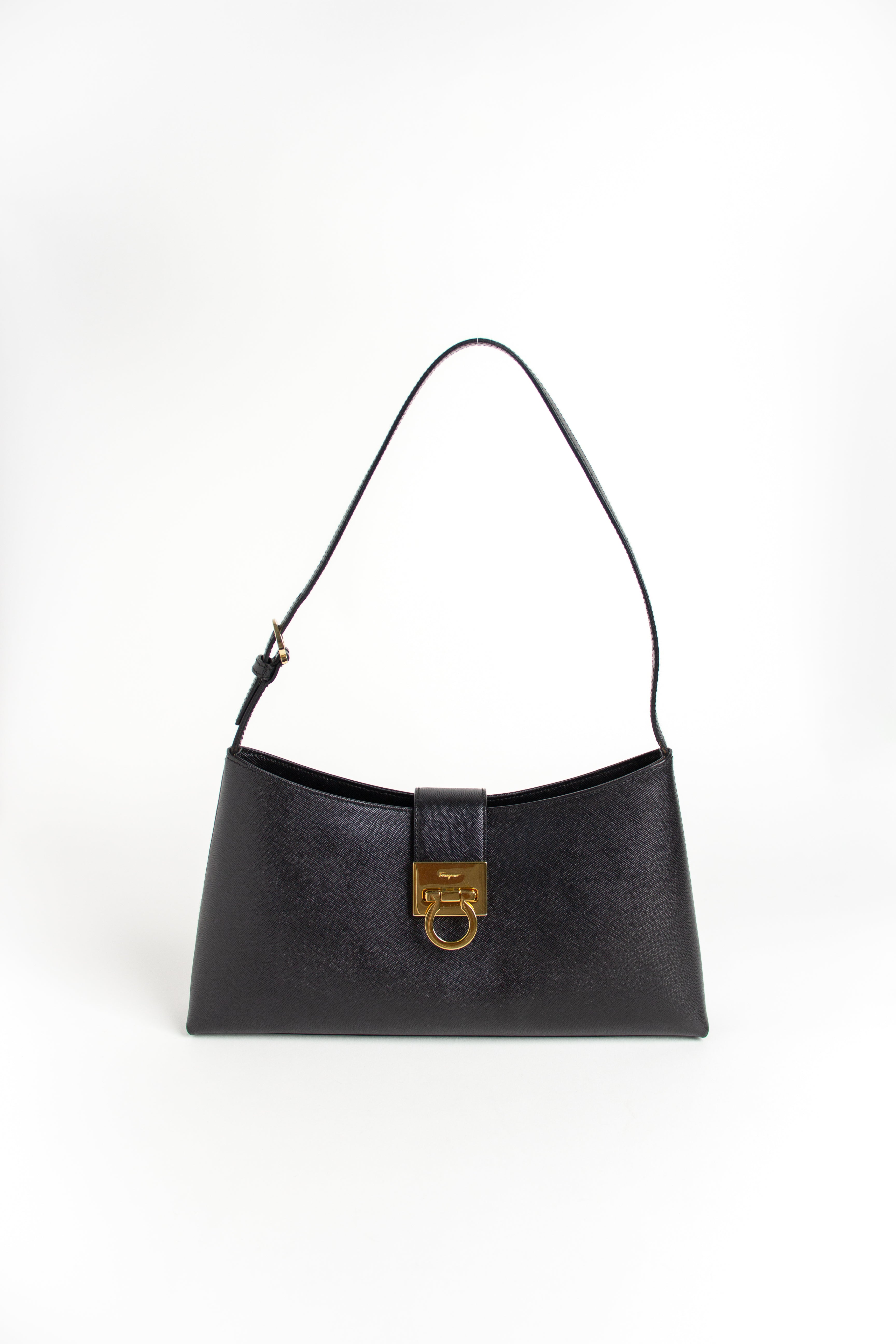 The perfect every day piece– minimalist style Salvatore Ferragamo black saffiano leather shoulder bag. Gold hardware and Gancini enclosure.