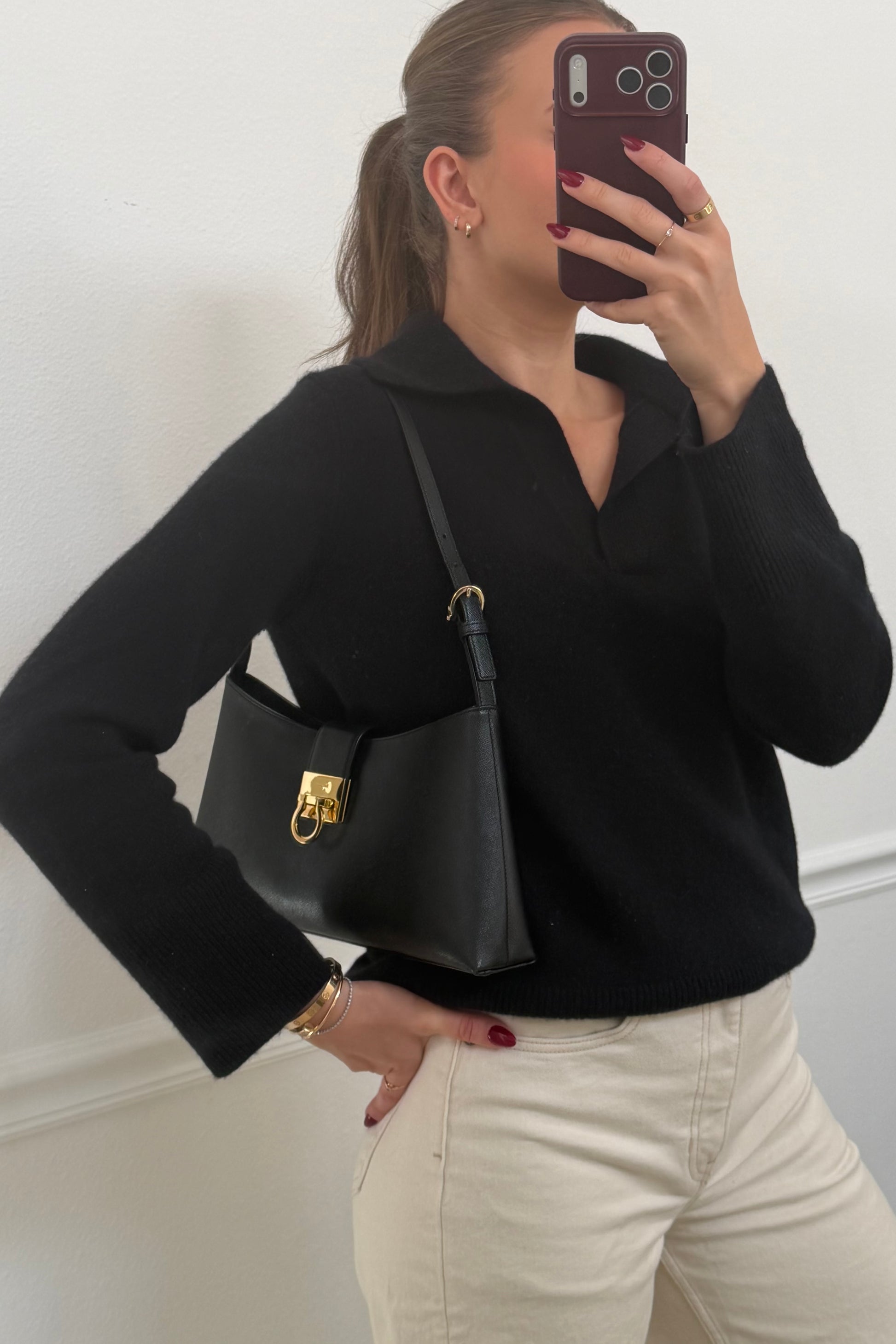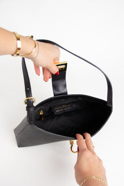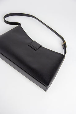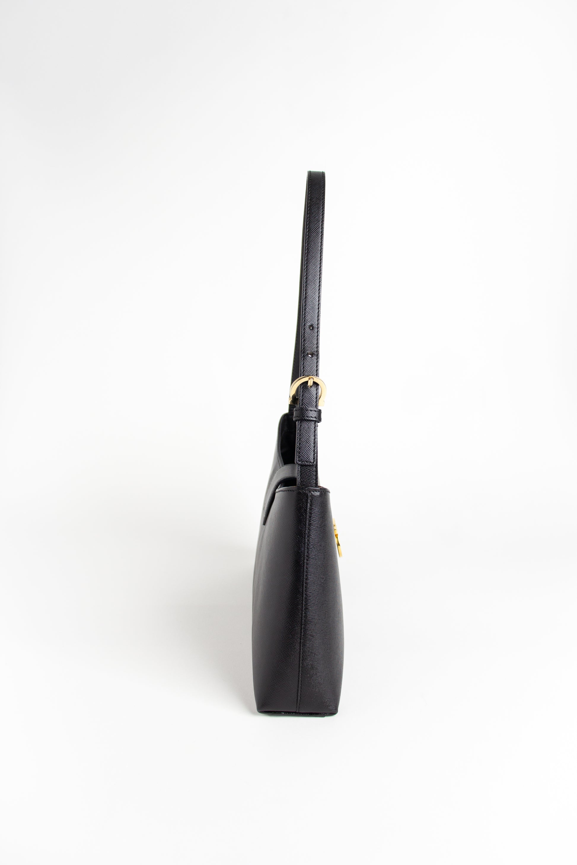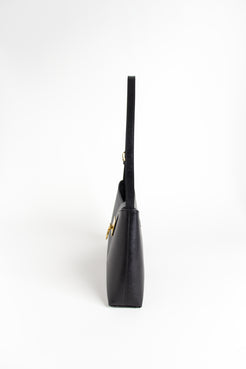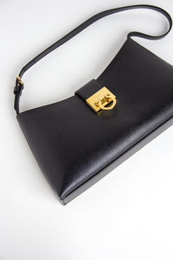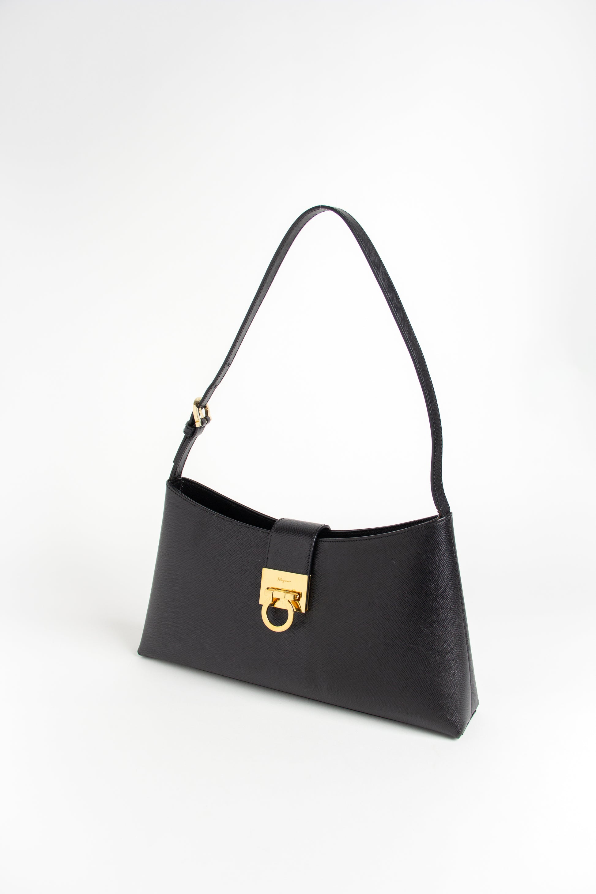 The perfect every day piece– minimalist style Salvatore Ferragamo black saffiano leather shoulder bag. Gold hardware and Gancini enclosure.