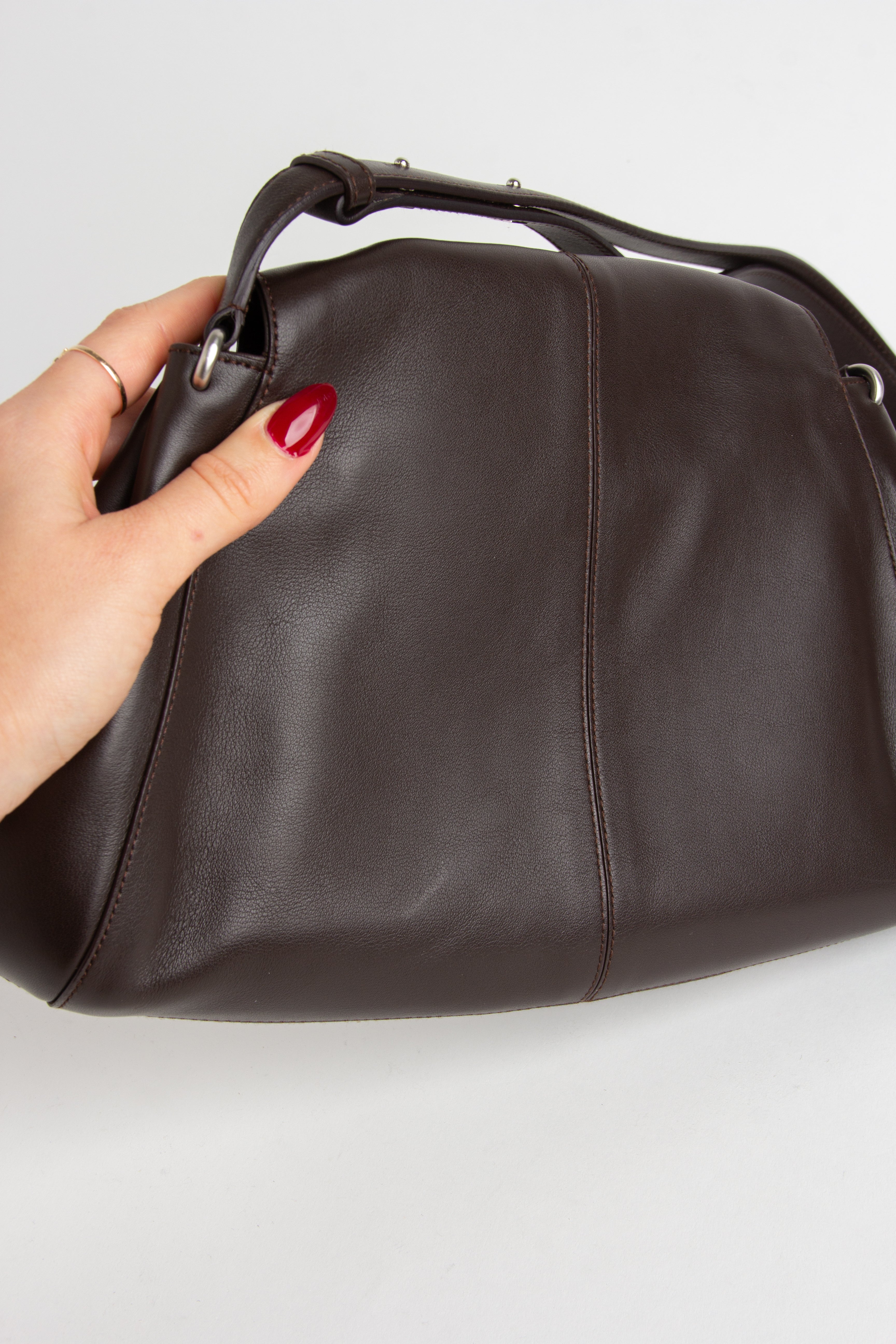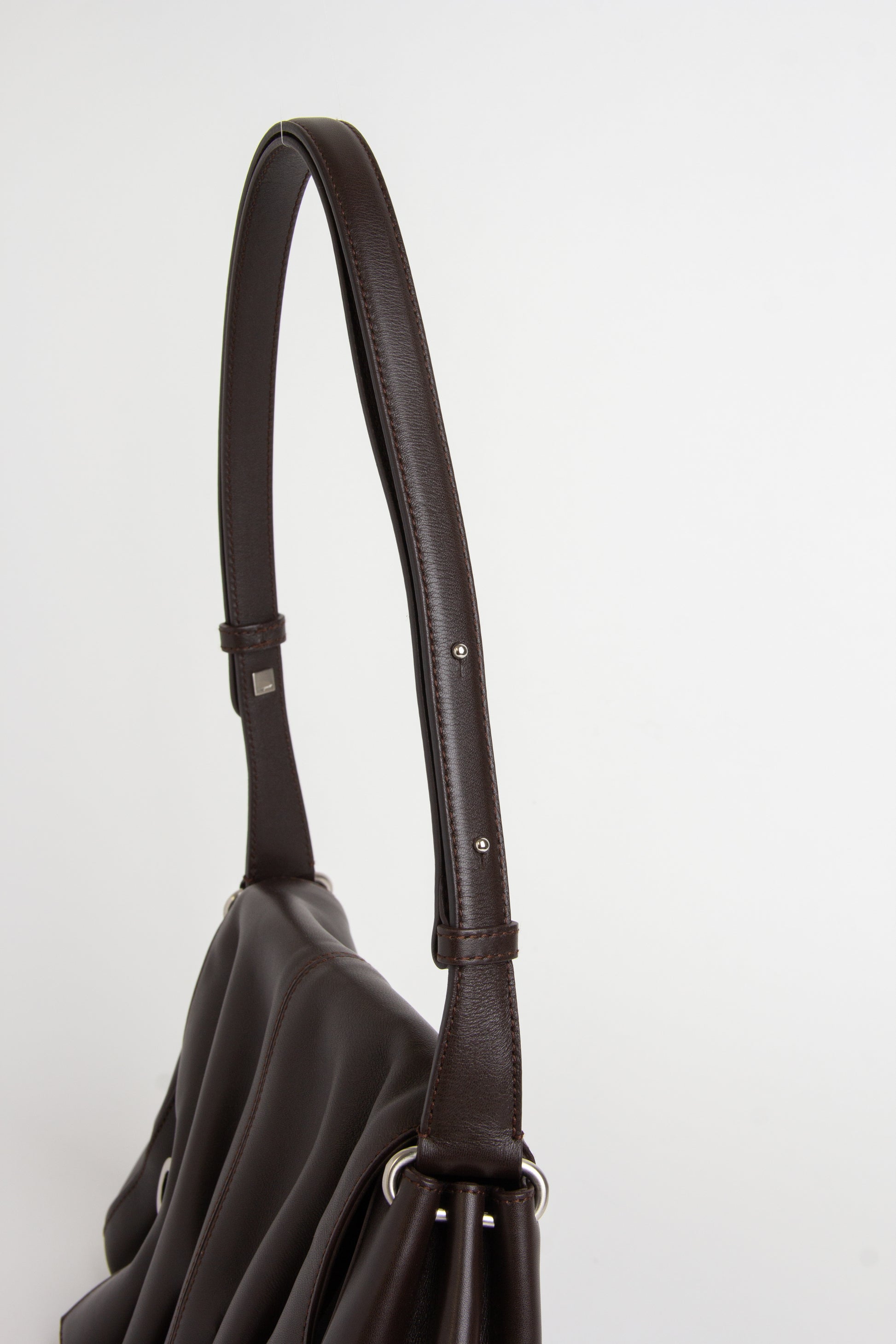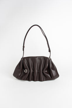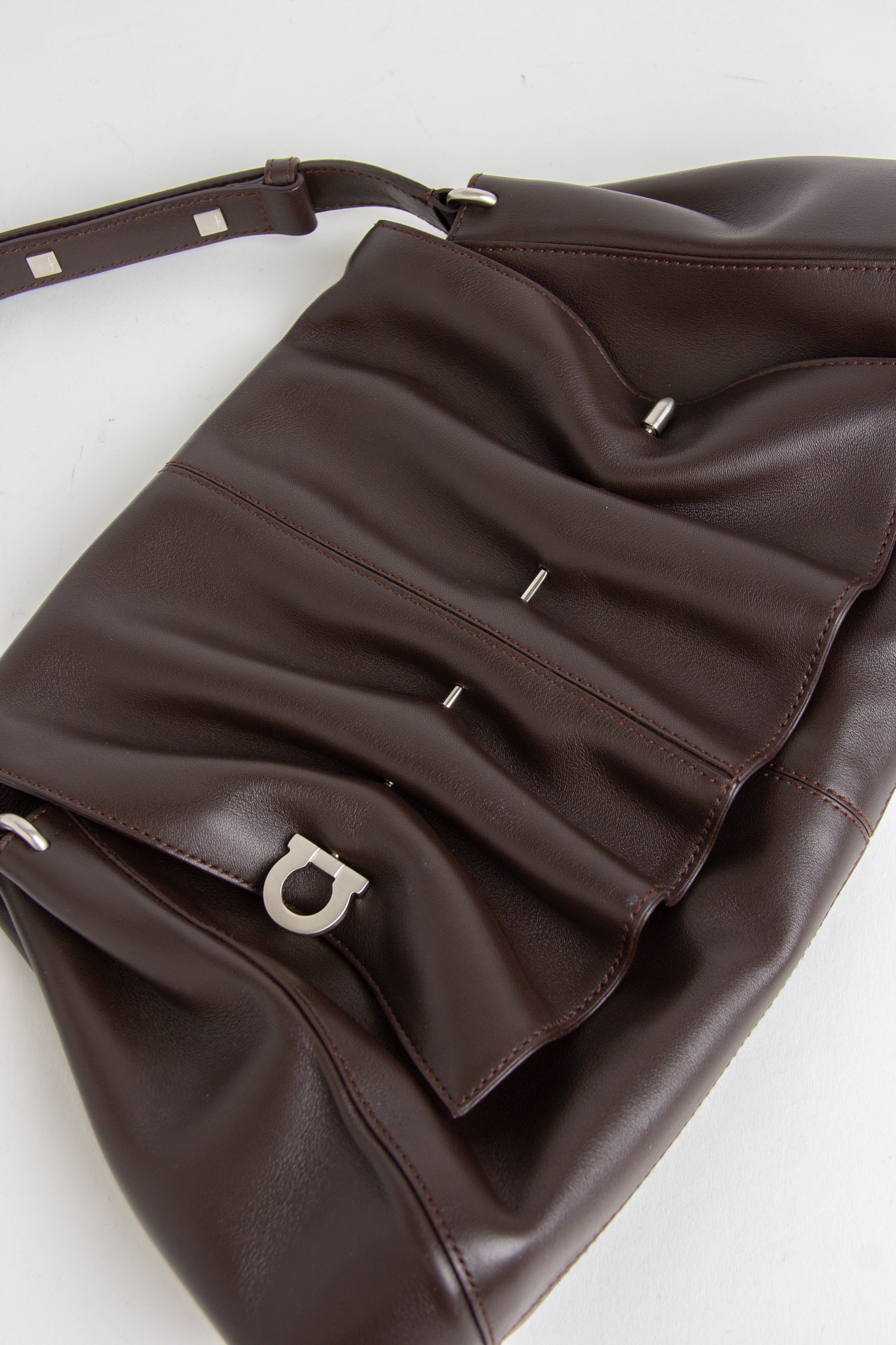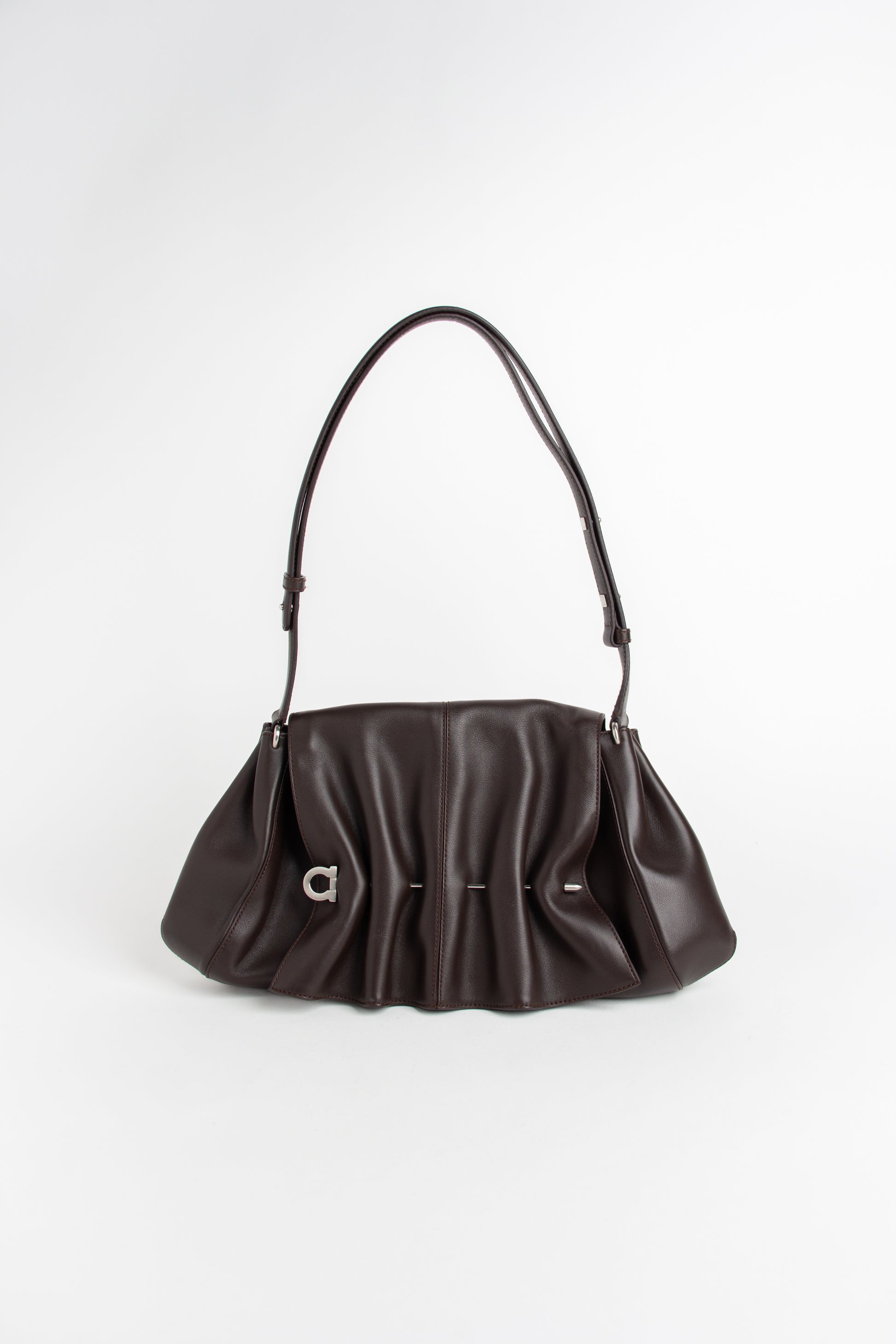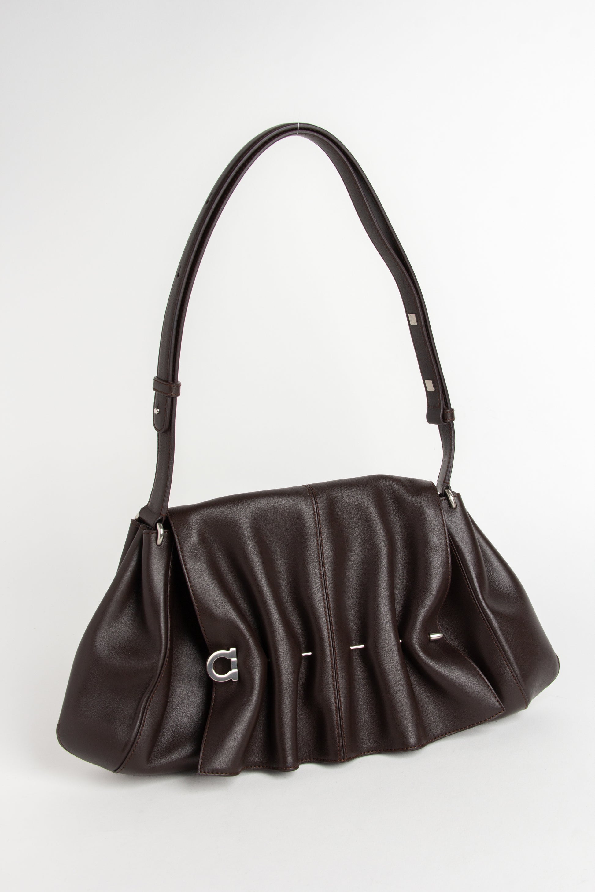 Beautiful, unique Salvatore Ferragamo brown ruched / pleated shoulder bag with a silver Gancini hardware pierced thro...