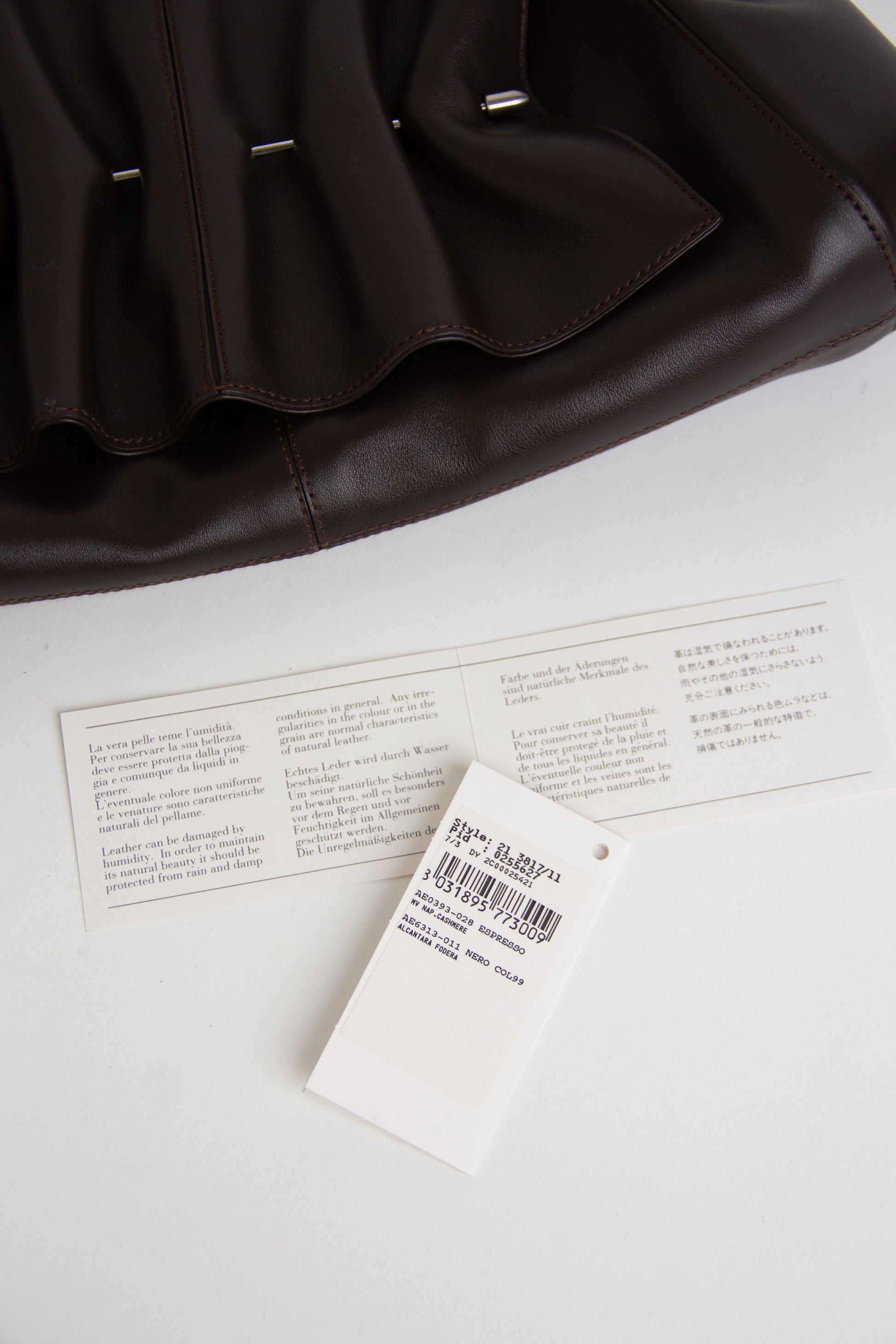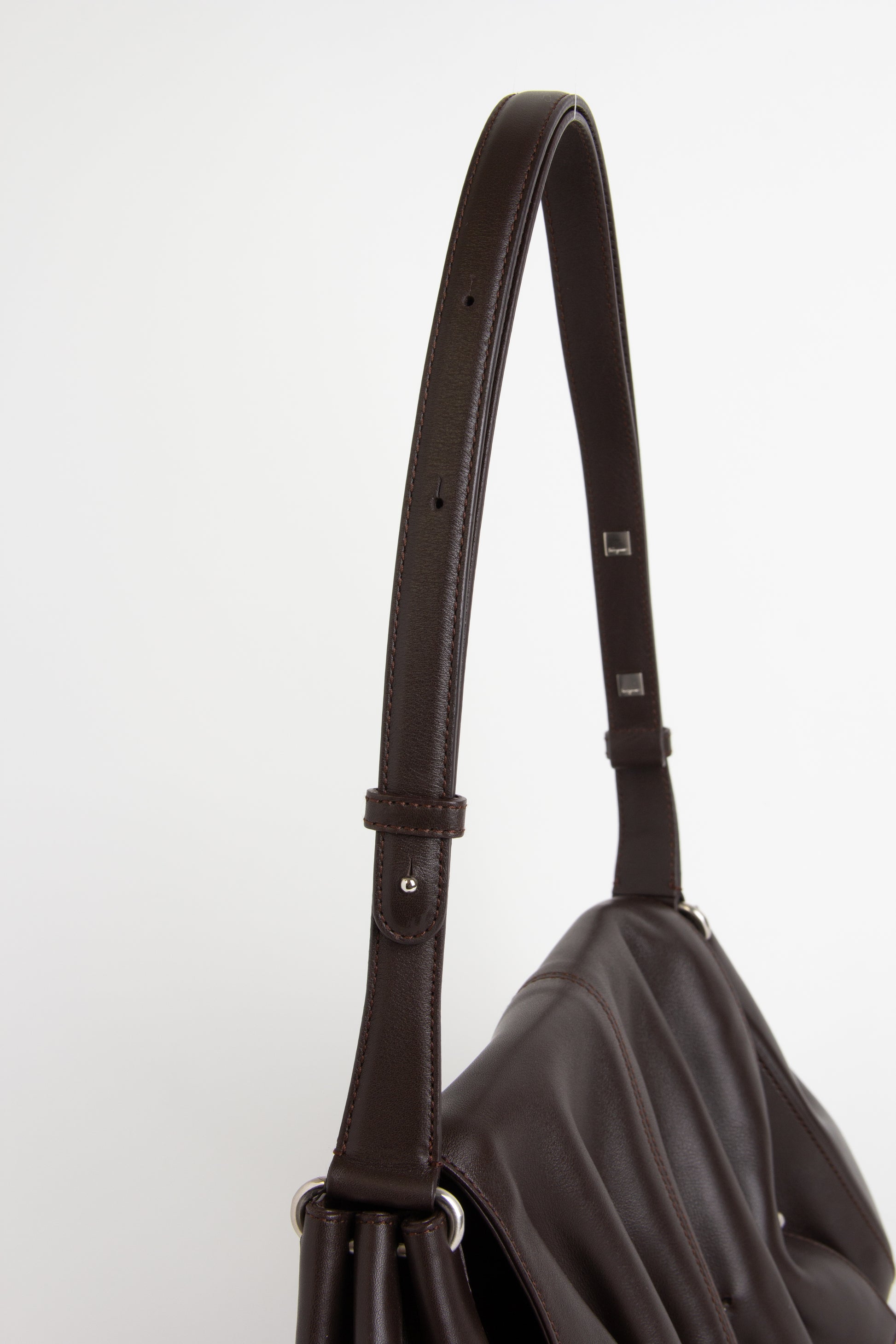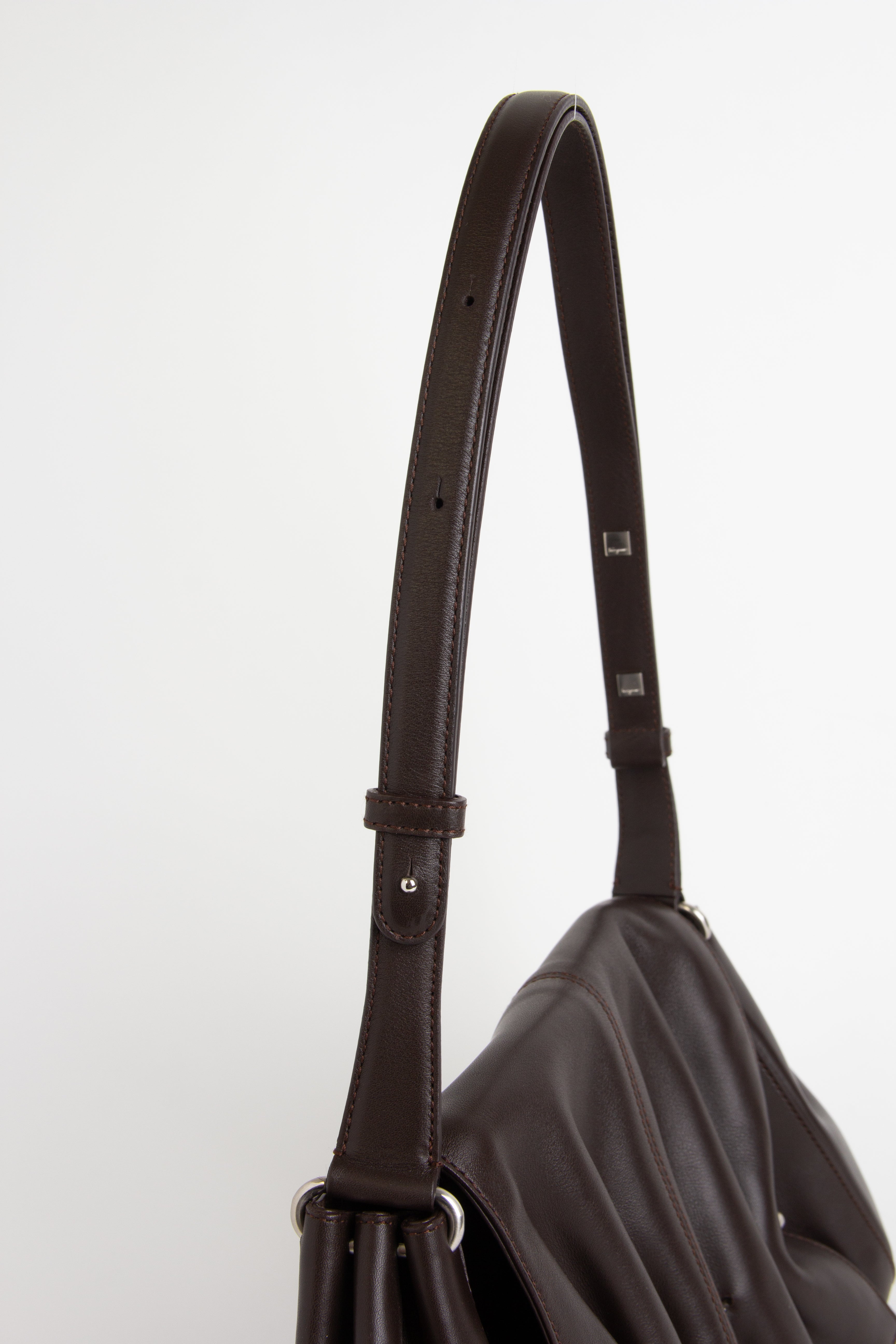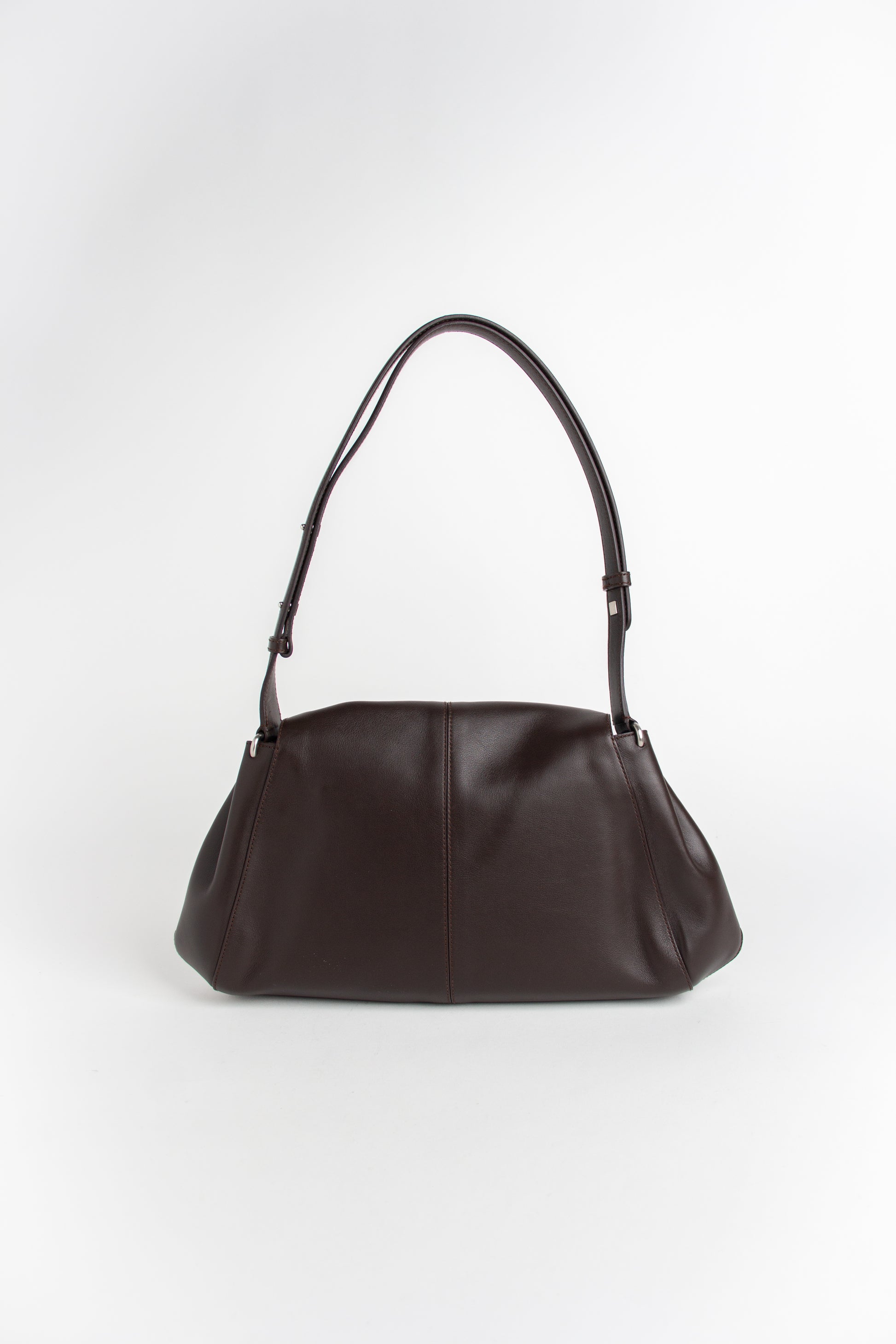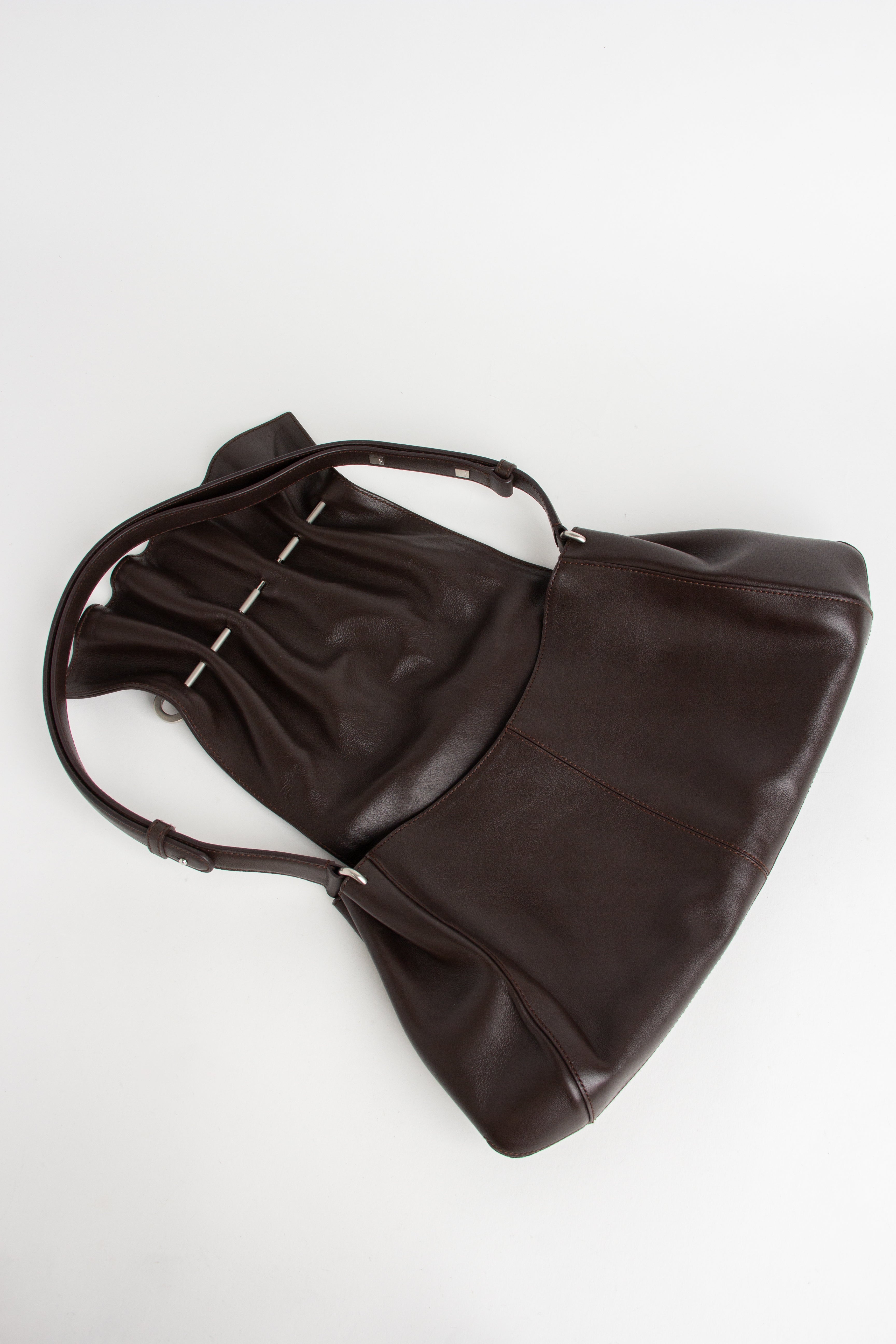 Beautiful, unique Salvatore Ferragamo brown ruched / pleated shoulder bag with a silver Gancini hardware pierced thro...