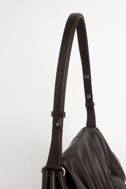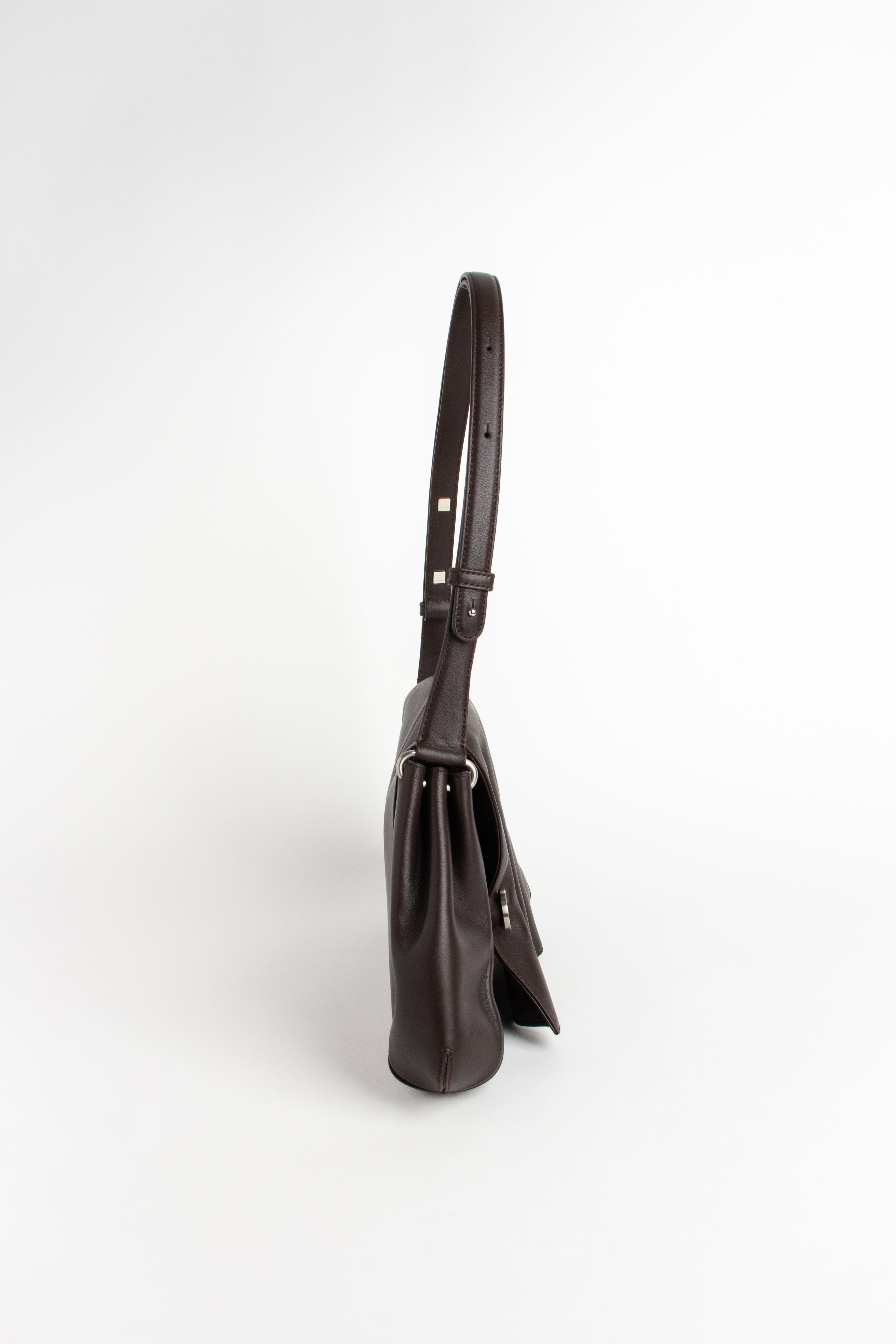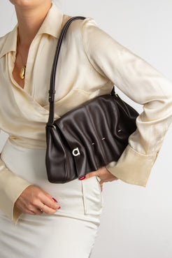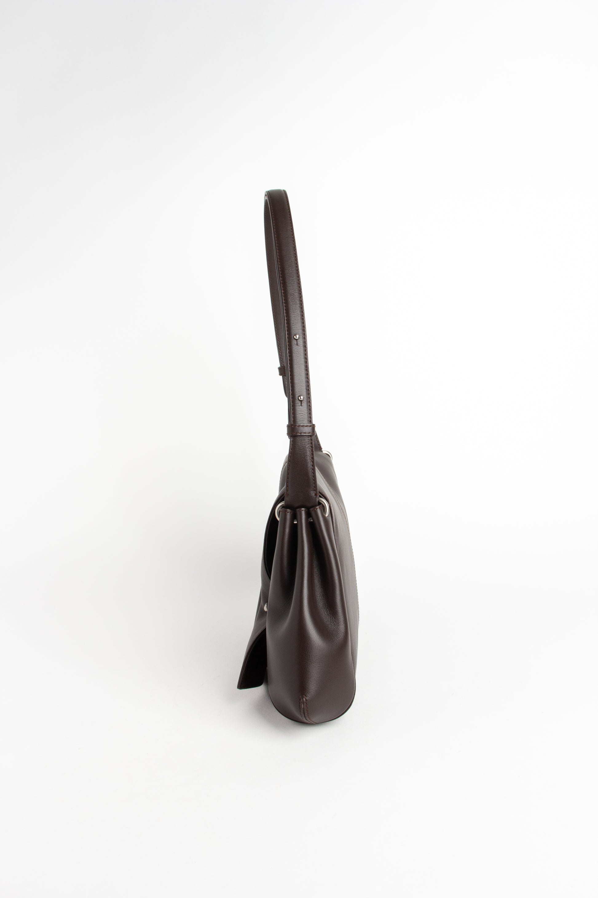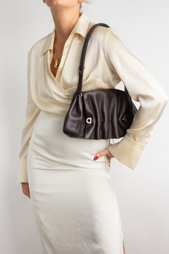 Beautiful, unique Salvatore Ferragamo brown ruched / pleated shoulder bag with a silver Gancini hardware pierced through the front. The perfect chocolate brown for fall.